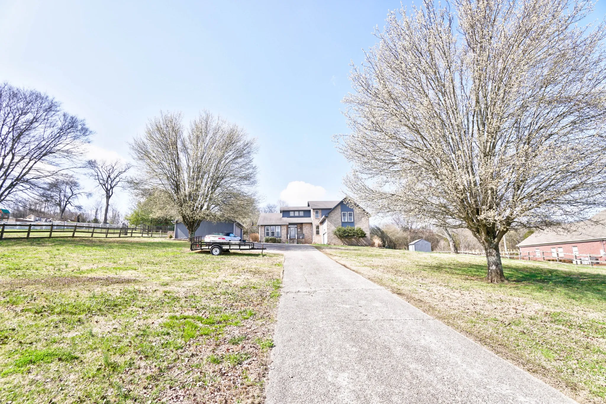 Great location close to shopping, restaurants and I-24! Home sits on just over 2 fenced acres with gated entry. Two bedrooms on main floor and two up with bonus. Fresh paint, high ceilings, stone fp & open living, kitchen & sunroom area. Enjoy the outdoors with the covered back porch, saltwater pool & hot tub. Need room to store or park vehicles? Plenty of room with your 4 car garage options! *Home perked for 4BR but office could be used as 5th BR if needed.