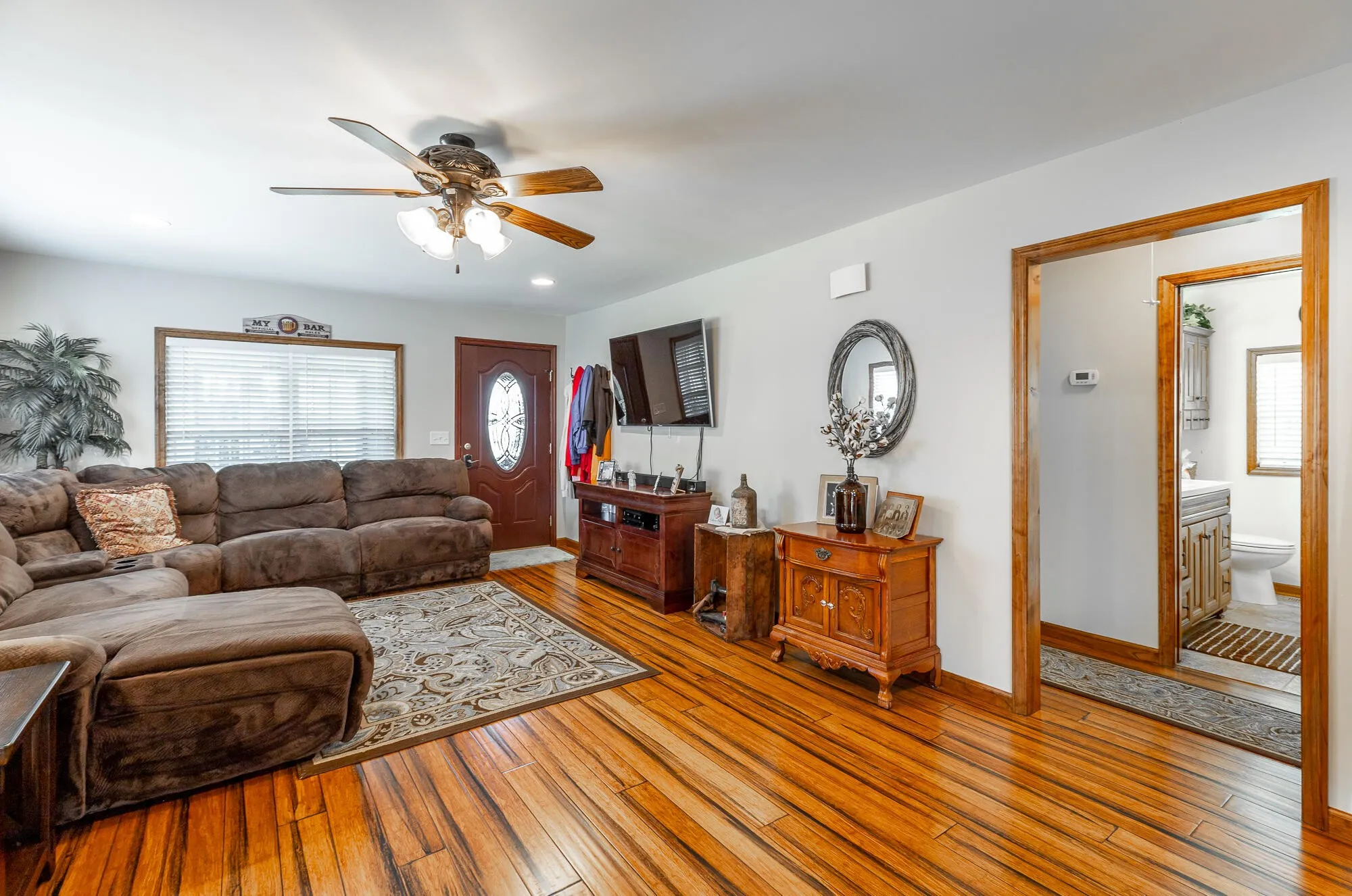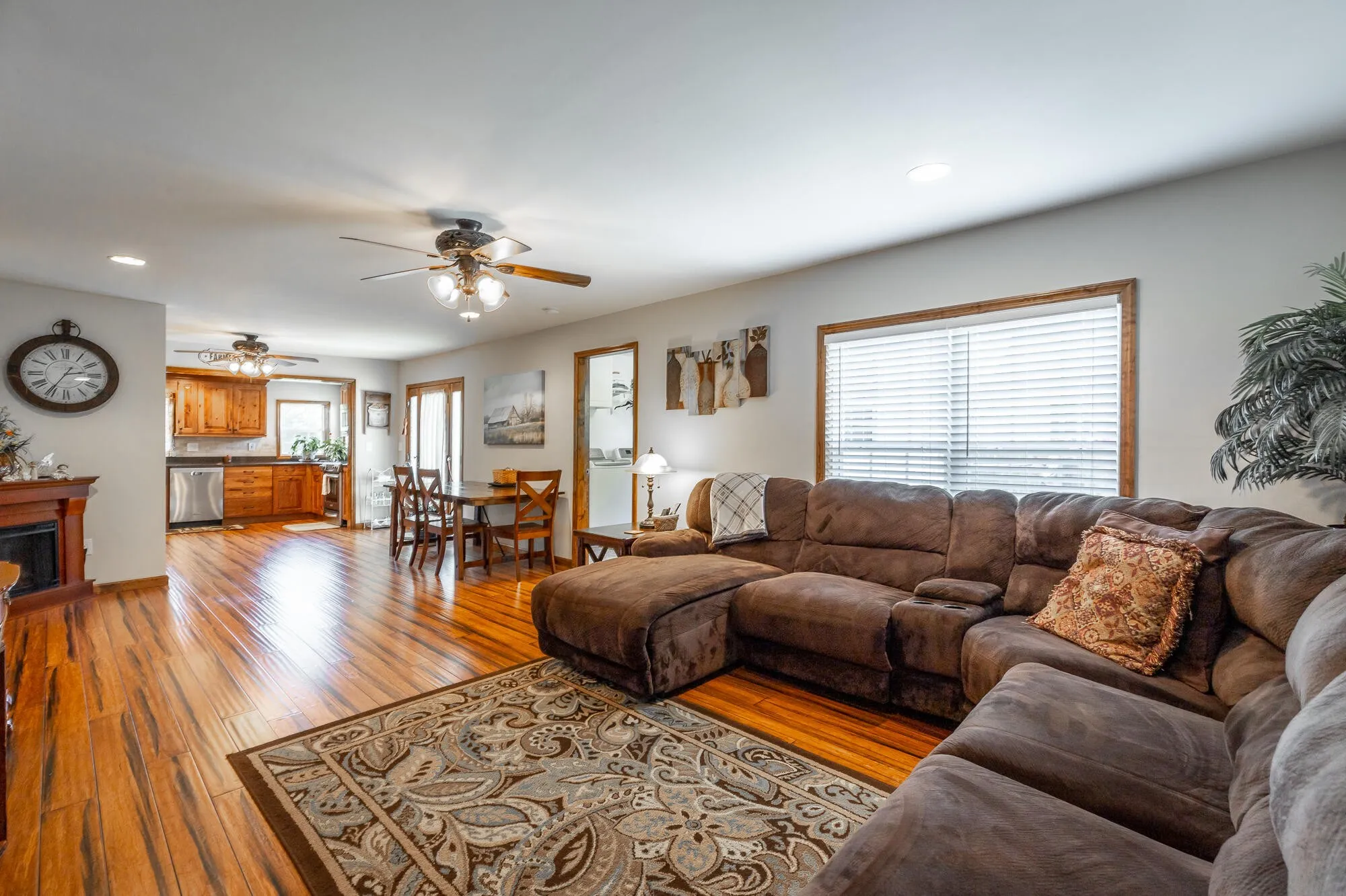 As you enter the home, you’ll be greeted by an open-concept living space that’s perfect for entertaining. The living room is bright and spacious, with plenty of natural light streaming in from the windows. The kitchen features modern appliances and ample counter space, making meal preparation a breeze.