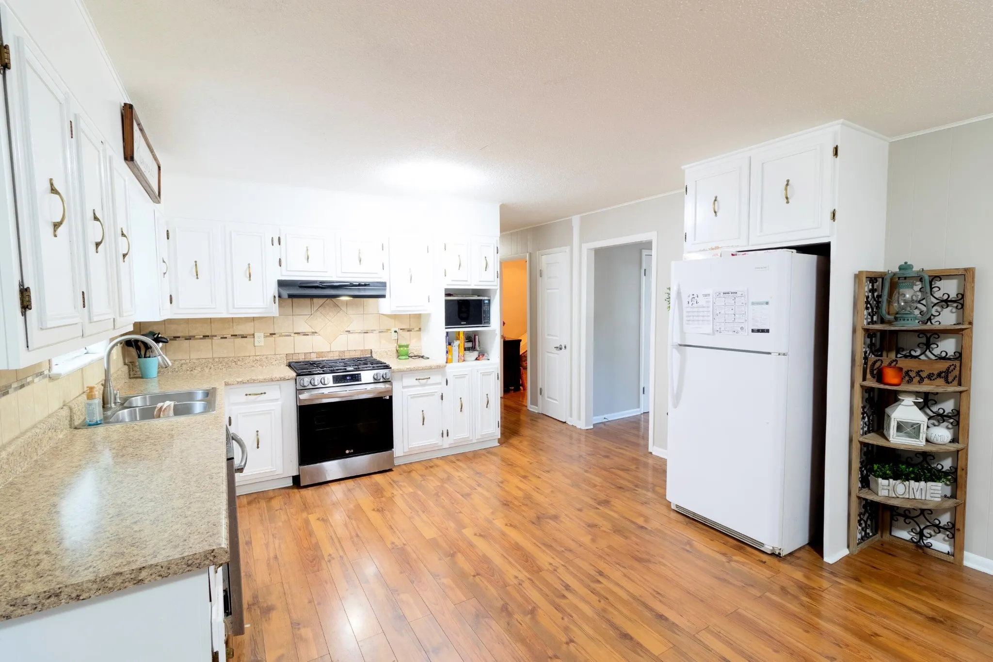 Down the hallway from the kitchen is a full bathroom with a large vanity and a tub/shower combo, and two more bedrooms. The primary bedroom with an en suite are at the end of the hall. Outside is a truly expansive, fully fenced backyard with plenty of room for kids to play, to plant a garden, install a fire pit, and host gatherings. The outdoor space even comes with a built in horseshoe pit!