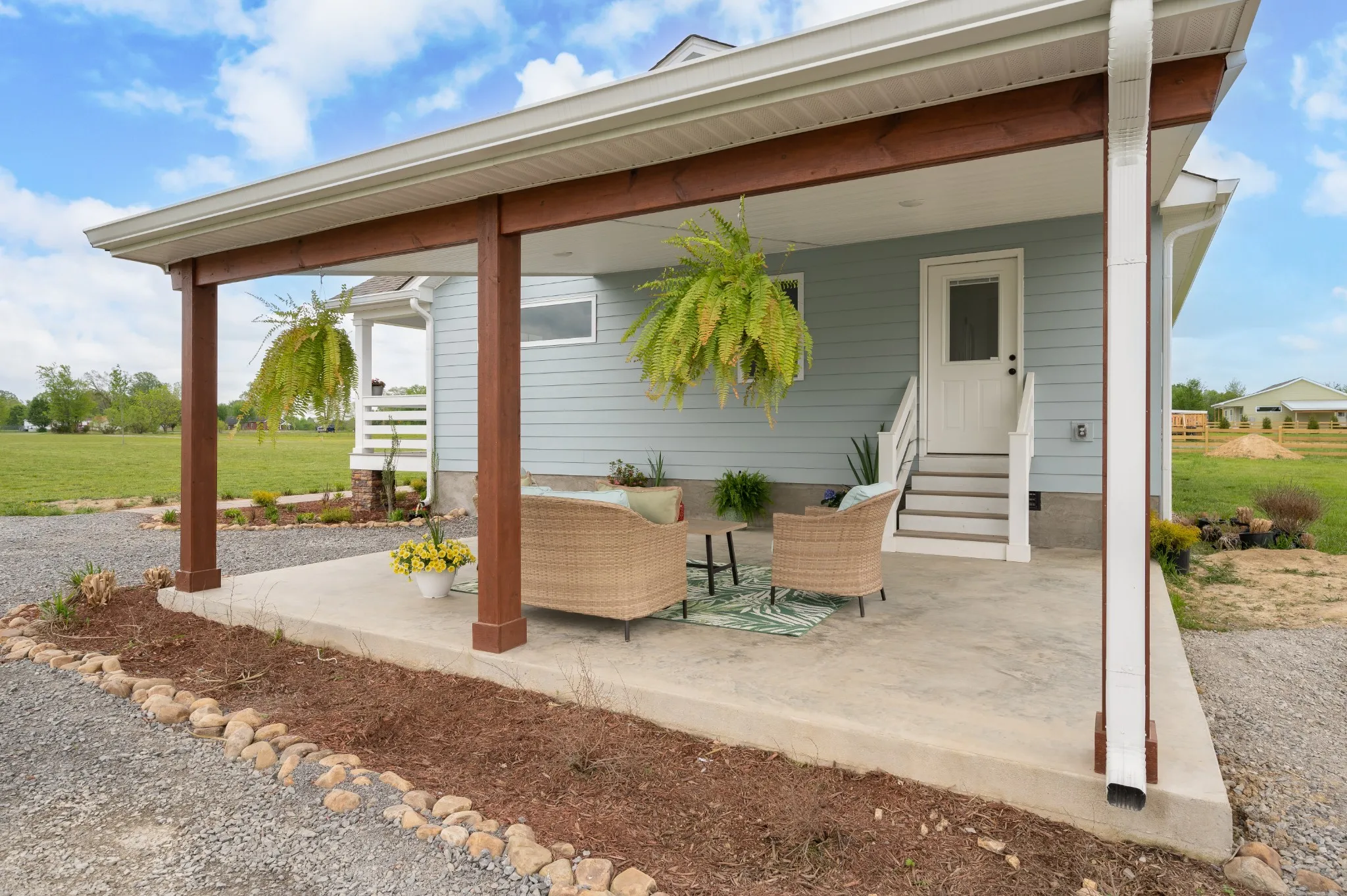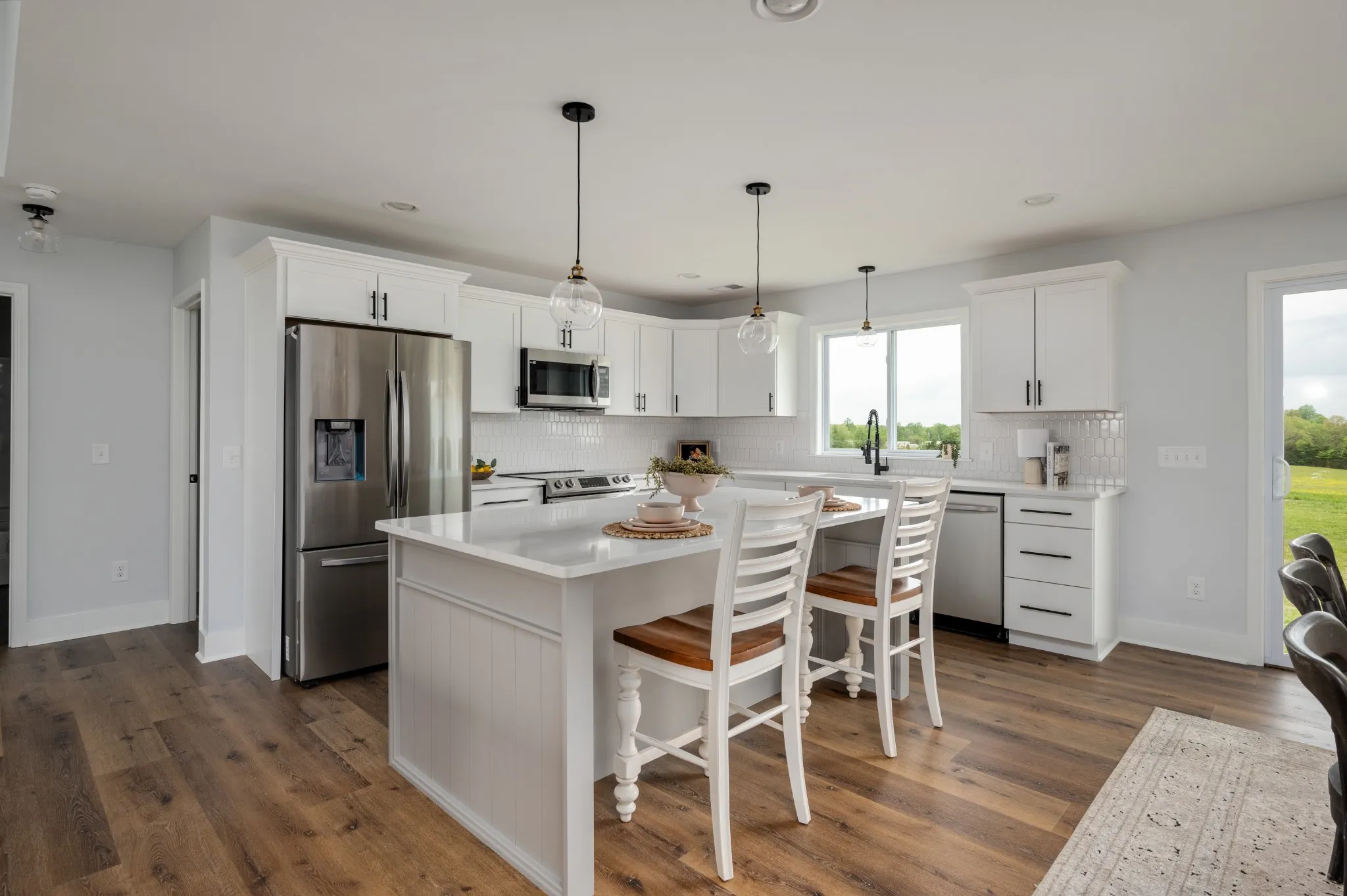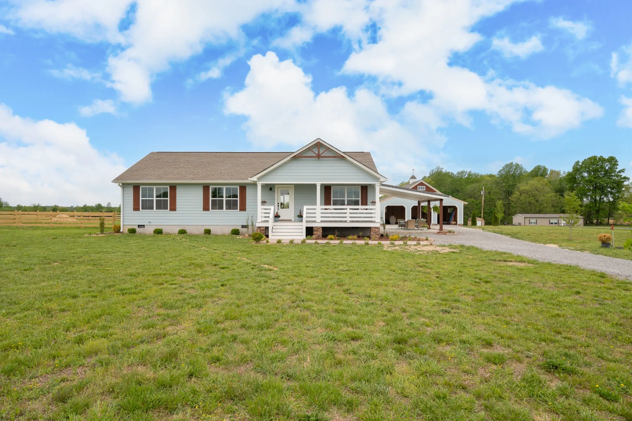 Brand New! Rocking chair front porch ranch sitting far back from the road on 5 level premium acres, partially wooded with creek! Underground utilities. Work from home with access to high speed internet. Great location only min from hwy 52 and 30 min to Gallatin. Home features open floor plan with split bedrooms. Huge primary bedroom with enormous walk in closet. Large covered patio. Big back deck to be built. Home includes furniture style vanities. Kitchen with quartz counters, huge kitchen island & stainless appliances. Large mud room with pantry & bev fridge/deep freeze hook up. Shiplap accents.Stunning 3 car garage with cupola and shake. All on a beautiful country road with rolling hills & pastures.