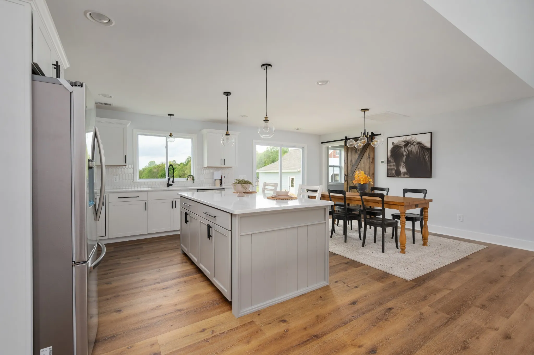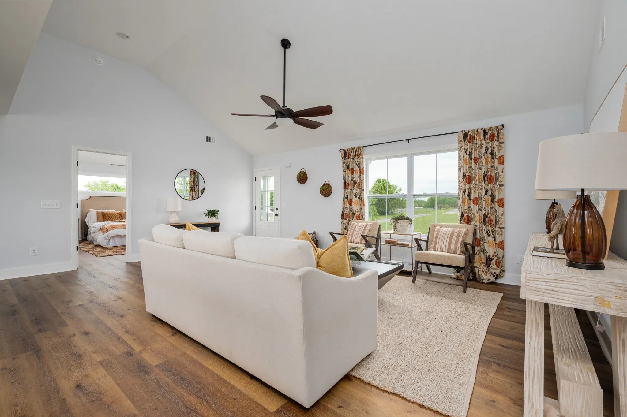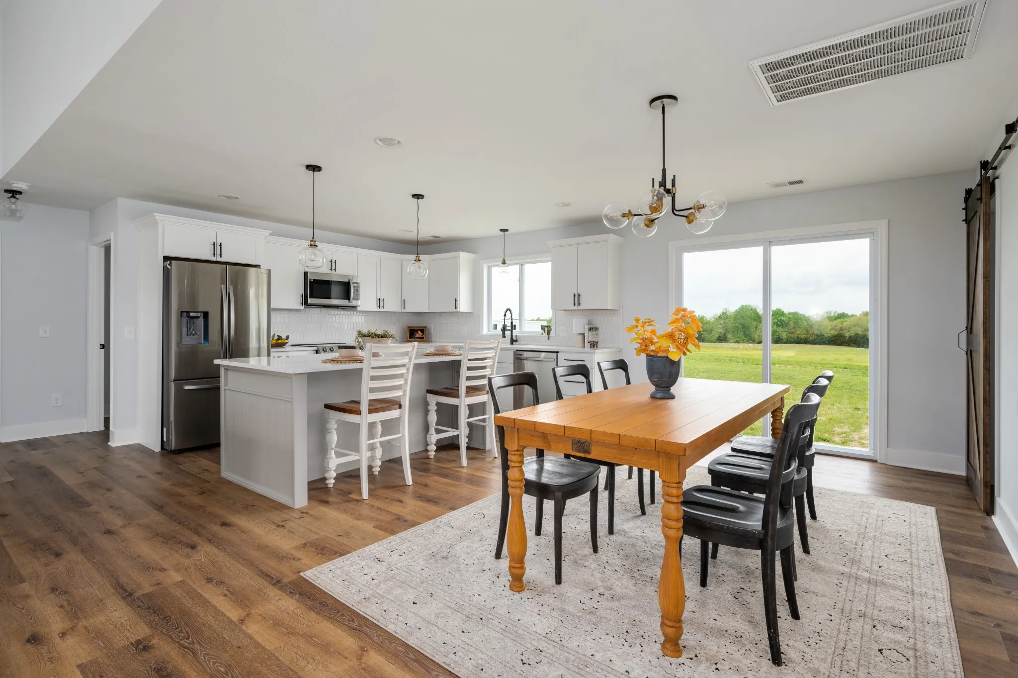 Brand New! Rocking chair front porch ranch sitting far back from the road on 5 level premium acres, partially wooded with creek! Underground utilities. Work from home with access to high speed internet. Great location only min from hwy 52 and 30 min to Gallatin. Home features open floor plan with split bedrooms. Huge primary bedroom with enormous walk in closet. Large covered patio. Big back deck to be built. Home includes furniture style vanities. Kitchen with quartz counters, huge kitchen island & stainless appliances. Large mud room with pantry & bev fridge/deep freeze hook up. Shiplap accents.Stunning 3 car garage with cupola and shake. All on a beautiful country road with rolling hills & pastures.