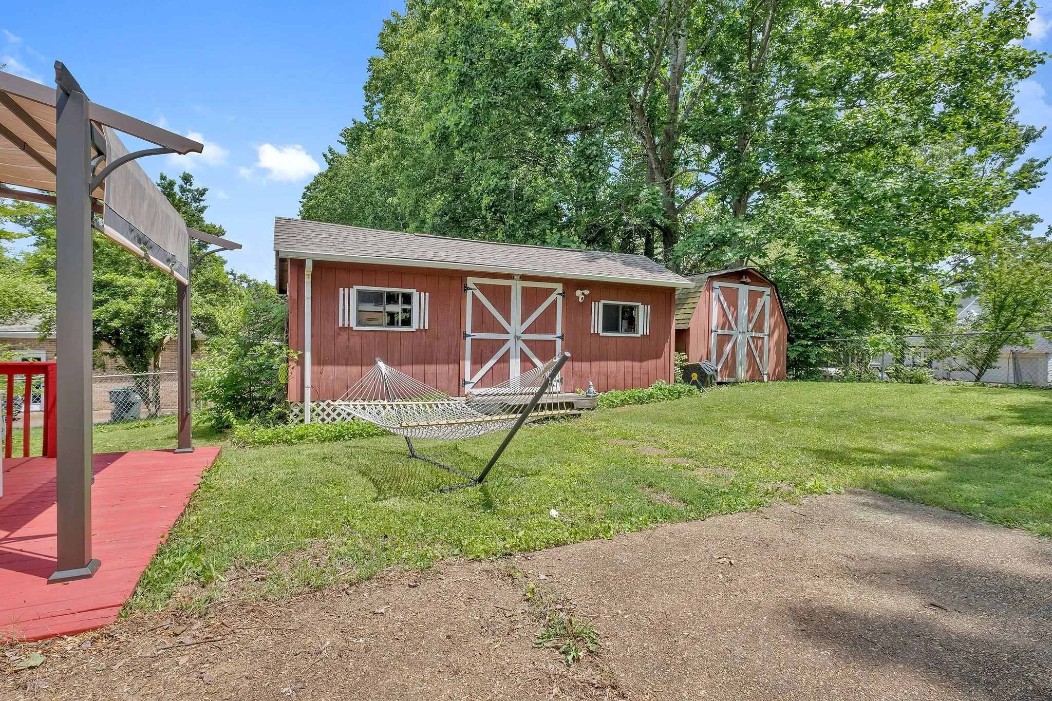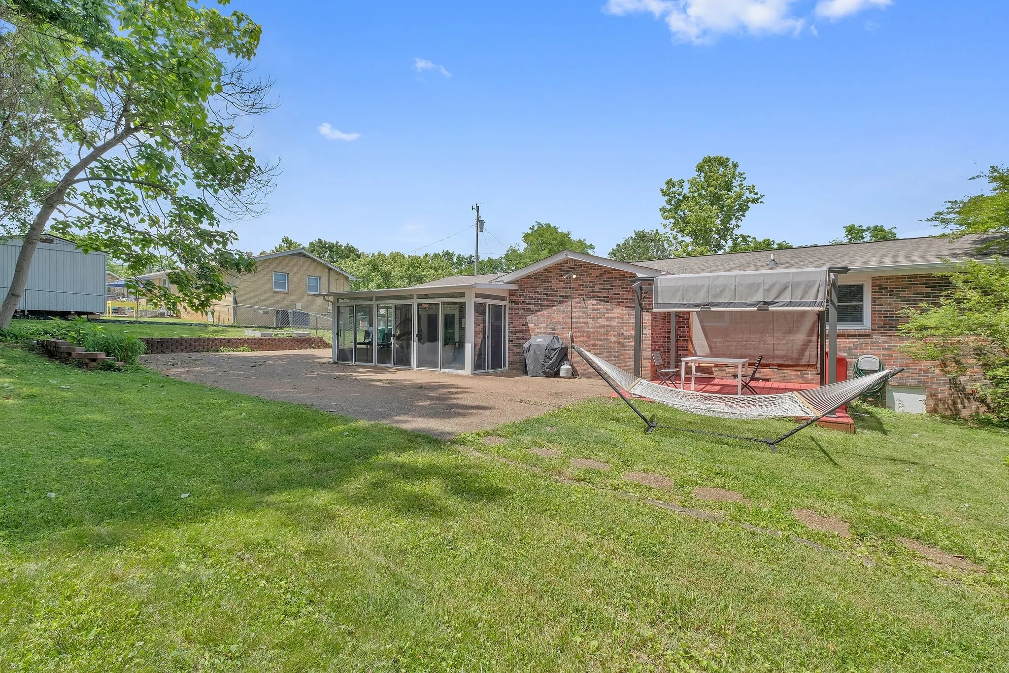 One level all brick ranch style home featuring 3 bedrooms, 2 bathrooms and a sun room. 3rd bedroom could be used as a flex room, such as office, library, or bonus room. The main bedroom features a large closet and large bathroom with a garden tub. Open kitchen and dining area. The backyard is fully fenced and features 2 sheds, and a covered pergola. Home is minutes to Providence Market Place, Cedar Creek Marina, and a short drive to downtown Nashville.