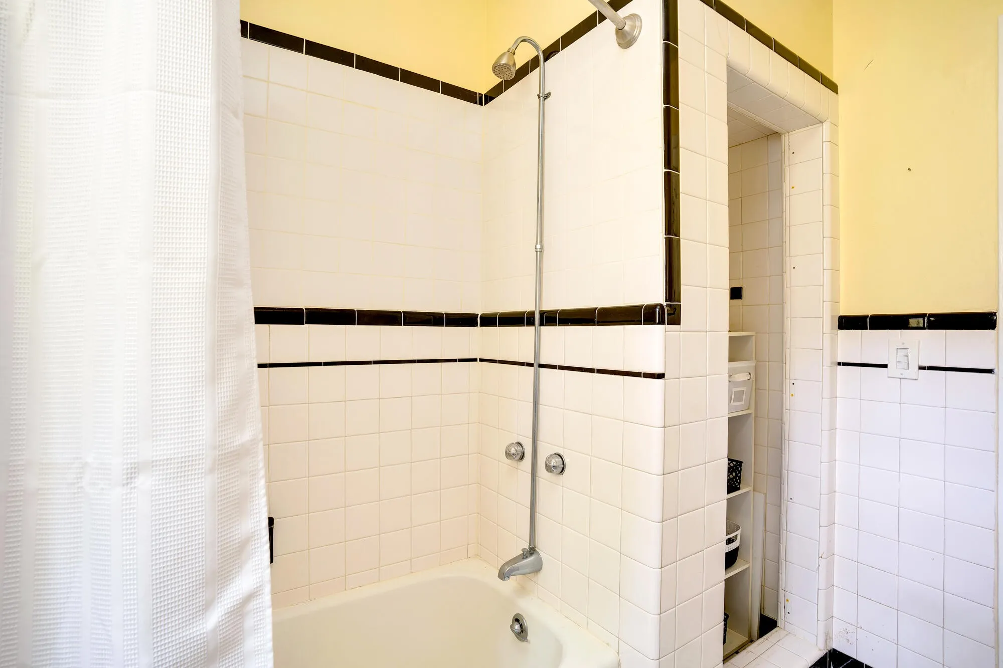 To the right of the kitchen and living room is a short hall to the bed and bath quarters. The hall bath is a classic black and white tiled full bath with with natural light streaming from the single window and ample storage. The primary bedroom is on the back with an ensuite bath featuring lots of storage and natural light. The two additional bedrooms are located on the front of the home. The short hallway also delights with a large storage closets and a small linen closet.