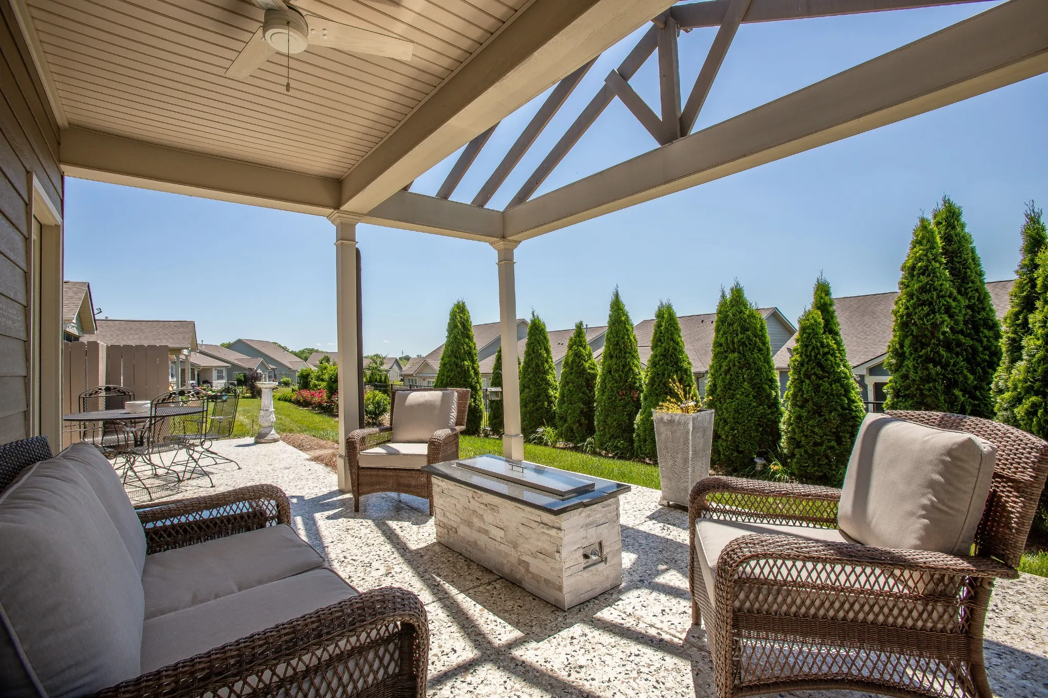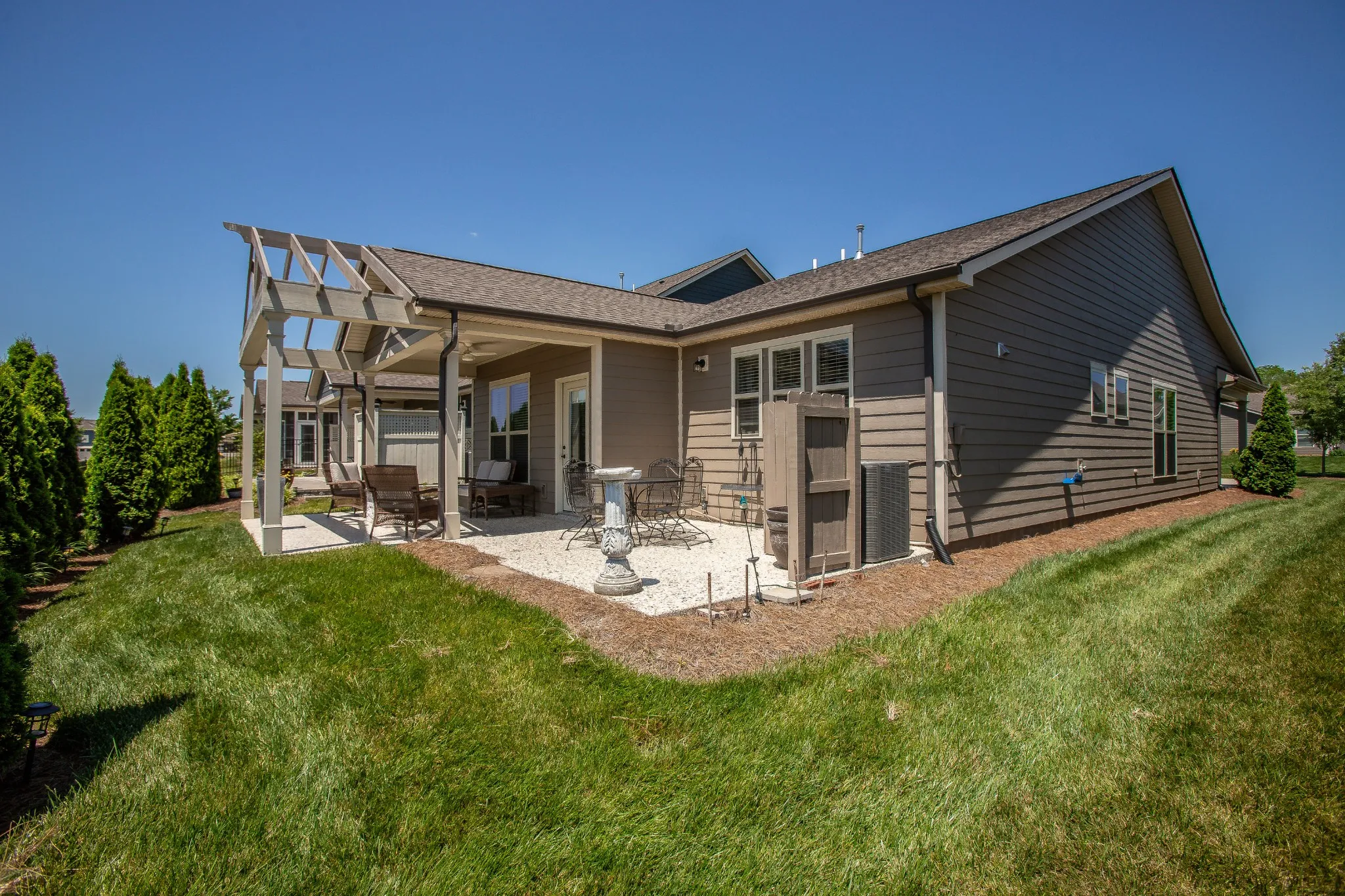 Beautiful home just in time for summer to enjoy the pool and neighborhood amenities! !So many upgrades and move in ready! Open floor plan and tranquil backyard w/ covered patio and a gas fire pit. Landscape lighting & full yard irrigation. Formal dining room could be used as a sunroom. Upgraded larger garage w/ perm steps to floored attic space. Yard mowing, fertilizing and weed control provided by HOA. Relax and enjoy the amenity center, only .3 miles away, with resort pool, indoor lap pool, workout area, tennis/pickle ball courts, outdoor jacuzzi & yoga studio. Numerous clubs and social activities – something for everyone! This home is a gem and is in immaculate condition! Come see it today!