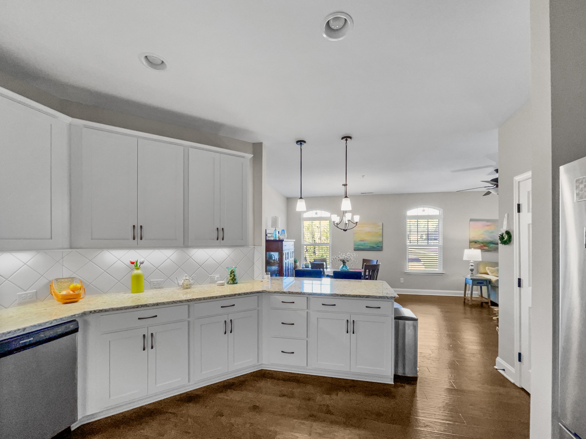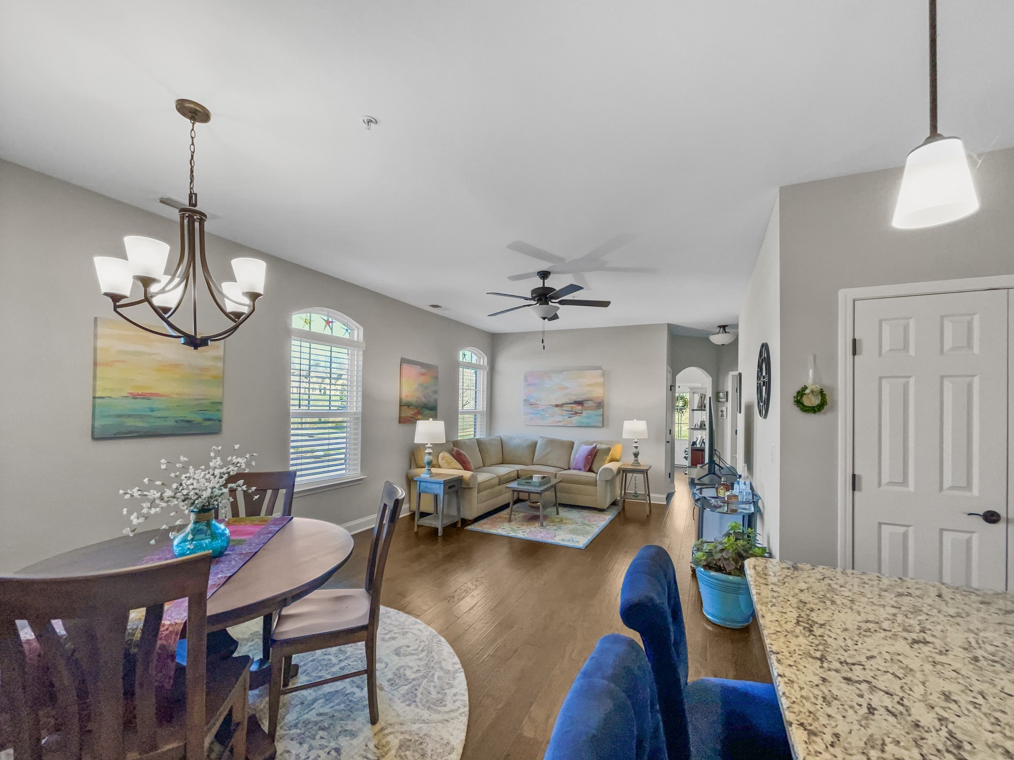 55+ Active Adult neighborhood with a clubhouse for meeting space, resident firepit/grill area, putting green, dog parks and close to many conveniences. This one level, end unit offers 42″ white cabinets, hardwood floor through out main living, LOTS of natural light, private patio, granite and quartz counter tops, tile shower and many more upgraded features. Raleigh plan.