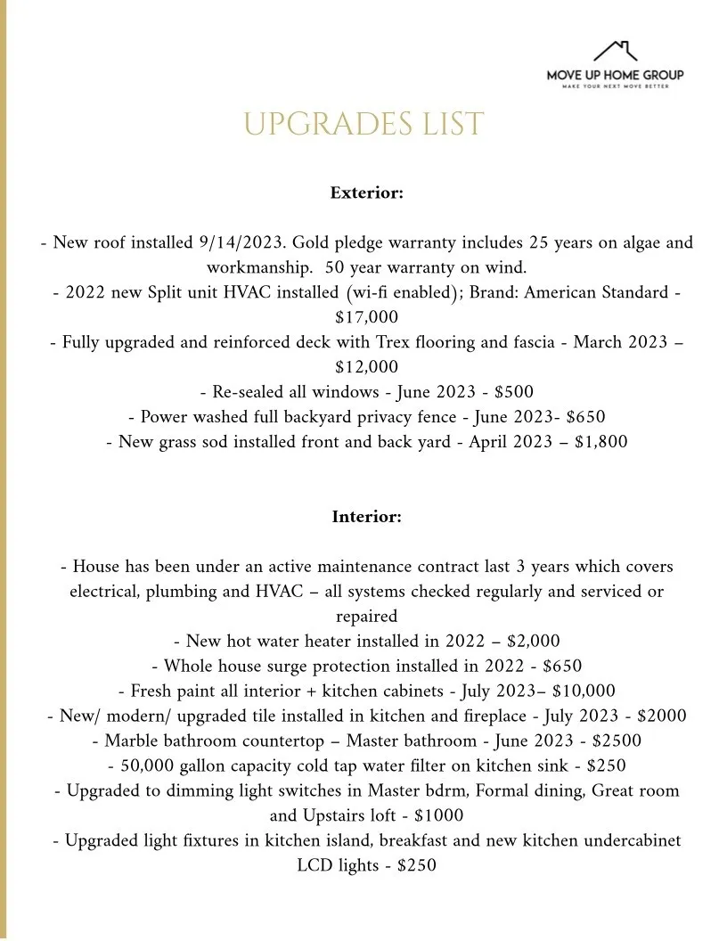 +"PublicRemarks": "PRICED TO SELL! Open House this Sunday from 2-4pm! Move-In Ready! New roof with 25 year+ warranty, new HVAC, new hot water heater, interior freshly painted, upgraded lighting, and steel storm shelter. Beautifully upgraded home features a separate office space, dining room, loft with wet bar and huge bonus room. Kitchen includes newly painted cabinets, new tile backsplash, under-cabinet lighting, gas cooktop, double ovens, and large island with bar seating. Downstairs master bedroom features a tray ceiling and en suite bathroom with new marble countertops, double vanities, separate tub, tiled oversized shower and walk-in closet. Outside living area includes fireplace under a covered patio, extended upgraded Trex deck, and a privacy fence. 1% closing cost credit of loan amount with Suggested Lender!"