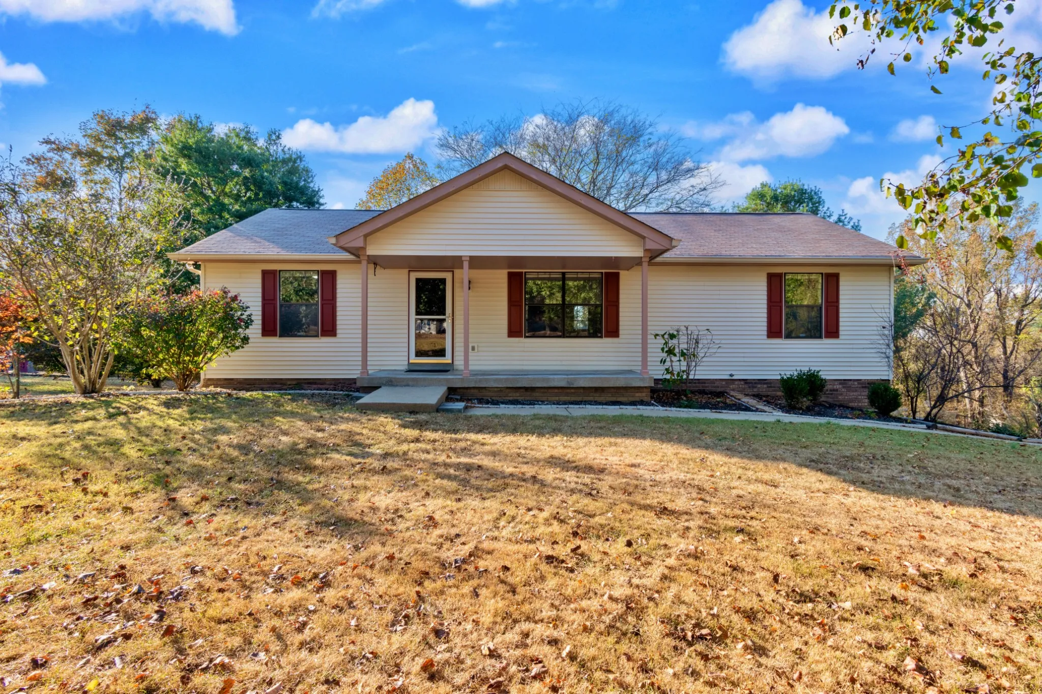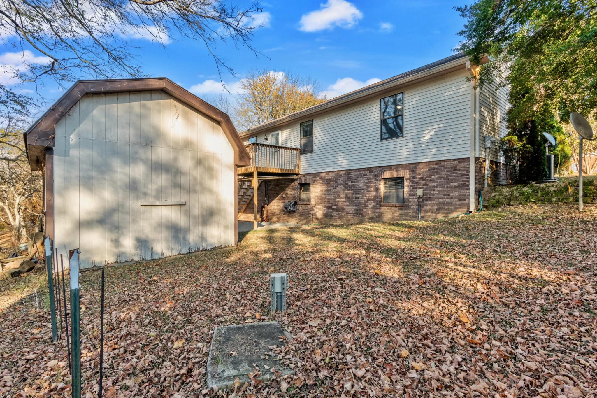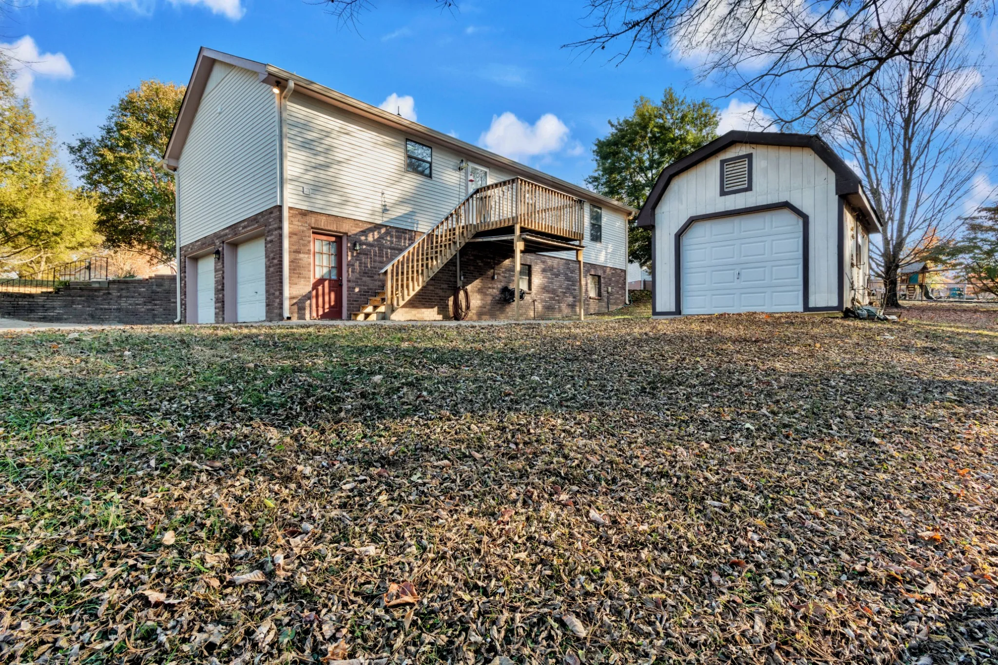 Be welcomed to your new home by driving through tranquil Tennessee hills! Still convenient to restaurants, shops, interstates, and more, this beautiful neighborhood features a dead-end street with no HOA. Enter the spacious living room, completely open to the dining area and well-appointed kitchen. Separate laundry room complete with pantry and extra shelving conveniently located next to kitchen. Spill onto the composite upper-floor deck overlooking rolling hills and mature trees with plenty of space to host your friends and family around the firepit or go camping in your own back yard! Enjoy the privacy of a split-bedroom floor plan, featuring the primary bedroom on opposite side as the guest rooms. House also features water softener system. Lower floor features garage space open to unfinished full basement — use for storage or bring your builder to convert to additional living space. Separate 16×12’ workshop with concrete floor and electricity.