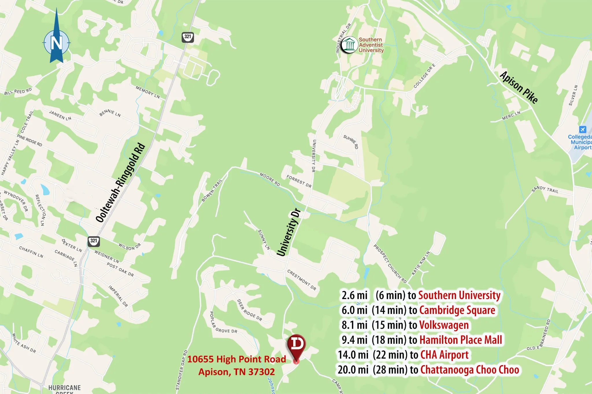 - Directions: From Collegedale, go South on University Dr until you reach the intersection of Camp Rd and Standifer Gap Rd. Take Camp Rd to the left for .7 miles. Turn Left onto High Point Rd. Property will be .2 mile on your Right.