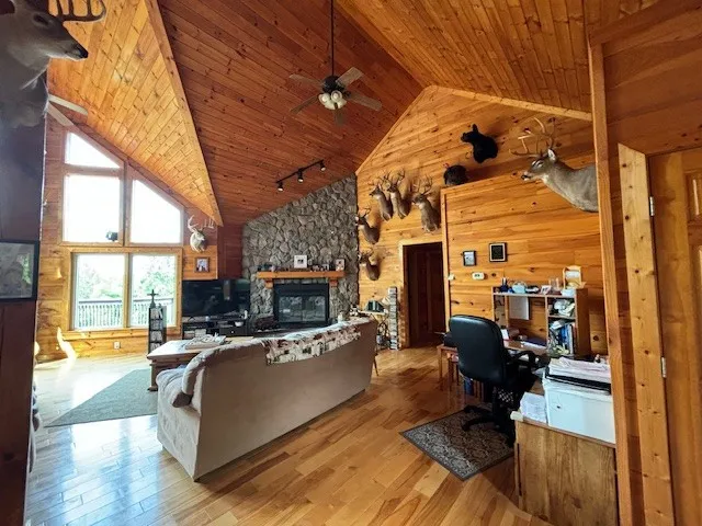 Custom log home with seclusion and privacy on 30.82 acres in two tracts surrounded by hundreds of acres of vacant land and scenic long-range mountain views just 19 miles from Downtown Nashville. The trade-off for the magnificent views is that the driveway has a “steep” part if you are used to city living, but NES and the garbage truck have no issues. The great room is 35 x 27 with high ceilings and a fireplace that create an open lodge effect. The kitchen has a new granite island and granite countertops. The main level has upgraded windows and exterior storm door upgrades. The downstairs 15 x 19 music room or office has a walk-in 4 x 15 closet, a rec room with a fireplace, separate entries, and an attached 2-car (25 x 24) garage. Metal roof. Front and back decks. Large attic area. Marketable timber and some hilltop field/pasture areas for horses or livestock. Plenty of wildlife and there is also room to ride your ATV/UTV!