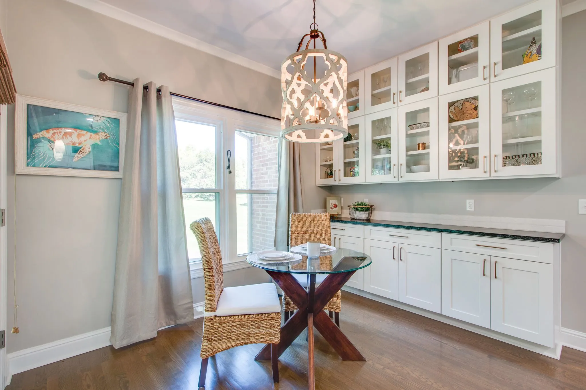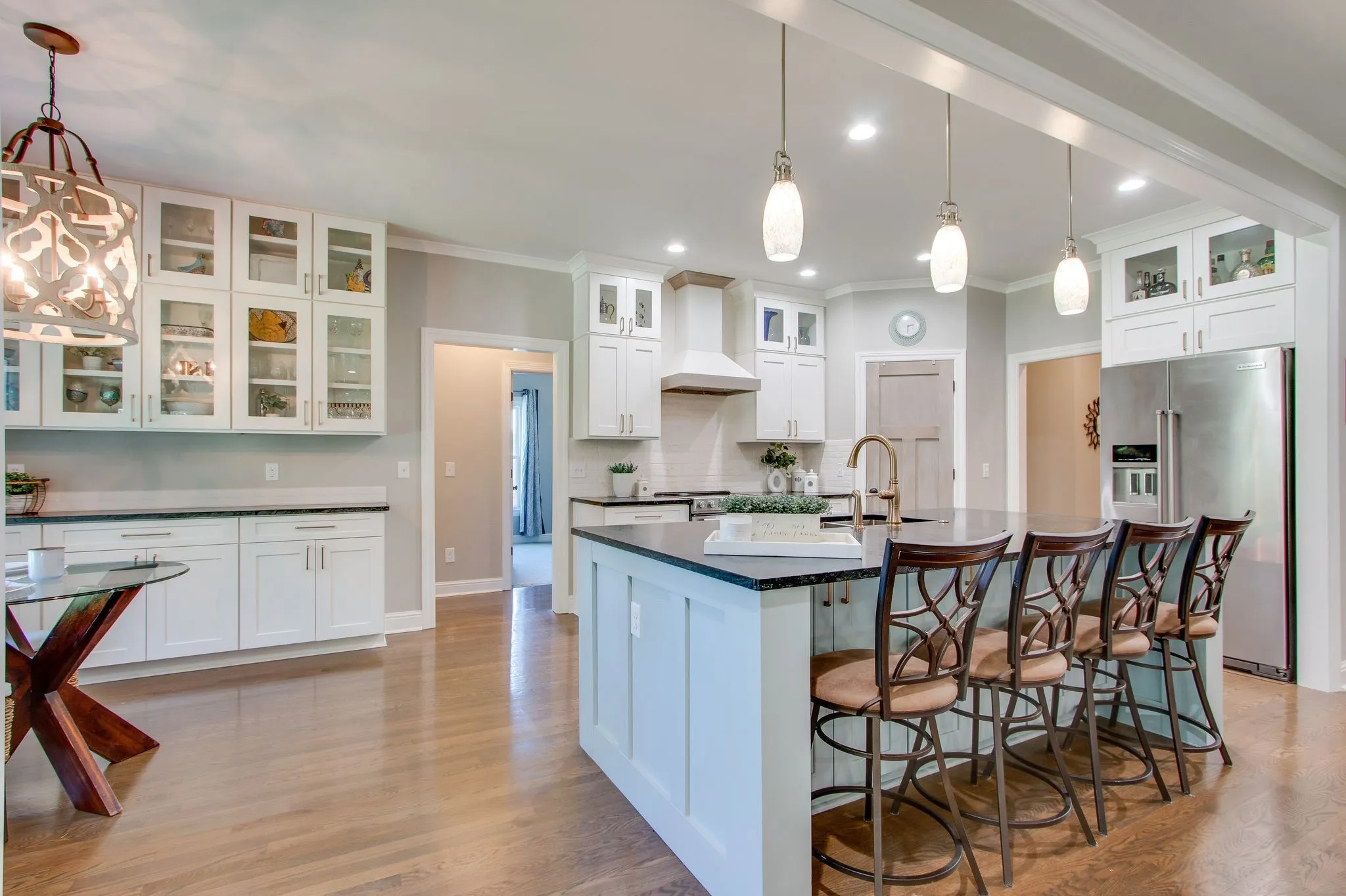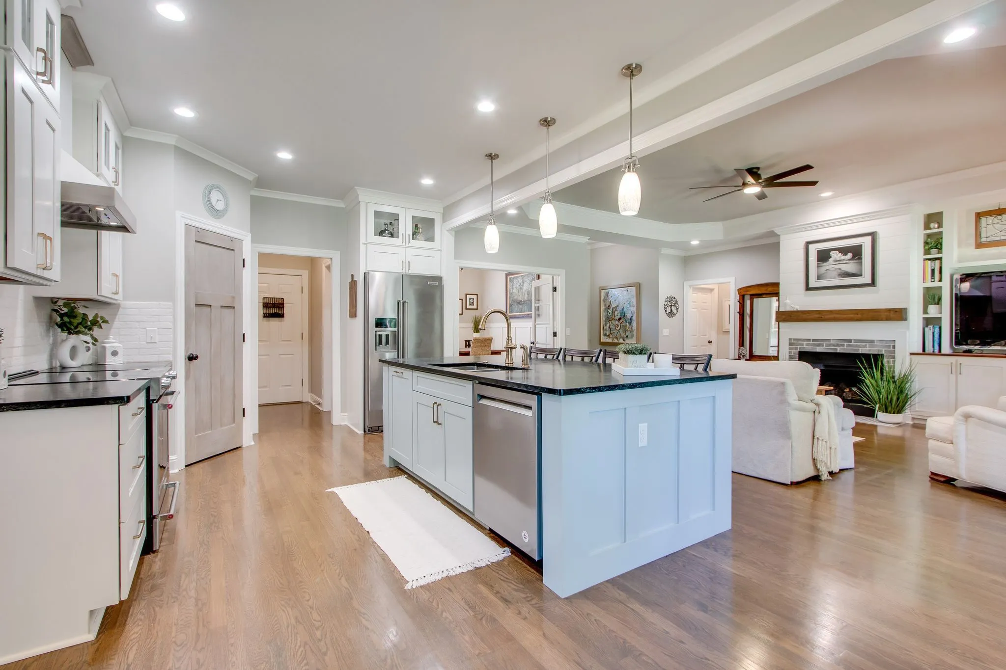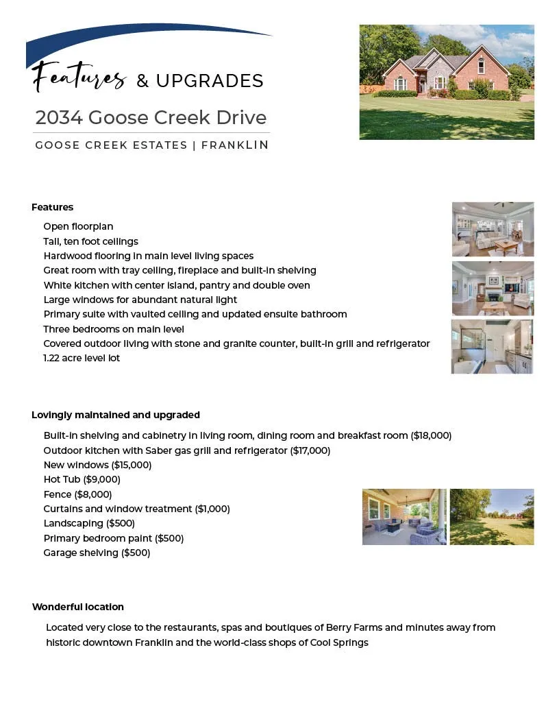 Luxurious estate in the heart of Franklin! Across from Berry Farms, this home offers a sizable level yard with convenient access to shopping and dining. The open concept floor plan offers mostly main level living. The white kitchen with island overlooks a large living area with fireplace, creating the heart of the home. With tall ceilings & hardwood floors, the attention to detail is impeccable. Enjoy a breakfast nook off the kitchen and a formal dining room with built-in buffets. Three bedrooms are on the main level, including an oversized primary suite with vaulted ceilings and an updated ensuite bathroom. You’ll find only a bonus room upstairs—perfect for a gym, media, or game room! A vast lawn offers a covered patio with kitchen & hot tub, and plenty of play space! Located in desirable Goose Creek Estates and close to the vibrant amenities of Berry Farms, Cool Springs & downtown Franklin, this home offers seclusion while being minutes from I-65. Zoned for Williamson County Schools.