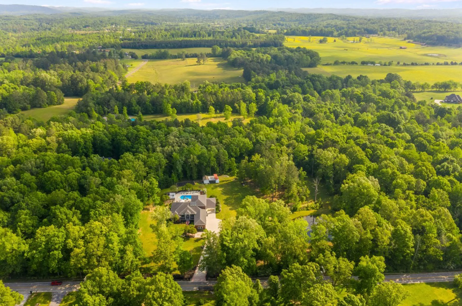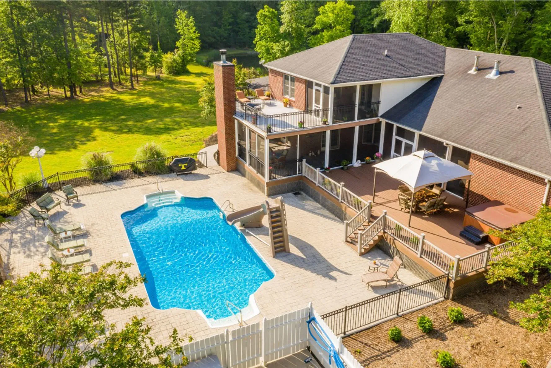 Let home become your daily escape in this gated and PRIVATE, 10 acre estate. This 4 bedroom virtually maintenance free brick home is full of amenities to include custom cherry hardwood floors, custom cabinets, exotic granite throughout the home, multiple living areas, an upstairs kitchenette, & large walk out attic storage. Perfect for those who love entertaining, or those who just love being outside, this home has many outdoor living spaces and features two screened porches, solar assisted heated pool with slide and its own wood burning fireplace, stamped concrete patio, all aluminum railings and pressed decking, and your own outdoor 100 yard shooting range. With a grand dining room large enough to accommodate a 12 person table, the question of whether or not the dining room table will fit is no longer an issue! Enjoy stunning views of the pool from the great room. Open flow from the kitchen to the large keeping room and into the screened-in porch with a magnificent brick wood burning fireplace brings to mind the perfect cozy fall night by the fire. From the great room, double door entry accesses the master wing. Enjoy the convenience of a coffee & refreshment bar beside the large master bath that includes separate shower, separate vanities, and jetted tub to soak away the stress of the day. Separate His and Her closets, HERS featuring a granite topped island. From the master bedroom walk out enjoy access to the screened in porch, hot tub, pool, and outdoor patio. Adjoining the master suite is a large office with custom cabinetry and wall to wall shelving. A second bedroom with its own bath is also on the main level. Upstairs living area is serviced by its own kitchenette and accesses the screened in porch and veranda overlooking the pool. Every detail deliberatly planned, there is extensive attic storage area with foam insulation ensuring year round climate control.