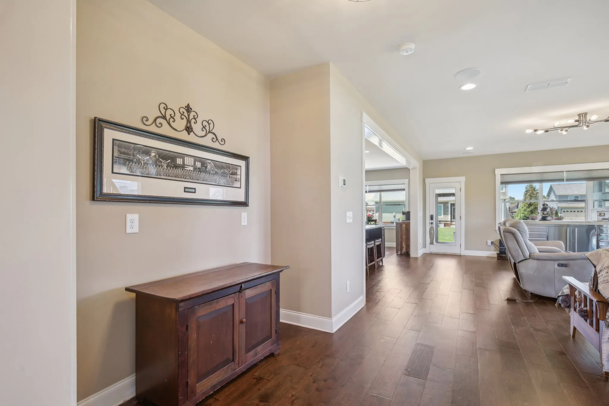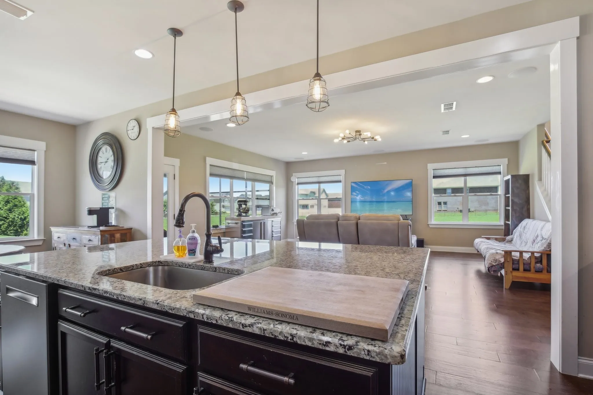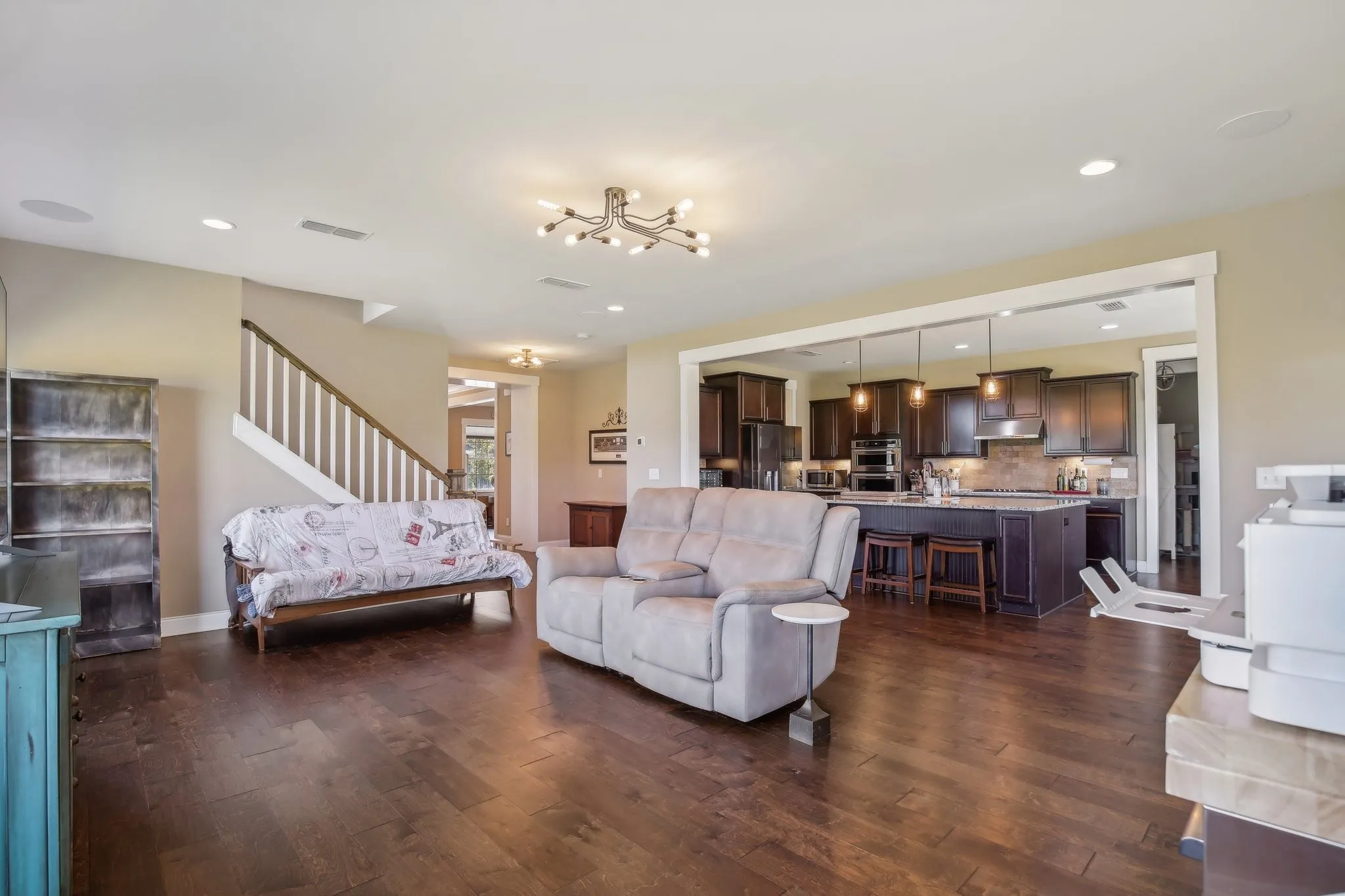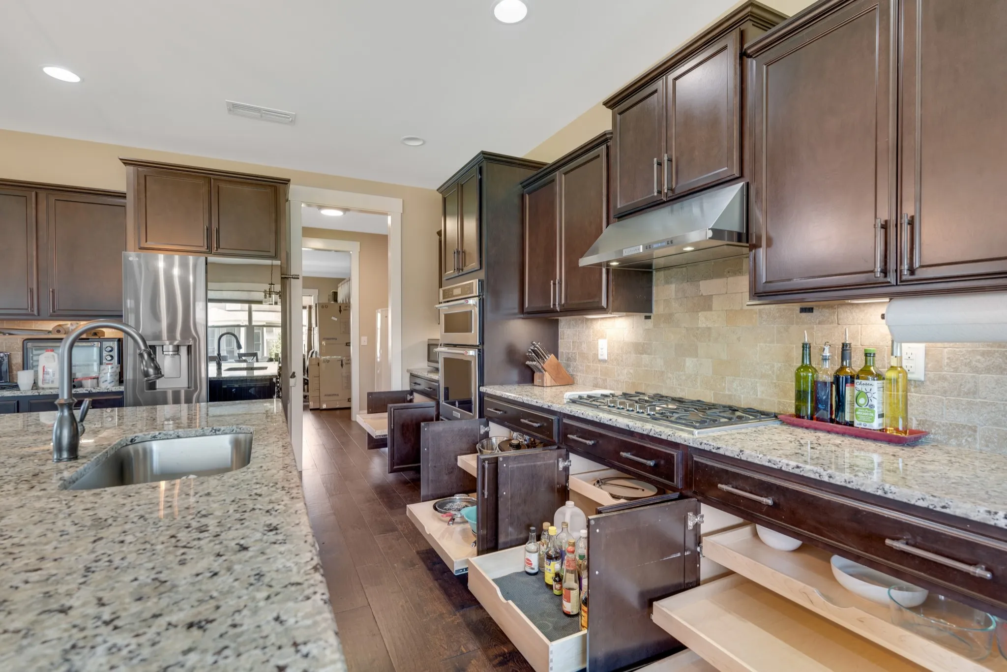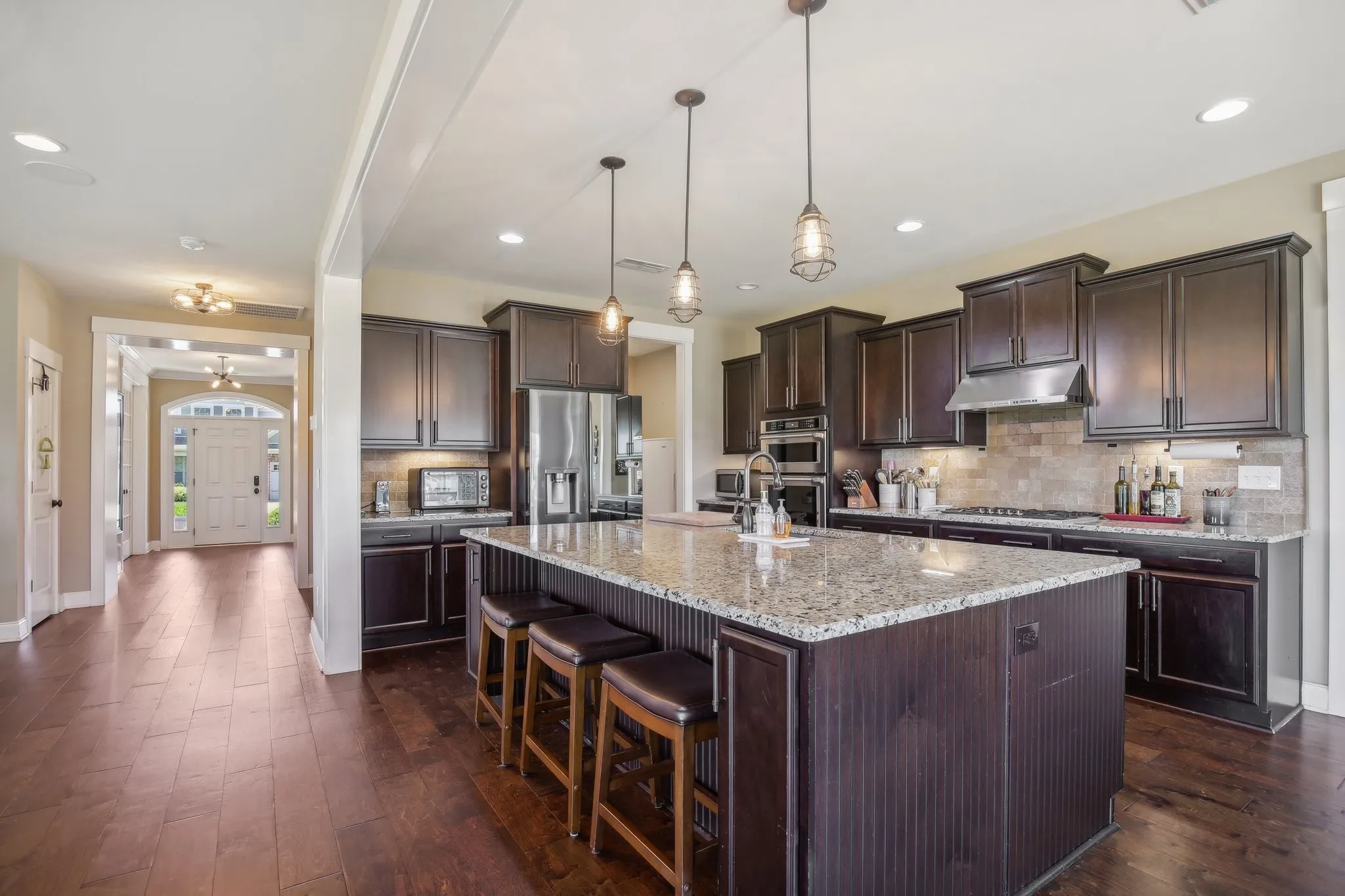 Step into this inviting home featuring impressive amenities. A spacious, open-concept design welcomes you, boasting abundant natural light and ample room for entertaining. Indulge in the gourmet kitchen, where an oversized island and custom cabinets with pull-out drawers await. Equipped with a THERMADOR gas cooktop, KitchenAid oven, and microwave. Experience the convenience of a man’s dream garage, complete with heating, cooling, and a retractable screen door. Additionally, an extra flex/office room offers versatility for storage or office space. Discover a serene primary bedroom featuring a vast flex space, ideal for a nursery, office, or cozy seating area. Bedrooms throughout the home boast generous closets, ensuring ample storage. For added convenience, a fourth bedroom on the third floor includes a full bath and kitchen, perfect for guests or in-law accommodations. Enjoy the luxury of a tankless water heater and a full house water filtration and softening system.
