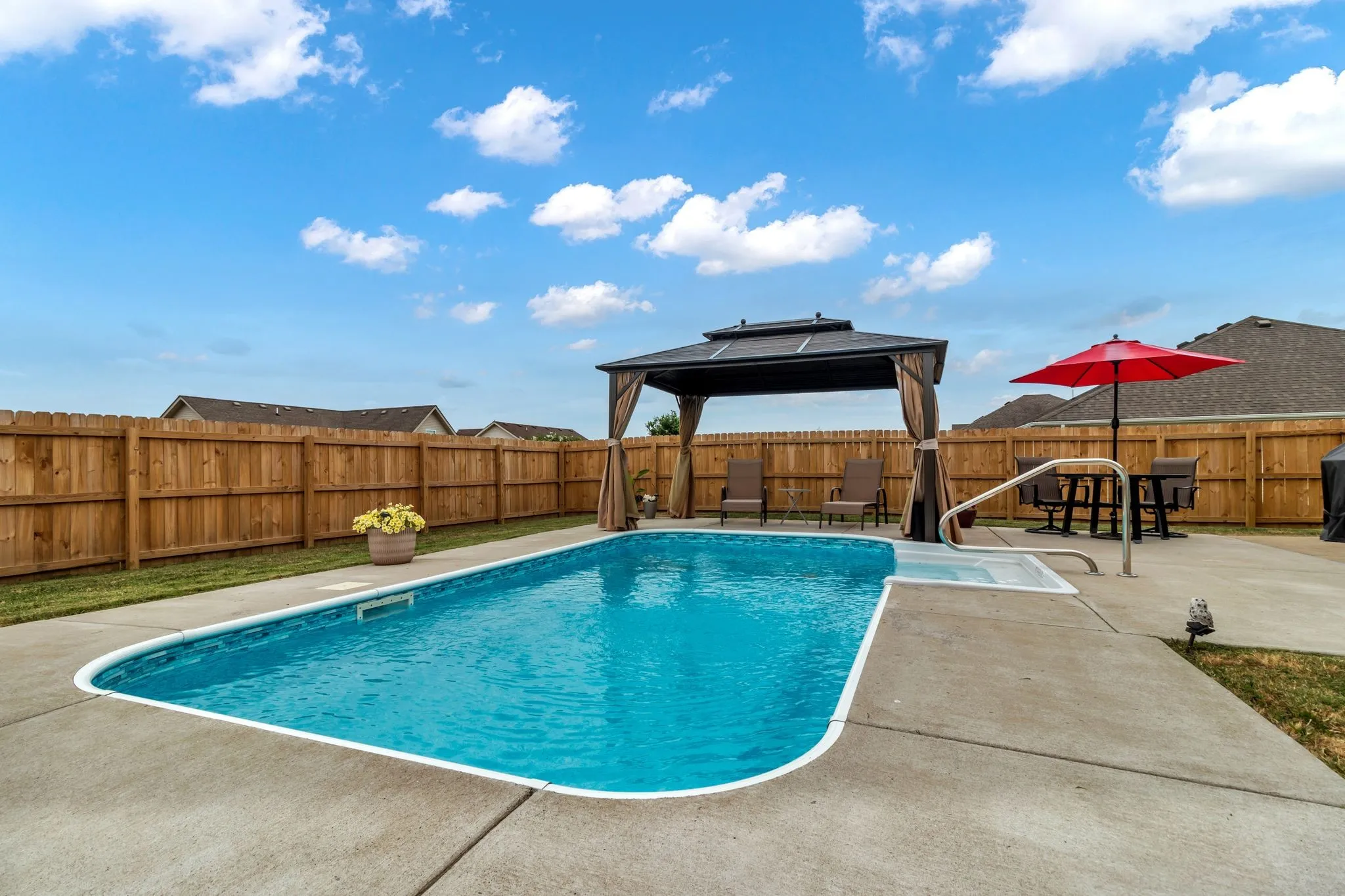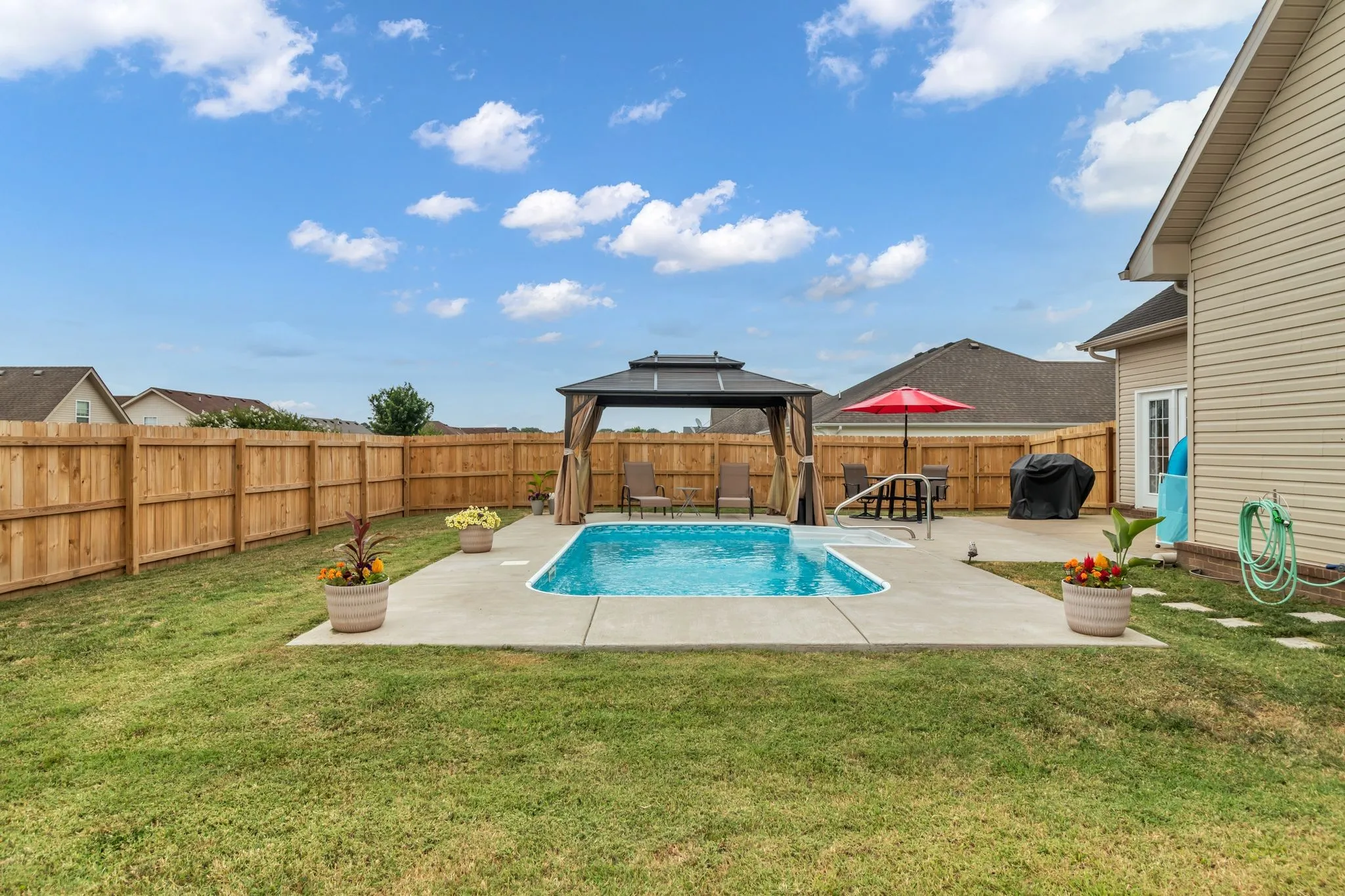 Welcome to your dream home! This exquisite property boasts a fantastic open floor plan, perfect for modern living and entertaining. High-end luxury vinyl plank floors flow seamlessly throughout the main living areas, adding elegance and durability. The kitchen is a chef’s delight, featuring stunning quartz countertops, a beautiful tile backsplash, and brand-new stainless steel appliances. The main level features a spacious master suite, providing a serene retreat. Upstairs, you’ll find three large bedrooms with walk-in closets, and a versatile bonus room. Outdoor living is equally impressive with a saltwater in-ground pool and a gazebo, perfect for relaxing and entertaining. The garage includes storage lofts for extra space. Don’t miss out on this stunning home that combines luxury, comfort, and functionality. Schedule a viewing today!