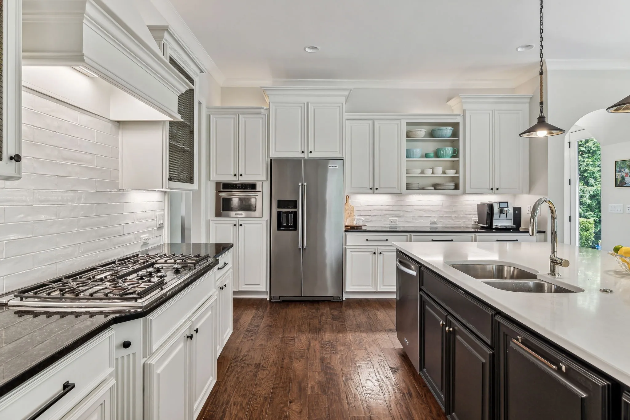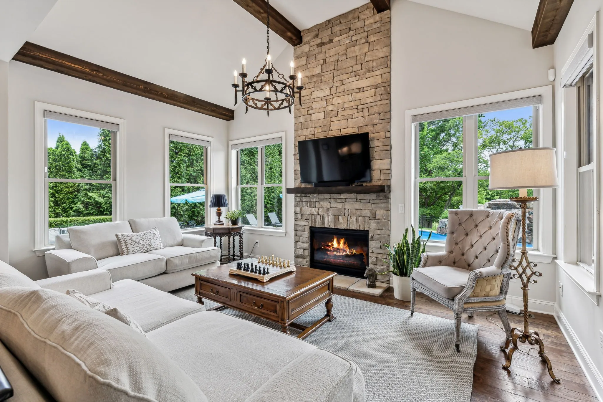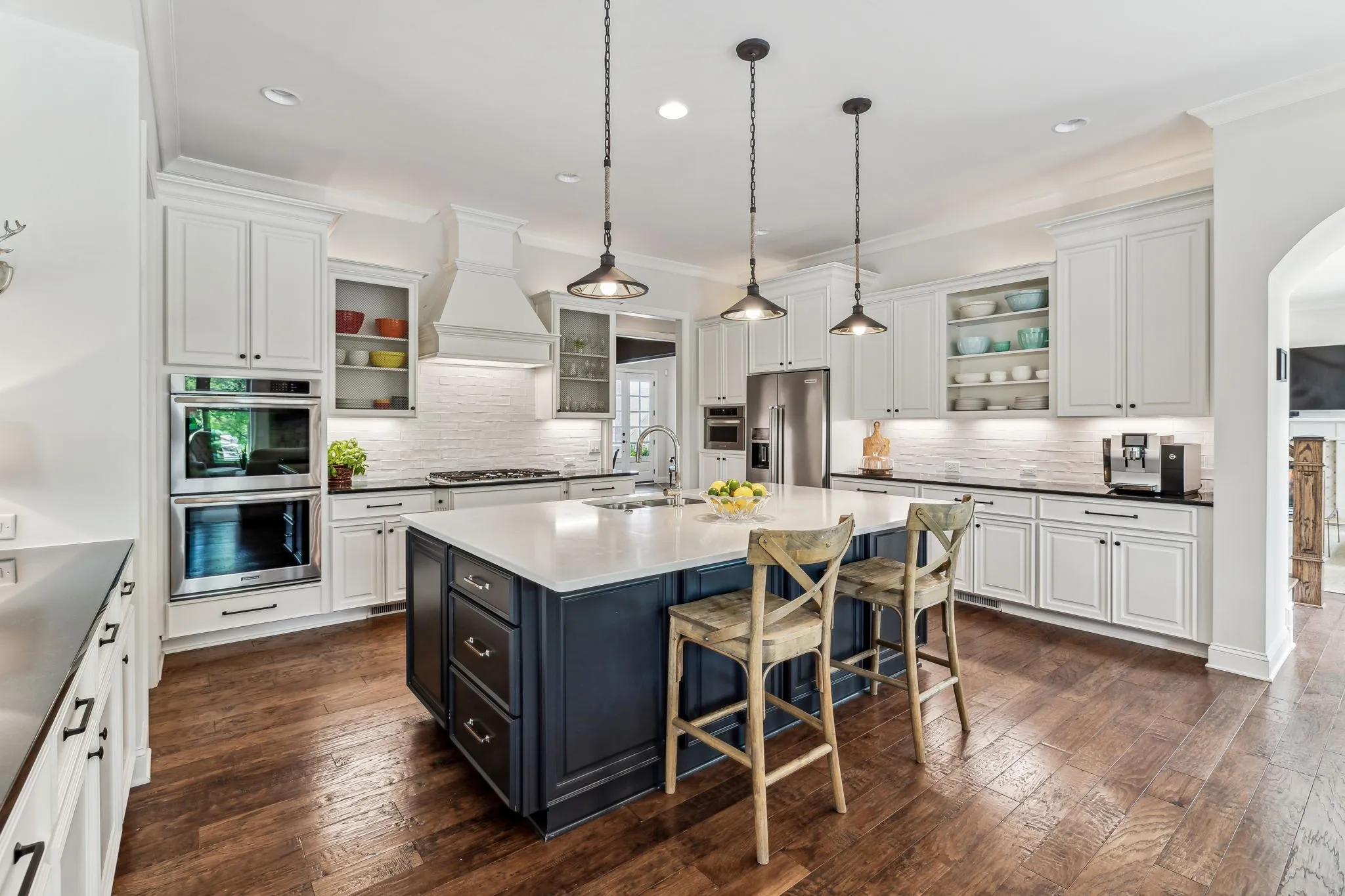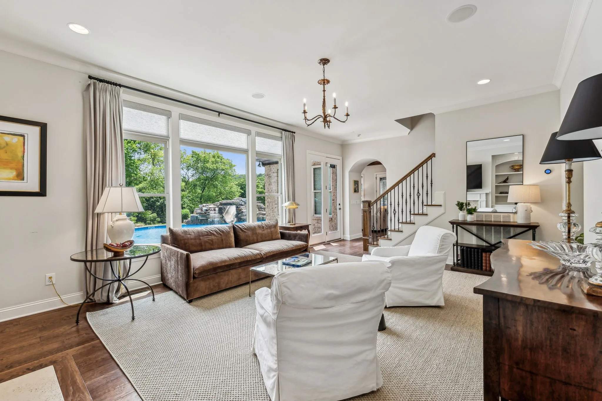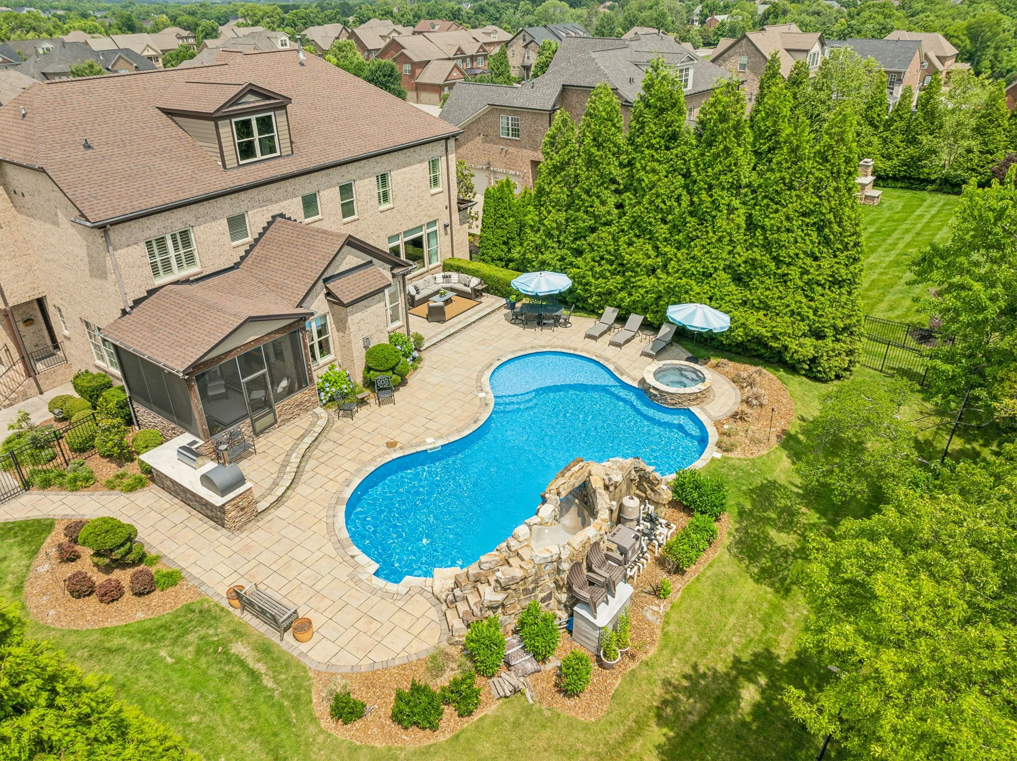 Luxury, comfort, and privacy in Brentwood with a POOL. This stunning home boasts 5 bedrooms and 6 full baths, providing ample space for family and guests. The open living area, complemented by a cozy fireplace, is ideal for hosting gatherings, while multiple dining spaces offer versatility for any occasion. The kitchen is a chef’s delight, featuring a gas cooktop, double ovens, and a generously sized island with seating. On the main level, you’ll also find a formal dining room with built-ins, a living room, and a guest suite for added convenience. Upstairs, four bedrooms and four full bathrooms await, along with a generous gathering area perfect for relaxation or entertainment. The third-floor media room is complete with a wet bar and full bathroom. Step outside to your private oasis, where the fully fenced backyard backs up to green space, offering serenity and privacy. Enjoy the saltwater pool, outdoor kitchen, and screened porch on a spacious half-acre lot.
