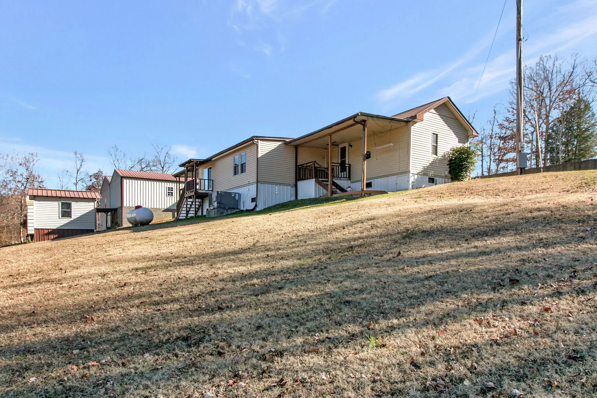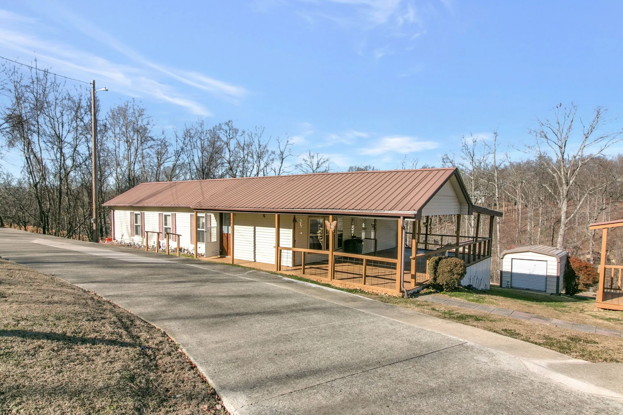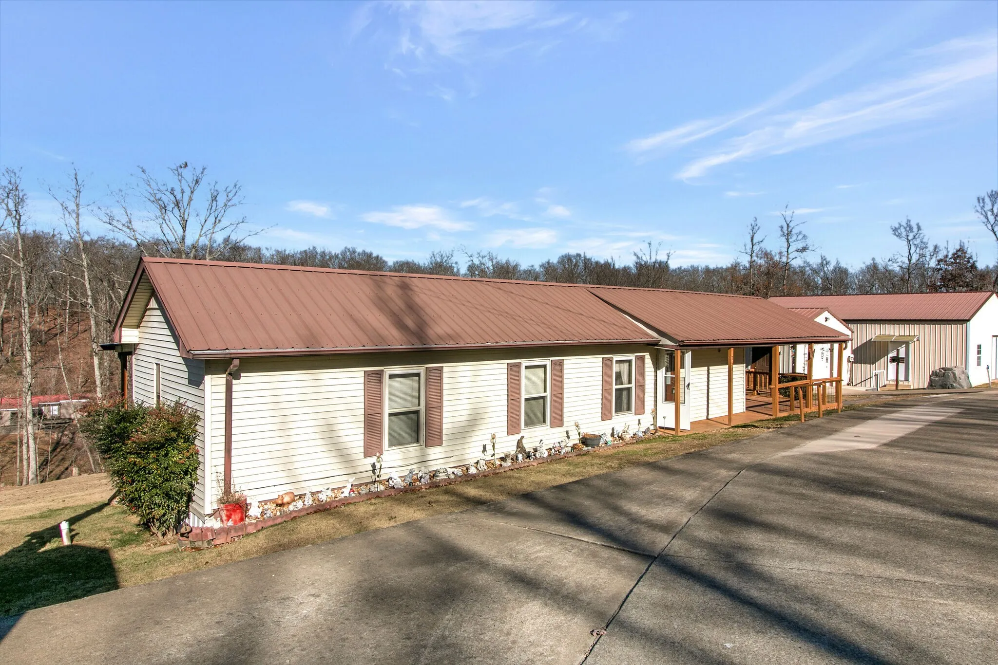 Looking for a Tennessee River getaway near Brownfield Resort and Leatherwood? LOAD THE BOAT AND LOOK NO MORE!! Immaculate mobile home SITUATED ON 3.1 ACRES with 2 DETACHED SHOP BUILDINGS ( 31×43 and 31×19 ) and 2 STORAGE BUILDINGS, detached carport and outdoor living area/covered porch space galore ( 31×29 ). 1/2 Mile to Brownfield Riverside Resort and Miss Kay’s Marina, 2 miles to Leatherwood Marina. Concrete circular driveway, all decking has been recently painted/stained, metal roof and well maintained yard, with mature trees surrounding. HVAC replaced in 2021. All appliances stay including washer/dryer, refrigerator, freezer, microwave.