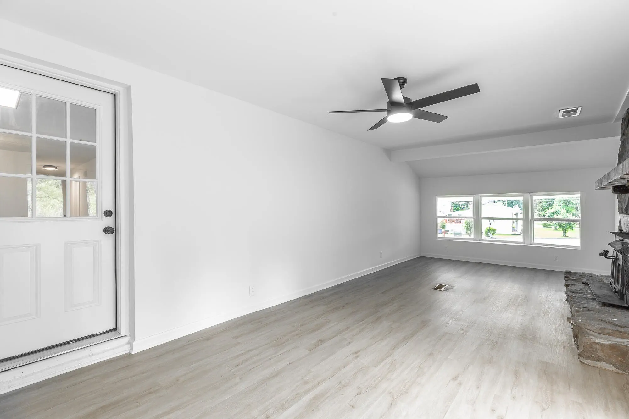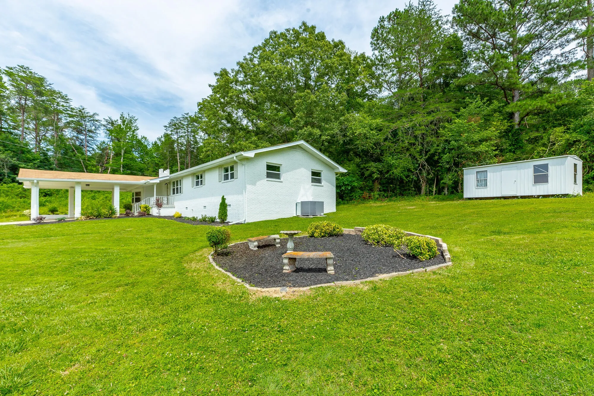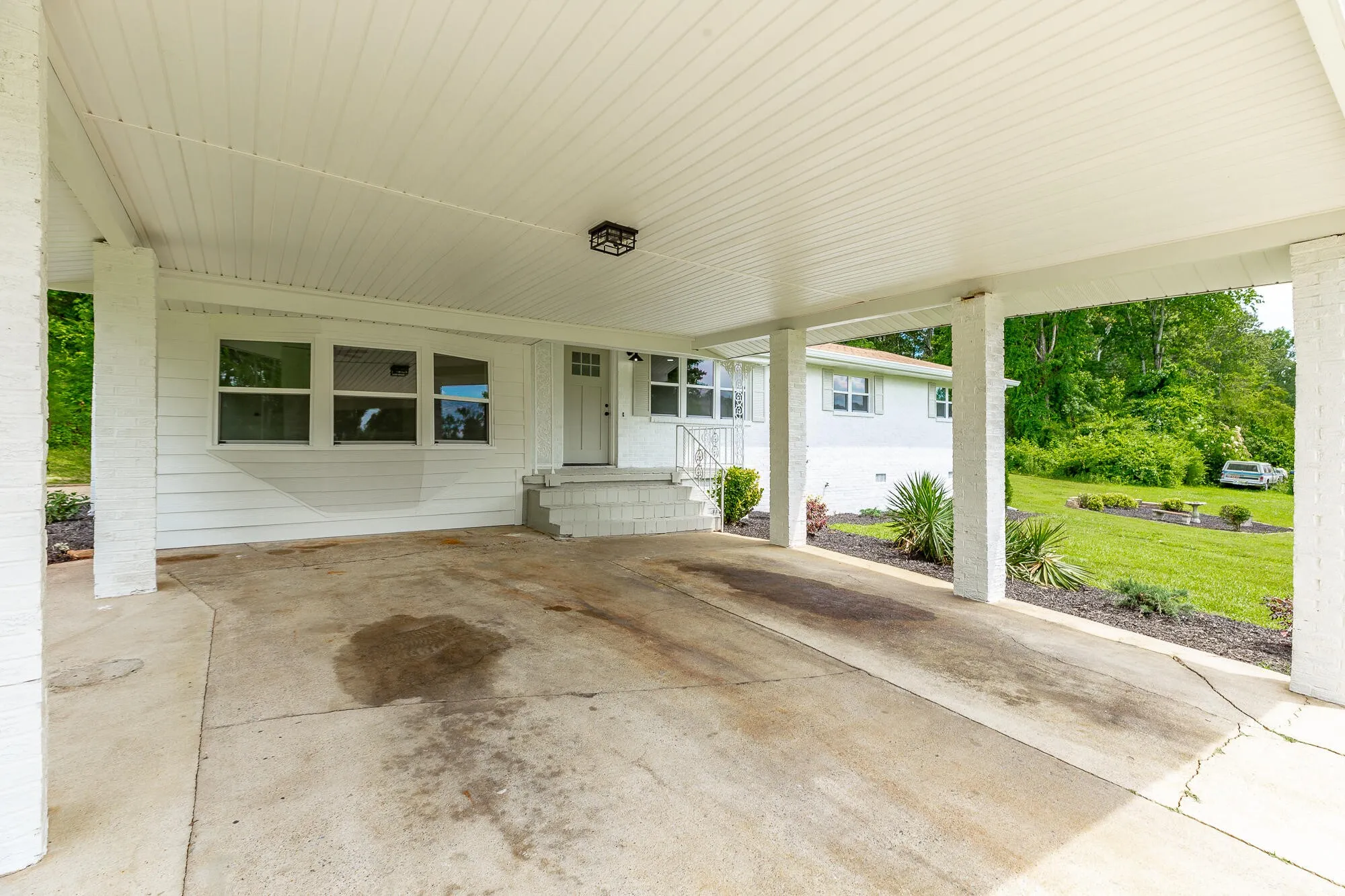 This stunning, fully renovated home boasts 3 bedrooms and 1.5 baths, with a versatile flex room that can serve as a potential 4th bedroom, office, or bonus space. The attractive curb appeal features a charming white painted brick exterior and a large front carport. The expansive, level yard includes a landscaped seating area, perfect for relaxation, while the paved side patio is ideal for grilling and outdoor entertaining. Inside, the bright and airy front living room impresses with a triple window and recessed can lighting. The open-concept kitchen and dining area showcase quartz countertops, stainless steel appliances, and luxury LVP flooring, creating a seamless flow for entertaining and everyday living. A cozy den with a stone fireplace offers a warm and inviting space to unwind. This home has been upgraded with new HVAC, windows, plumbing, and electrical systems. Both the interior and exterior have been freshly painted, and the bathrooms are fully renovated with stylish new fixtures. Every detail has been thoughtfully updated, making this home completely turnkey and ready for you to move in and enjoy. Don’t miss the chance to make this gorgeous property your own!