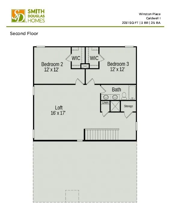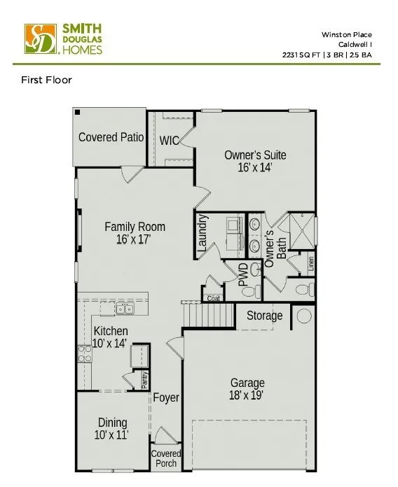 The Caldwell plan at Winston Place, by Smith Douglas Homes. The Caldwell is a great choice for those needing a first-floor owner’s suite. A designated Dining Room at the front of the home leads into the Kitchen. The hub of this home is the centrally located family room that’s open to the kitchen and a covered rear porch. Single-level living can be easily achieved here because everything is just steps away, but a flexible second floor provides a full bath and three additional bedrooms with walk-in closets. Tons of storage closets! Ask about the $15,000 incentive!