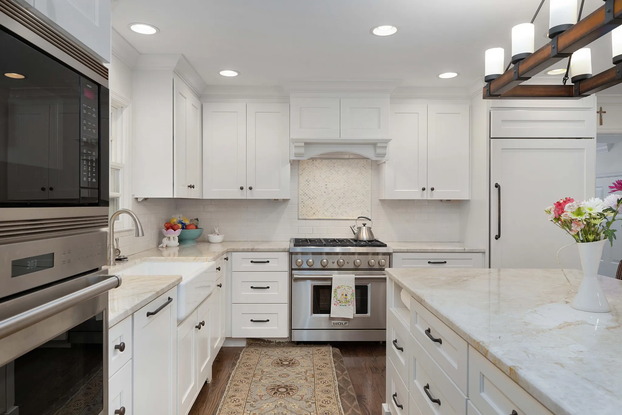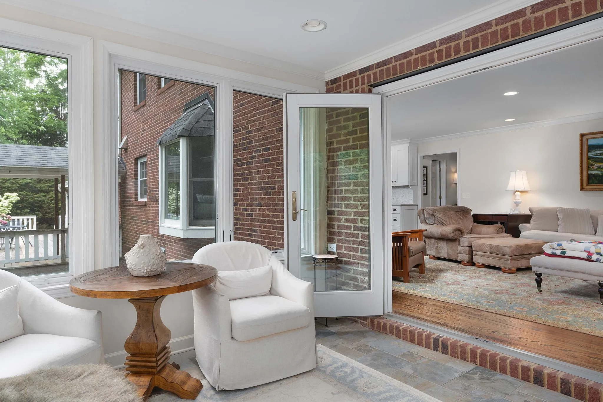 Beautifully updated 4 bedroom, 2.5 bath home on a .70 +/- acre lot in Lookout Mountain, TN and boasting a 3 car garage with an adjoining 2 bedroom, 1 bath, 721 +/- square foot guest apartment. This all-brick home boasts a wonderful blend of the traditional and modern amenities, with both formal and informal living spaces, an open floor plan, hardwood floors, crown moldings, recessed and decorative lighting, granite countertops, custom cabinetry, wonderful natural lighting, great storage, spacious rooms and more! Your tour of the main level starts with the dedicated foyer with a central powder room, the dining room to the right, the living room to your left and the kitchen, breakfast, and great room towards the back. The dining room adjoins the kitchen via a built-in workspace, and a nearby refreshment center with a sink and Subzero wine fridge conveniently services all of your gathering and entertaining spaces. The kitchen has a large center island, cabinet style Subzero refrigerator and kitchen aid dishwasher, Wolf range with a gas cooktop, a 2nd Wolf convection wall oven, Wolf microwave, under cabinet electrical outlets, a walk-in pantry and is open to the breakfast area which has one of several built-in window seats and a bay window. The great room has a wood burning fireplace with built-ins on either side and French doors to a lovely sunroom with a tile floor and fantastic casement windows to let in a mountain breeze. Just off the kitchen you will find a side entry and foyer with French doors, 2 closets, a large laundry/mud room and a family room. The laundry room has a tile floor, bench seat, cubbies, hanging rack, space for an extra fridge and access to the rear deck and breezeway leading to the garage and guest quarters. The family room has another fireplace, French doors to the deck and great closet space. Head upstairs where you will find all if the bedrooms and a landing with a wall of bookshelves – the perfect spot to curl up with a book.