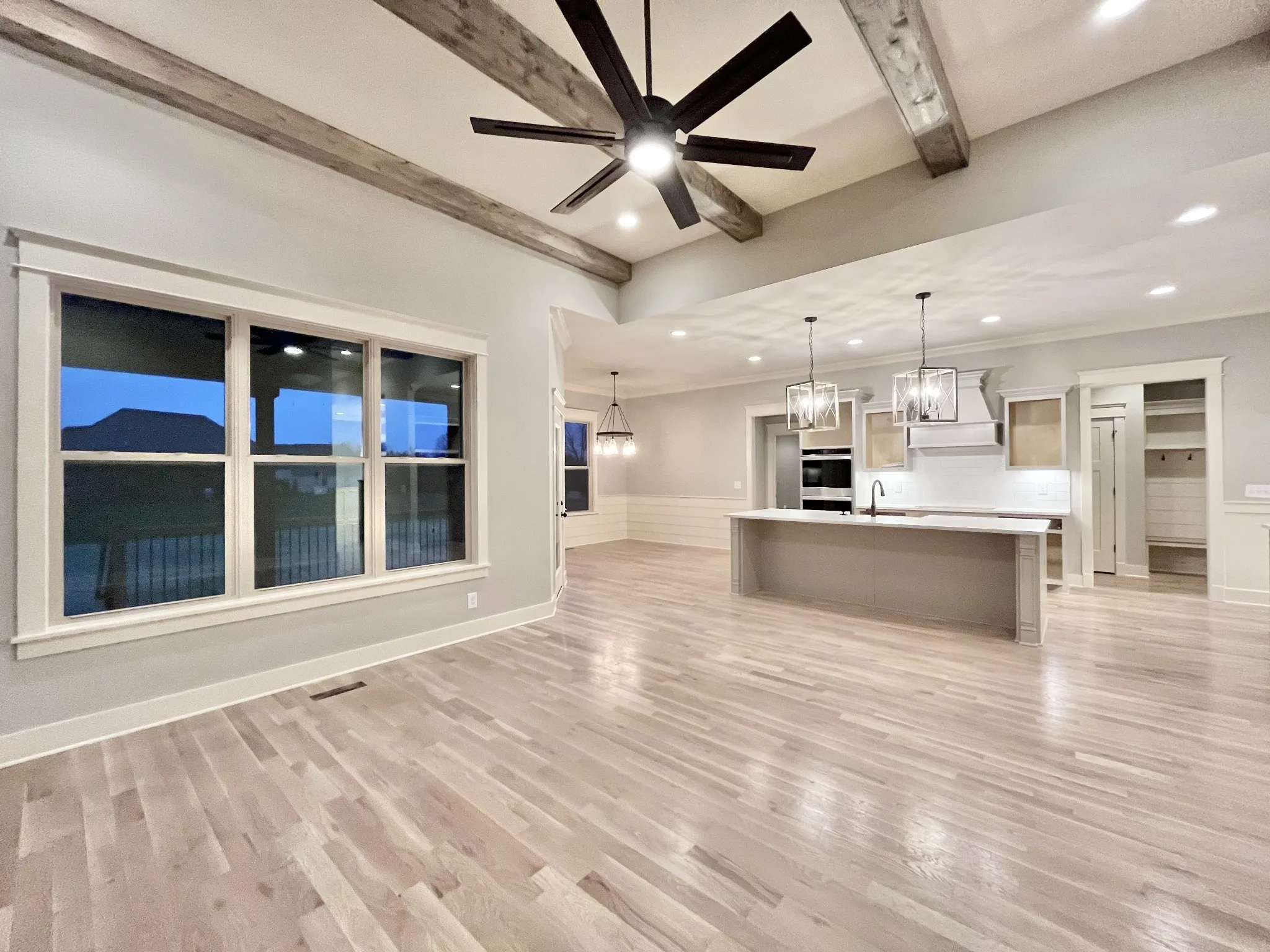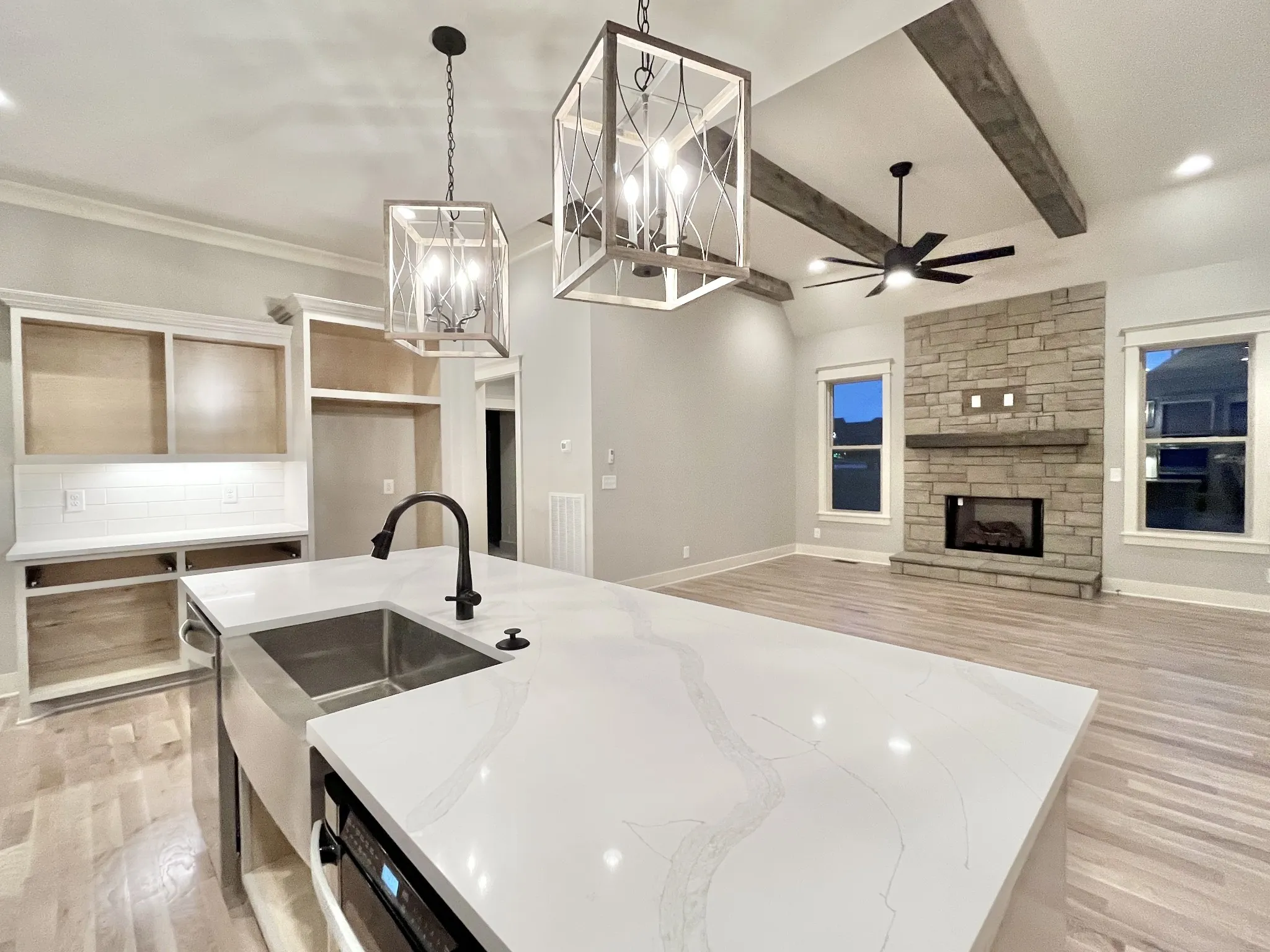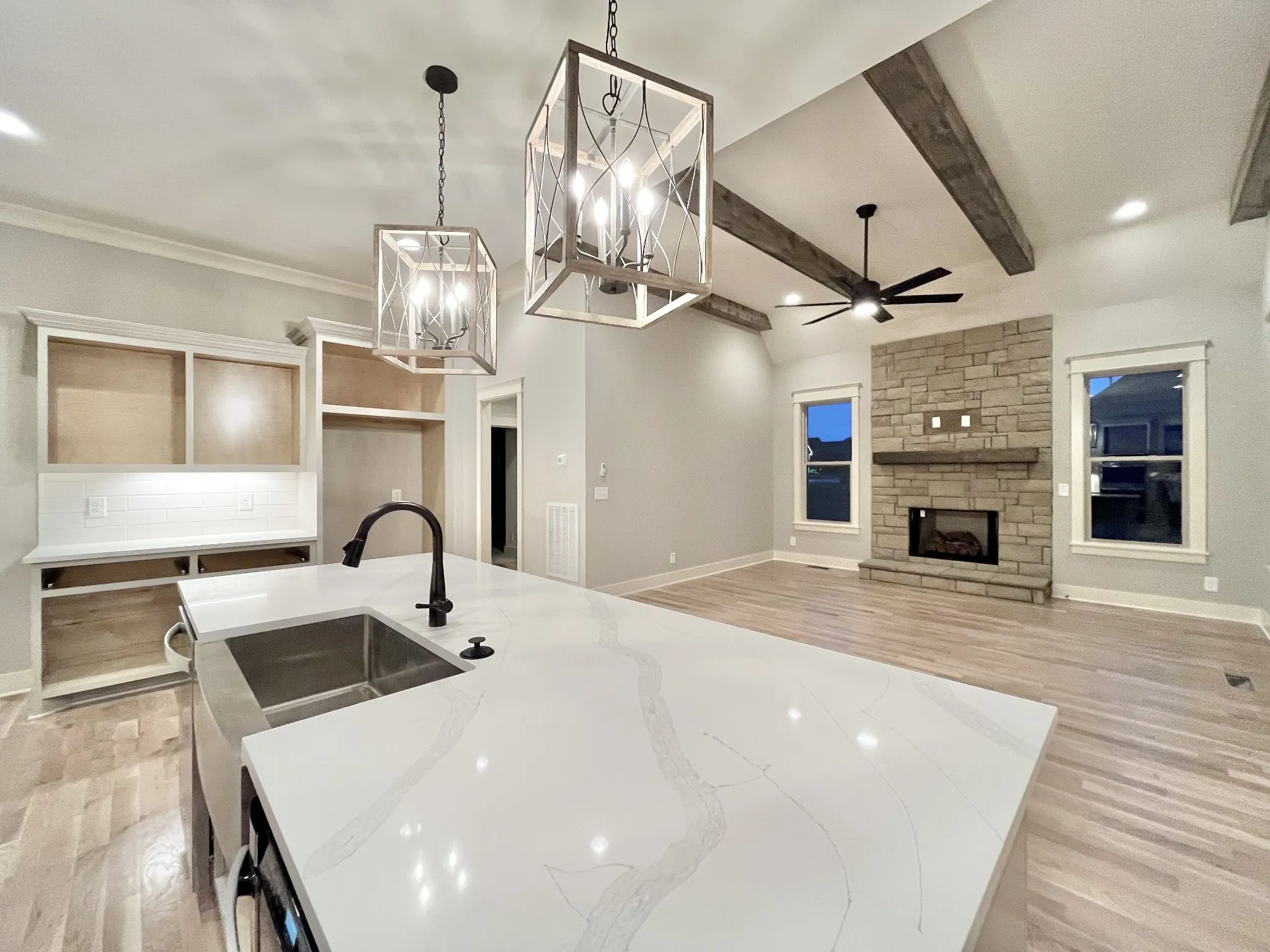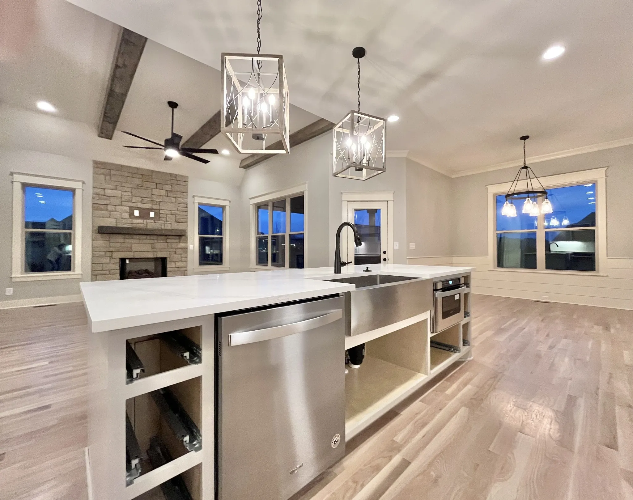 Peyton plan, Exceptional Quality by Eastland Construction, Great Rm w/ Gas Fireplace and Wood Beams, Primary BR on Main Level, Island Kit with Granite, Tile Backsplash, Under Cabinet Lighting, Formal Dining Rm, Primary Bath with Granite & Sep Tub and Shower, Hardwood Floors in Foyer, Dining, Kitchen, Great Rm, and Primary BR, Located on Great Cul-De-Sac-Lot, 30×20 Recreation Rm over 3 Car Garage with Separate Office, Preferred Lender Program for Interest Rate Buy down and/or Closing Cost available.