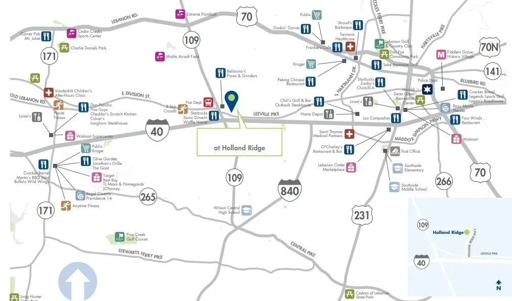 - Directions: From downtown Nashville, take I-40 E to TN-109 N in Lebanon. Take exit 232B from I-40 E 20 min. Continue on TN-109 N. Take Leeville Pike approximately 1 mile. Community entrance is on the left.