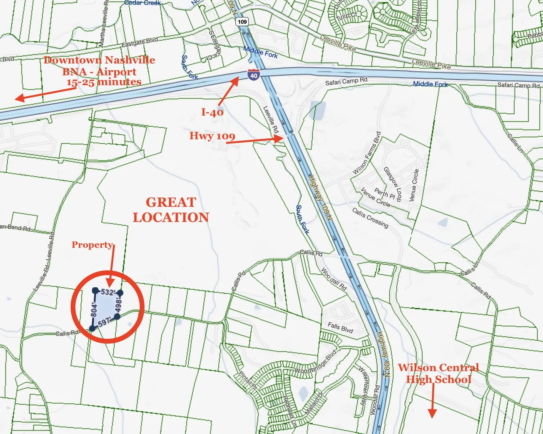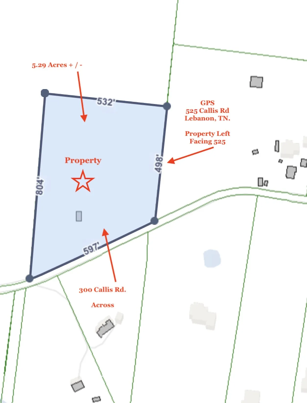 GREAT location, 20-25 Minutes from BNA & Nashville, 5-minutes from exit 232 @ Hwy 109 / I-40 with Publix, Resturants, shopping and all your needs within minutes. Also, 8-10 Minutes from the heart of Lebanon in one direction and same to Mt. Juliet in the other. Drive Callis Rd and See all the AMAZING Properties & Country Setting yet close to everything! PLEASE NOTE: FOR GPS Use 525 Callis Rd. Lebanon and property and this property is to the left and/or 300 Callis Rd and it’s Diagonal Across the street.
