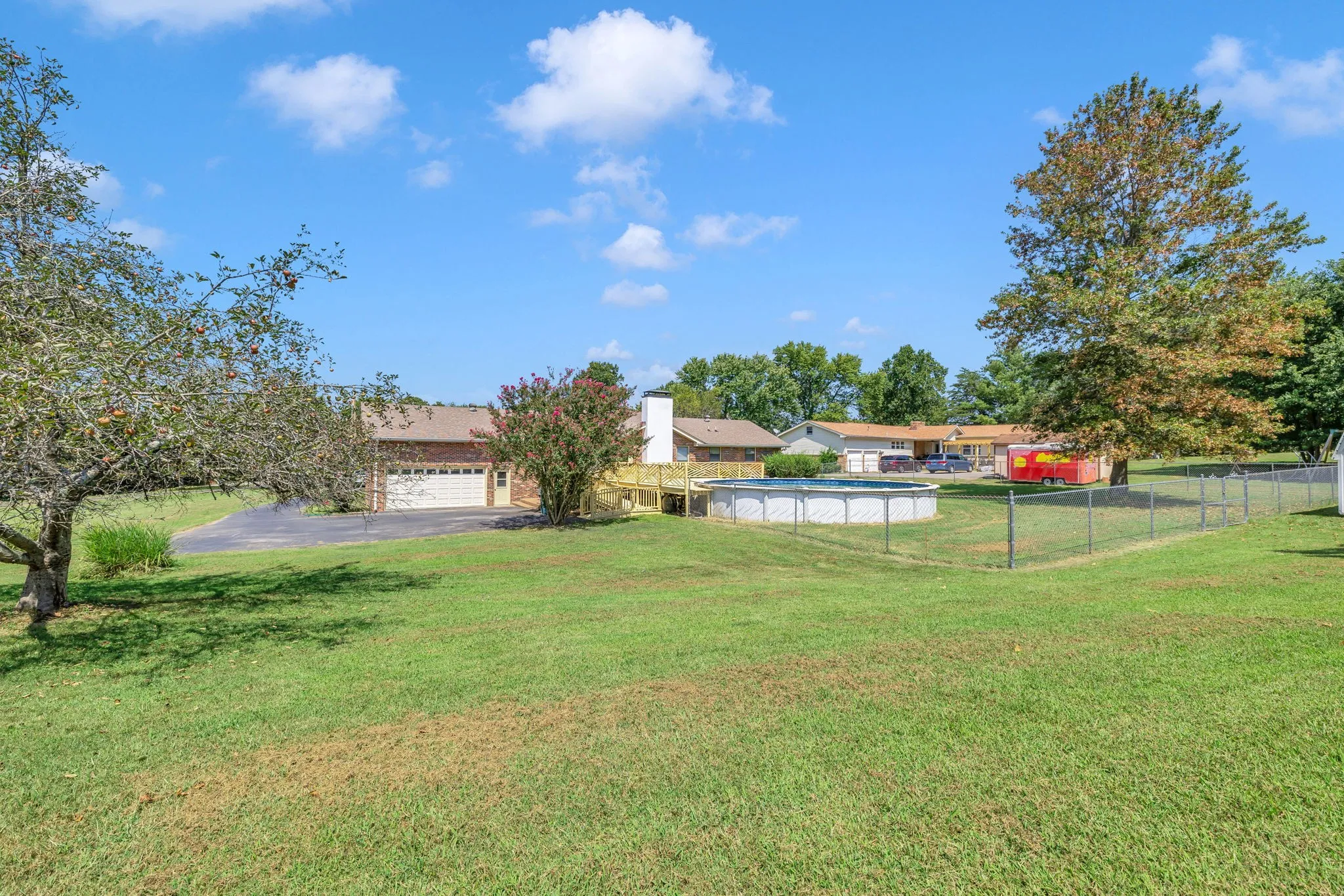 This stunning upgraded all brick ranch style home sits on a cul-de-sac on over an acre with new paint throughout, newly finished hardwood floors, new carpet, stunning wood accent beams in the living room and an enormous kitchen perfect for your next gathering! It includes a freshly painted oversized garage and a charming pool surrounded by a gorgeous custom wood deck! HVAC 2021 and fresh landscaping make this turn-key! The seller has spared no expense to make his home perfect for you! The location is just minutes from shopping, restaurants and plentiful amenities for the family! No HOA allows for endless possibilities!