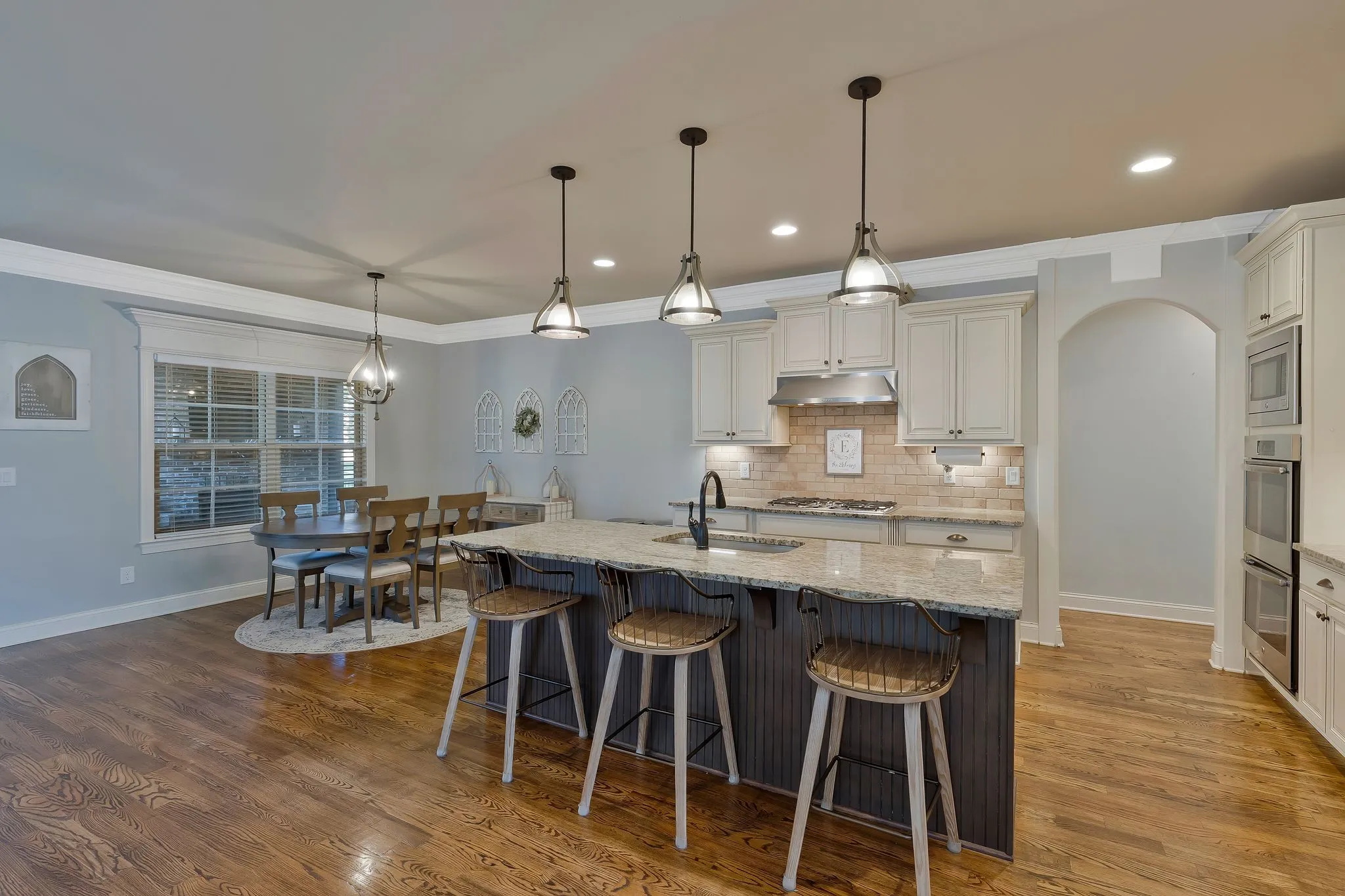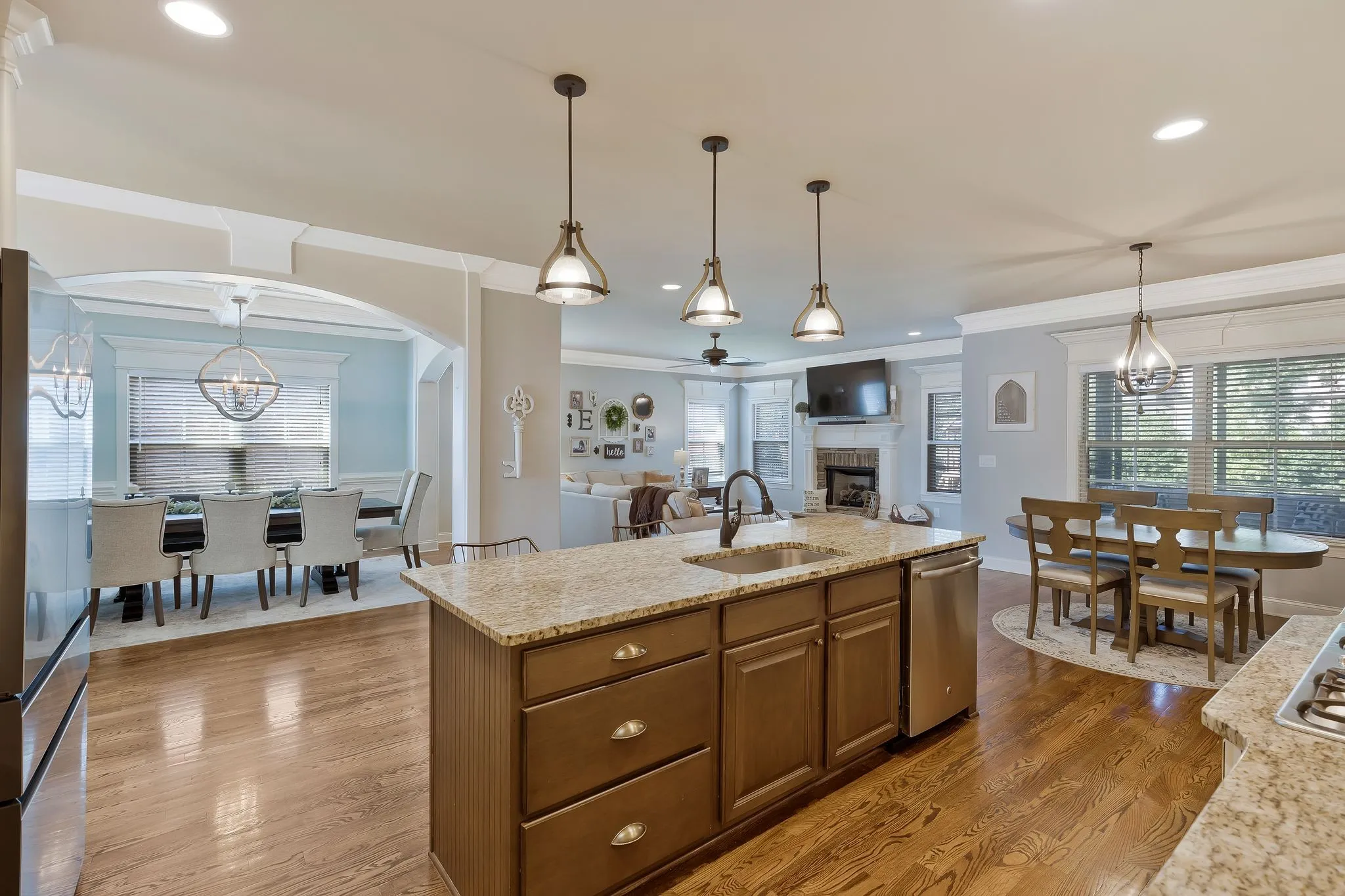 All brick custom home built by Clark custom homes – master suite and guest bedroom on main floor, 3 car side entry garage, covered porch and back patio with fireplace, fenced back yard, Beautiful kitchen with stainless appliances, double oven, gas cooktop and a large island all with granite counter tops. Coffered ceilings in the formal dining room, Sanded and finished hardwood floors throughout main floor. Tankless hot water. Mature oak trees in the back yard provide natural shade for the patio and keep the sun off the windows in the afternoon.