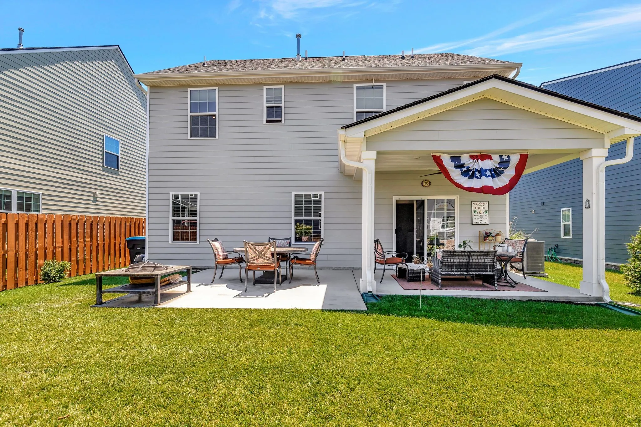 "LongDescription" => "Lovely covered back porch off main dining area with sliding doors and extended paved patio for dining, level grass lawn with irrigation and trees planted on property lines."