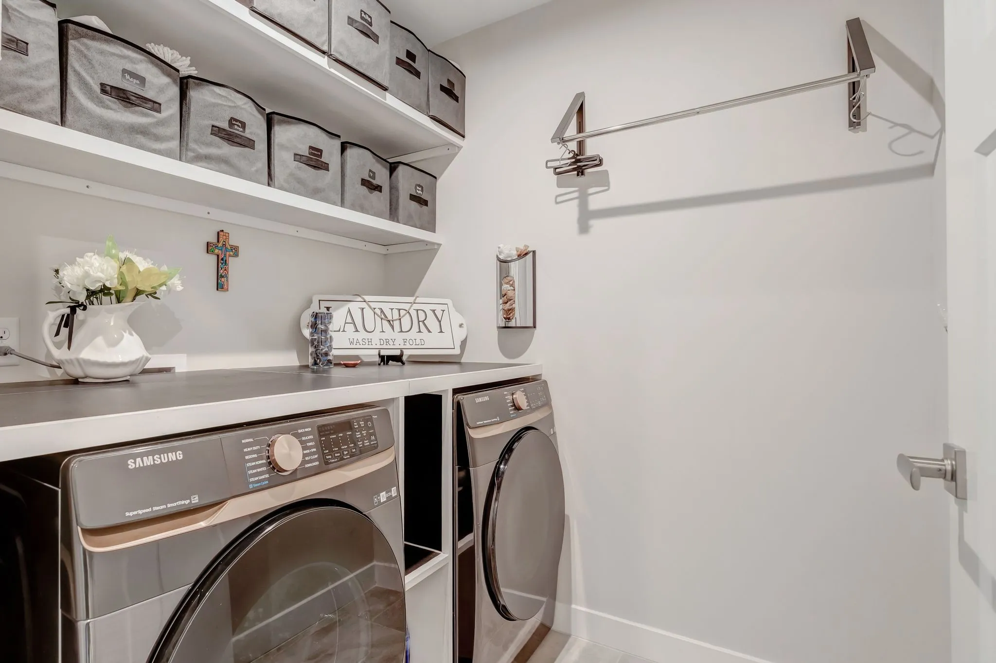 "ShortDescription" => "Elevated laundry room on second floor bedroom level, with custom counters and shelving put in and side bar for drying."