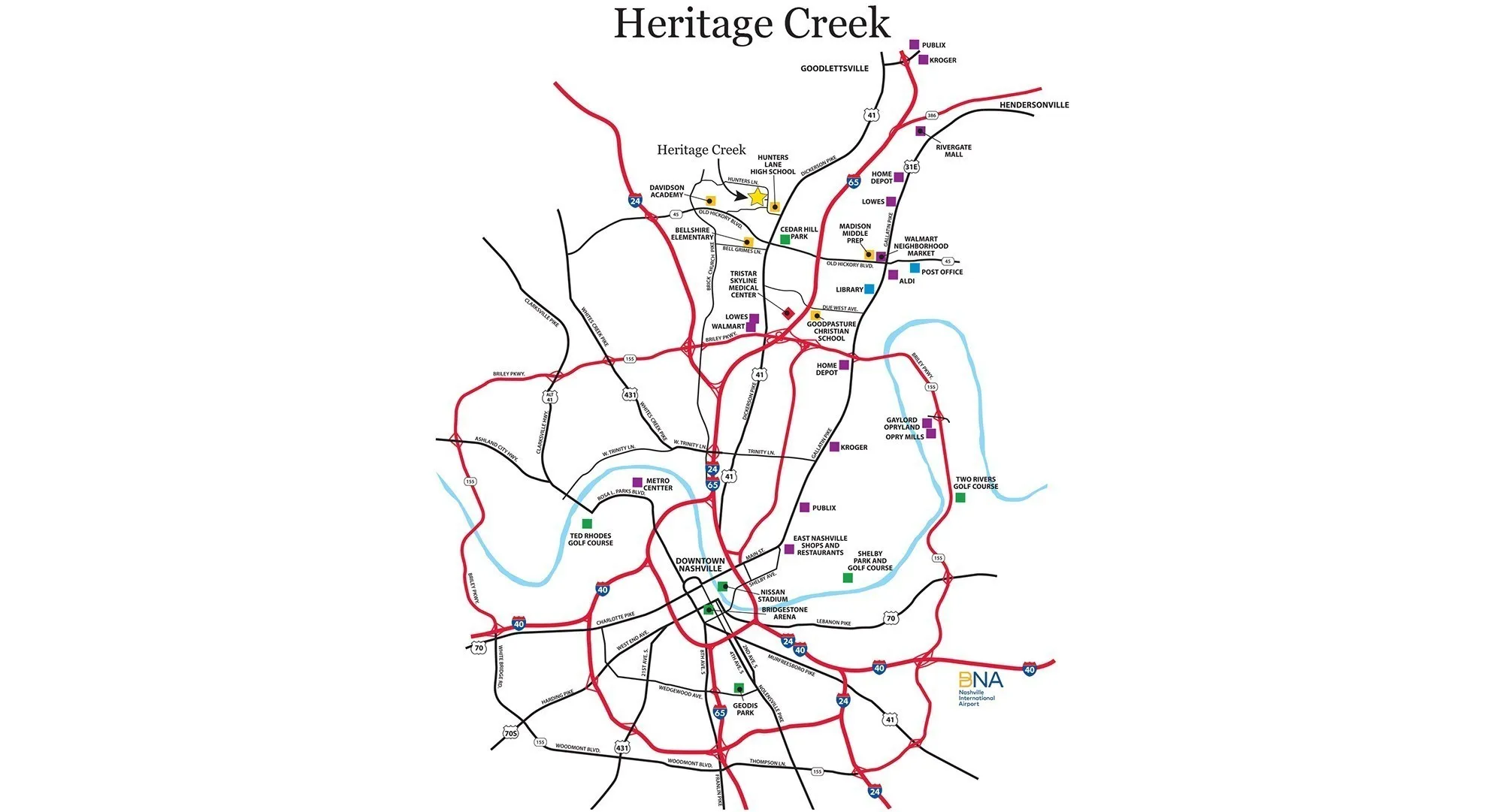 - Directions: From Dowtown Nashville: Take exit 92 from I-65 N, Turn left on TN-45 W/W Old Hickory, go 1.1 mi Turn right onto Dickerson Pike, after 0.6 Turn left onto Hunters Lane, Heritage Creek is approximately 1 mile on the left. 2017 Creekland View Blvd