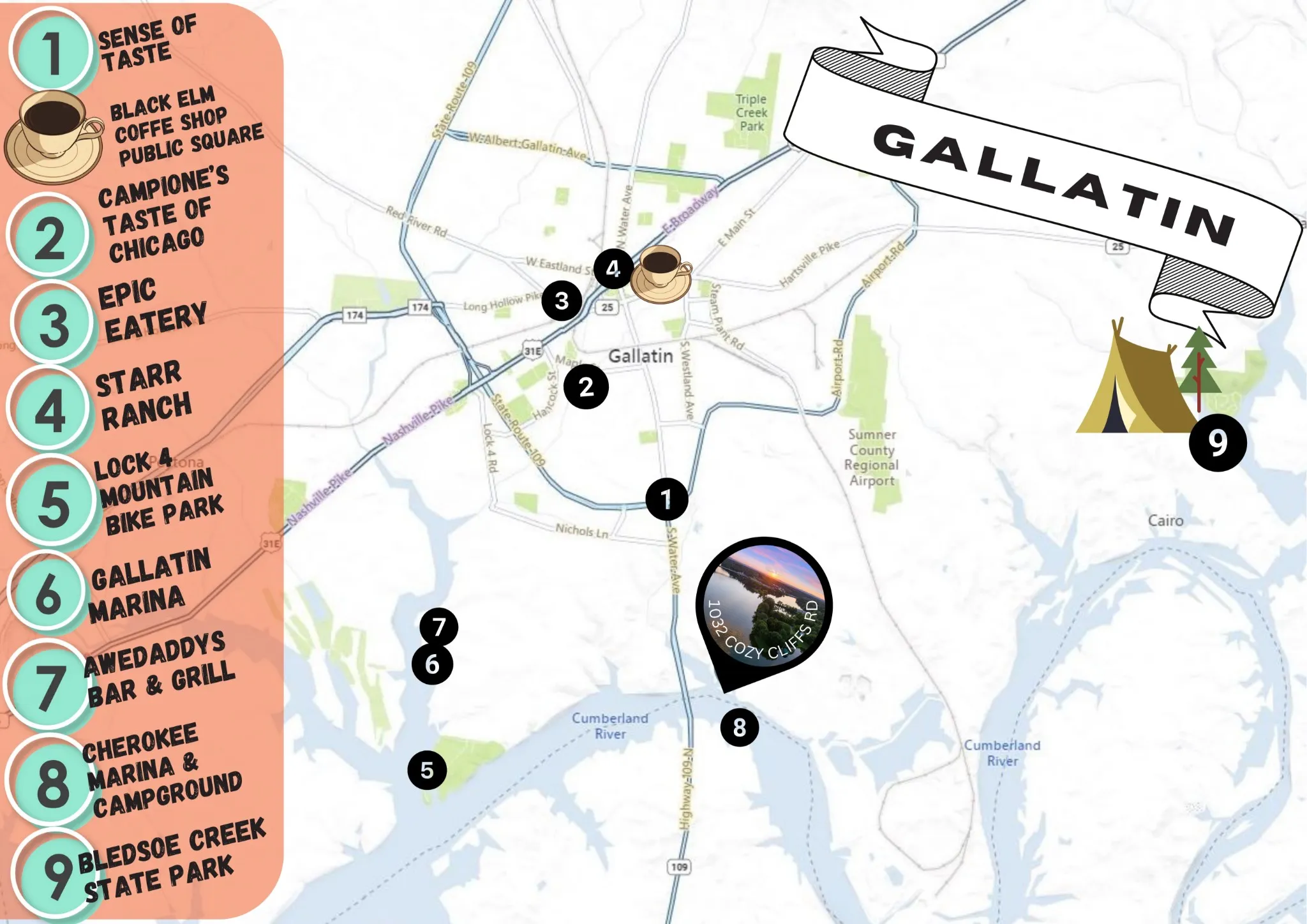 - Directions: : From Mt Juliet, take 109 North, Go over the 109 bridge and take a right on Odoms Bend Rd, first road past boat ramp take a right on Cozy Cliffs Rd. The property is at the dead end.