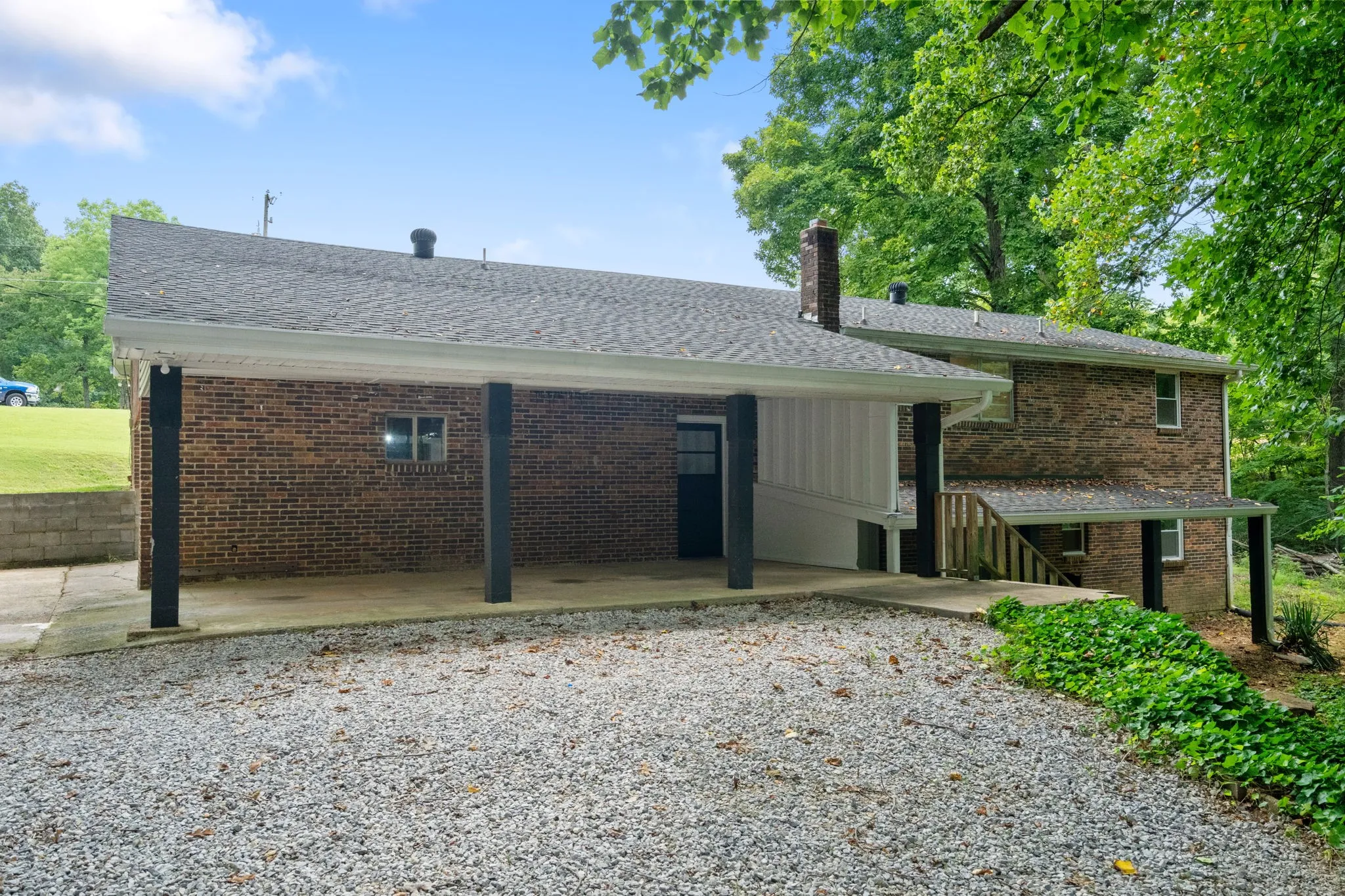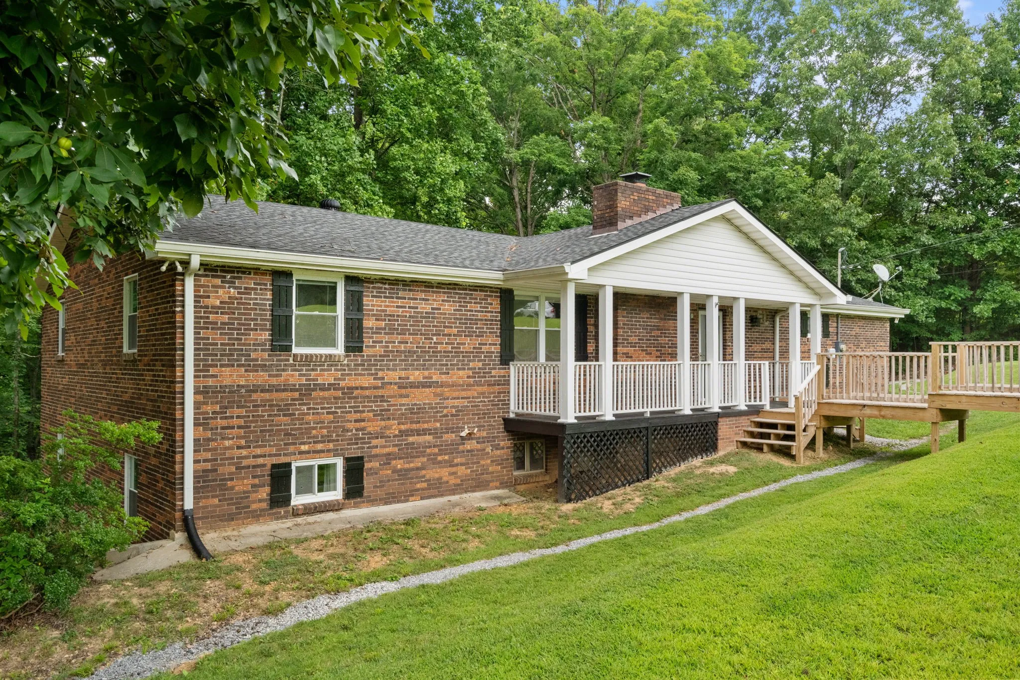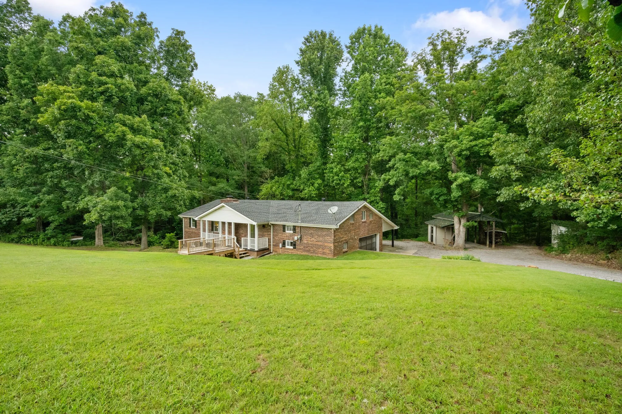 Seller offering $10,000 in Seller Concessions for Buyer to use anyway they wish!!! Multigenerational living possible on this property with 2 treed tracts (totalling 13.78+/- acres) with wet weather creeks . Enter the all brick home on the main floor through the covered front porch (or the garage pedestrian door). The main floor has 2 bedrooms, 1 full bath, kitchen, dining room, living room, office, and laundry room. The second living space is a walk out basement that has 2 bedrooms, 1 full bath, kitchen, living room with fireplace, large storage room with exterior door to patio area that overlooks the wooded acreage, and a pedestrian door to the garage. The third living area is a separate space over the large 2 car garage. This space has a full bathroom and two areas with lots of possibilities. There is a cute out building setup to BBQ. The land is ideal for the outdoor enthusiast.