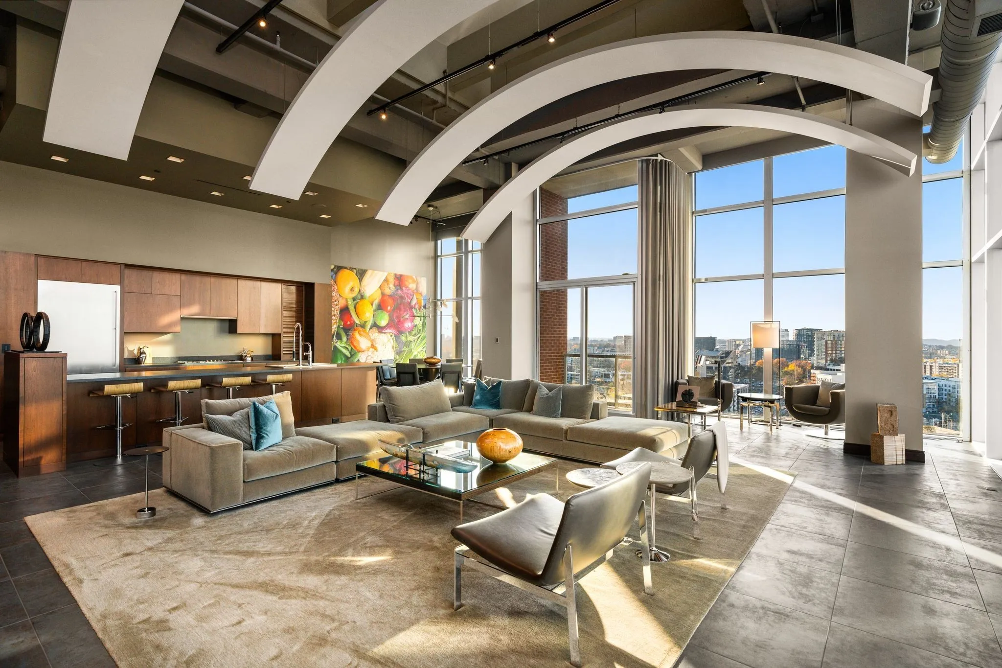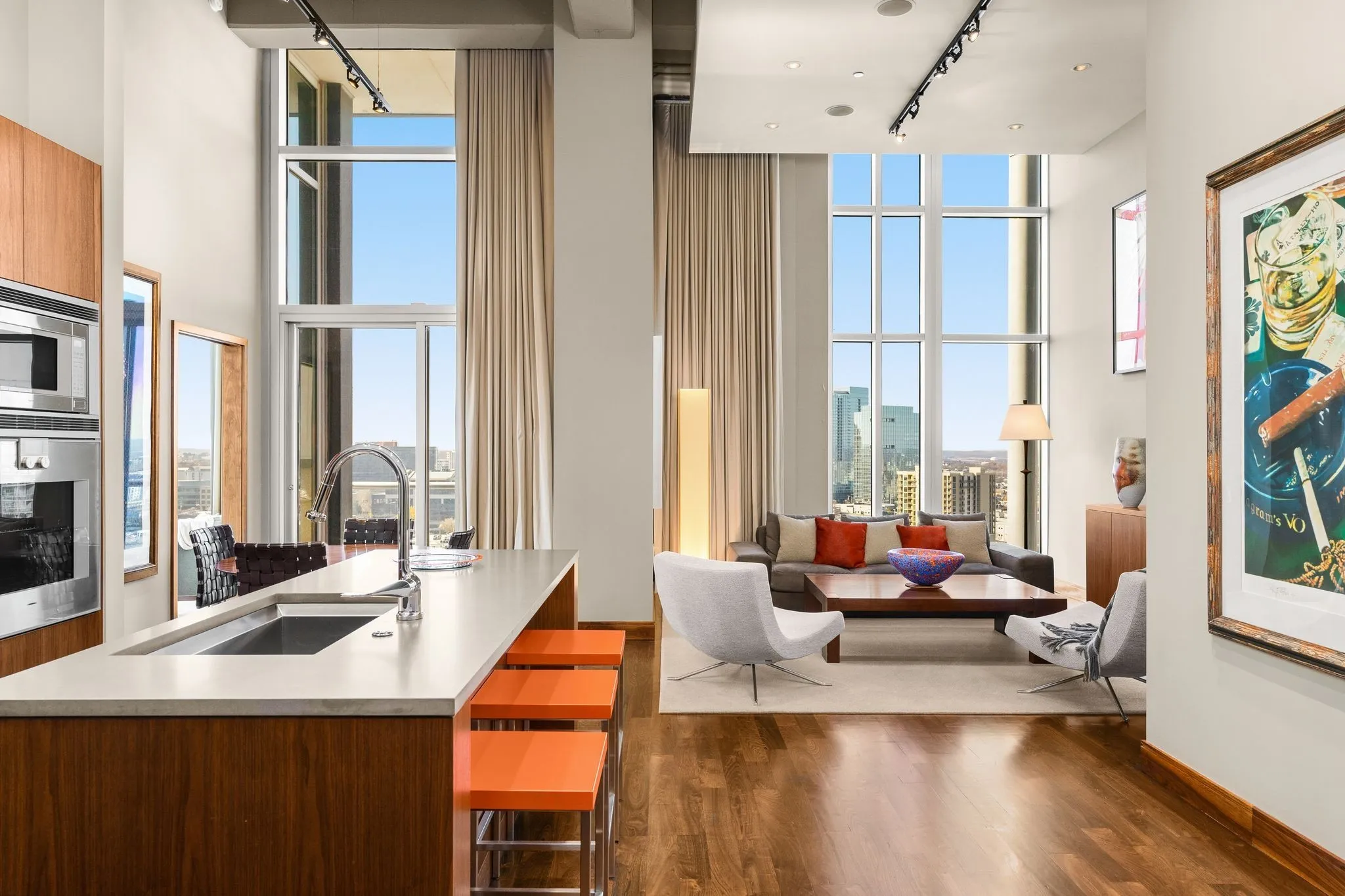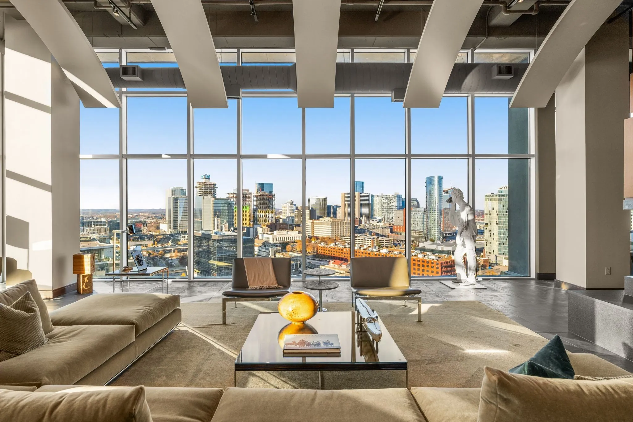 Elevated 200 feet above the vibrant streets of the Gulch, the ICON penthouse includes a 3,055 square-foot primary residence and a thoughtfully designed 1,160 square-foot guest residence. Originally comprised as four distinct penthouses, they have been masterfully merged to form an expansive 4,215 square-foot residence occupying half the building’s 22nd floor. Floor-to-ceiling windows envelop the space, offering an unparalleled vantage point to behold Nashville’s flourishing downtown skyline, Nissan Stadium, and breathtaking vistas of both sunrise and sunset over Tennessee’s rolling hills.