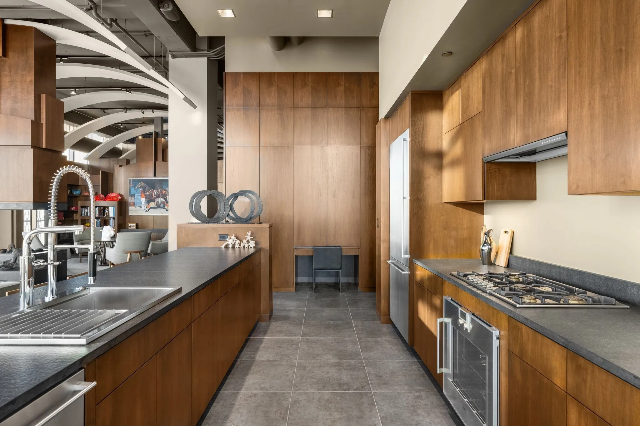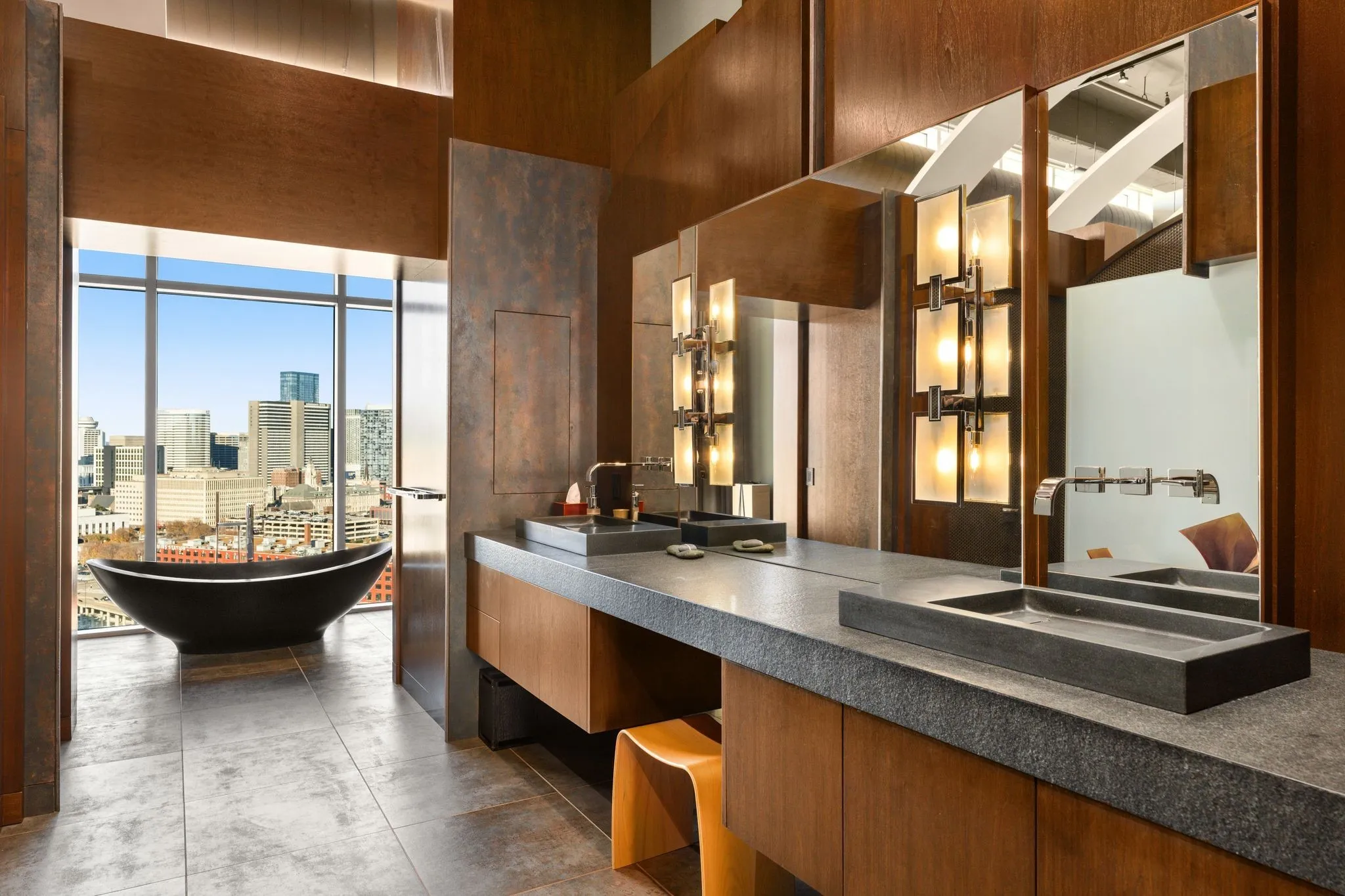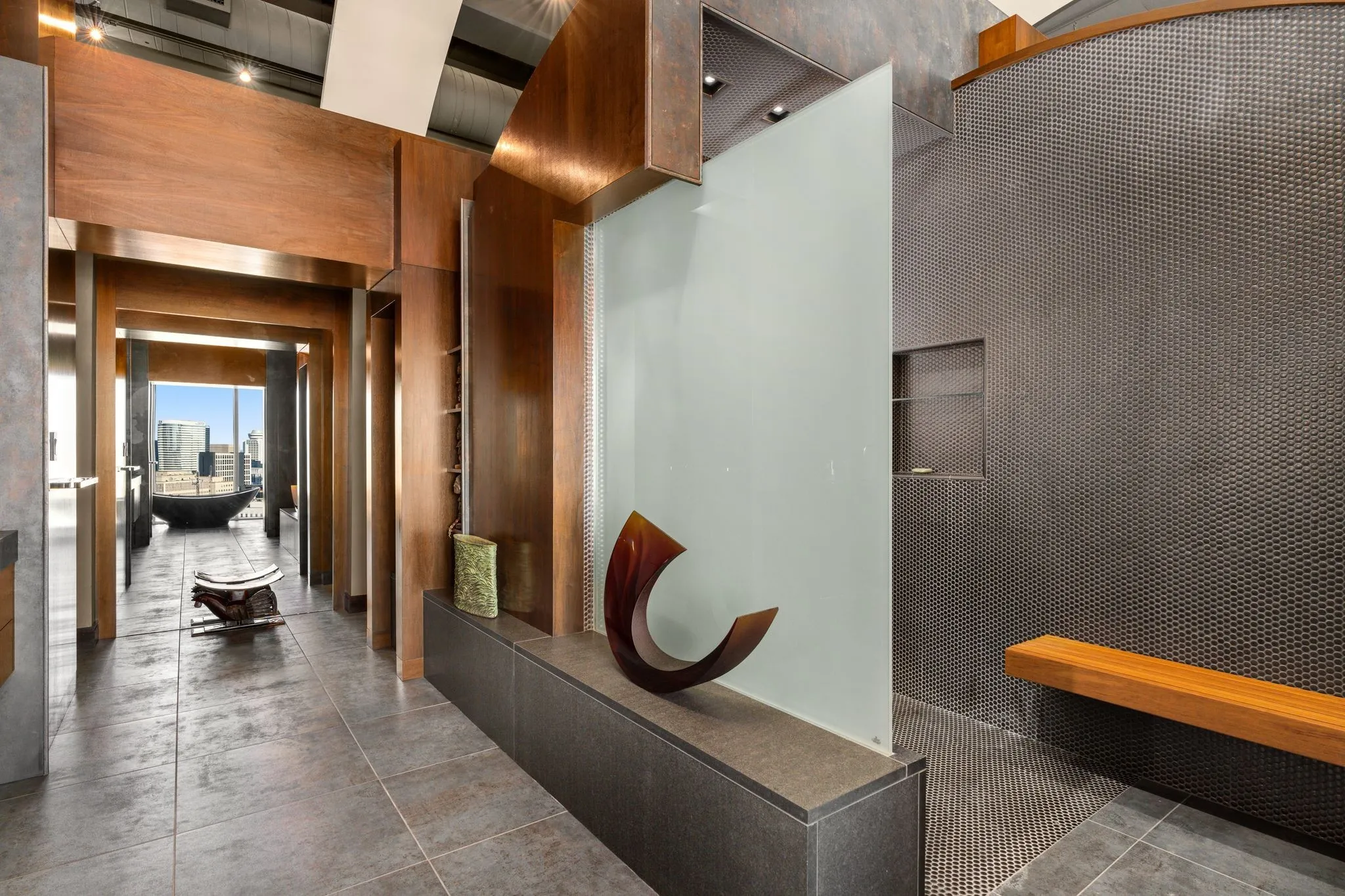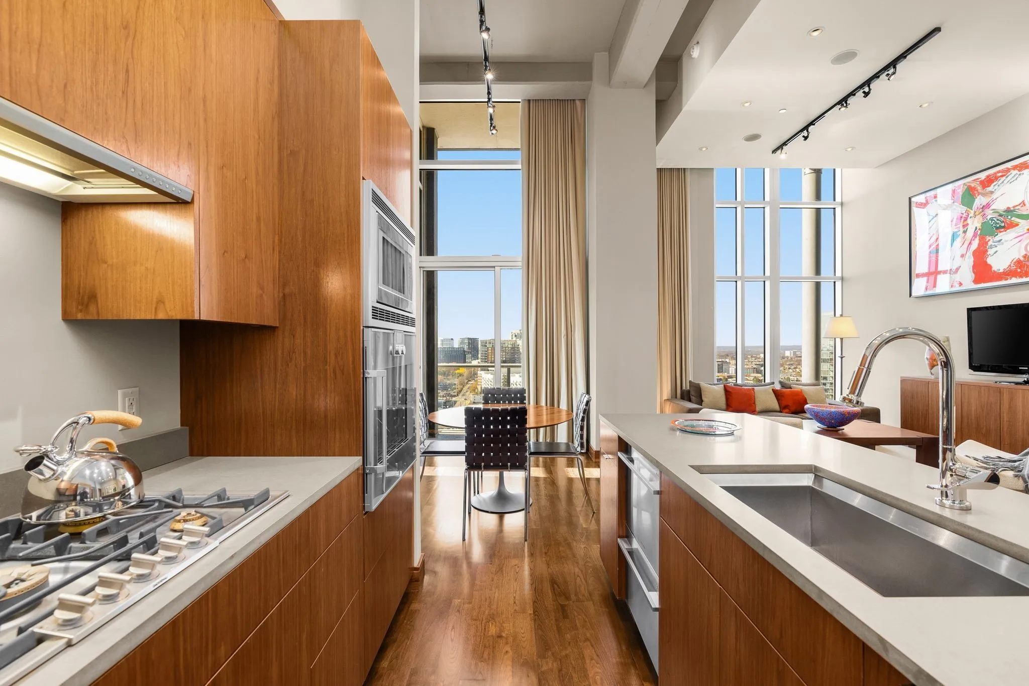 Elevated 200 feet above the vibrant streets of the Gulch, the ICON penthouse includes a 3,055 square-foot primary residence and a thoughtfully designed 1,160 square-foot guest residence. Originally comprised as four distinct penthouses, they have been masterfully merged to form an expansive 4,215 square-foot residence occupying half the building’s 22nd floor. Floor-to-ceiling windows envelop the space, offering an unparalleled vantage point to behold Nashville’s flourishing downtown skyline, Nissan Stadium, and breathtaking vistas of both sunrise and sunset over Tennessee’s rolling hills.