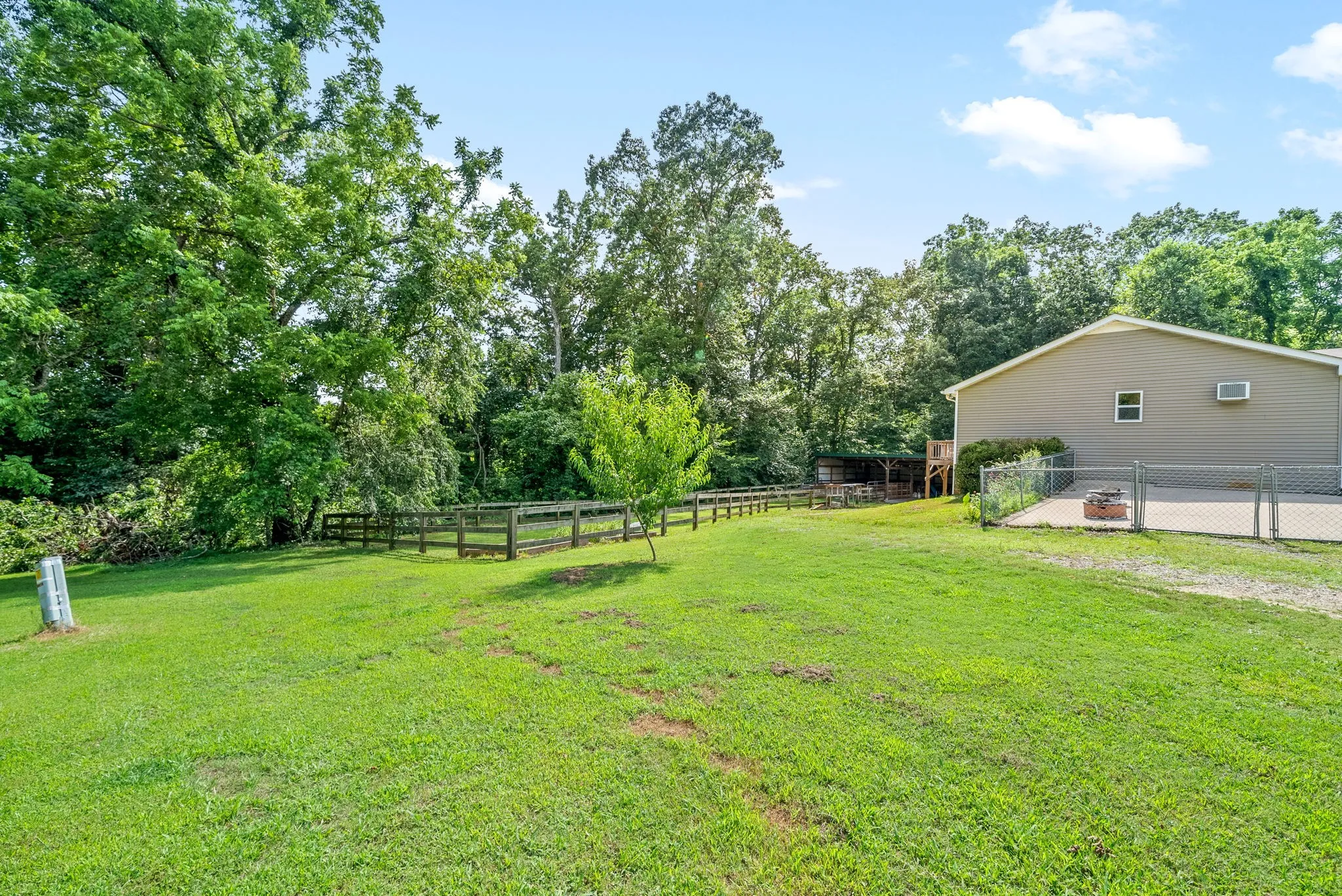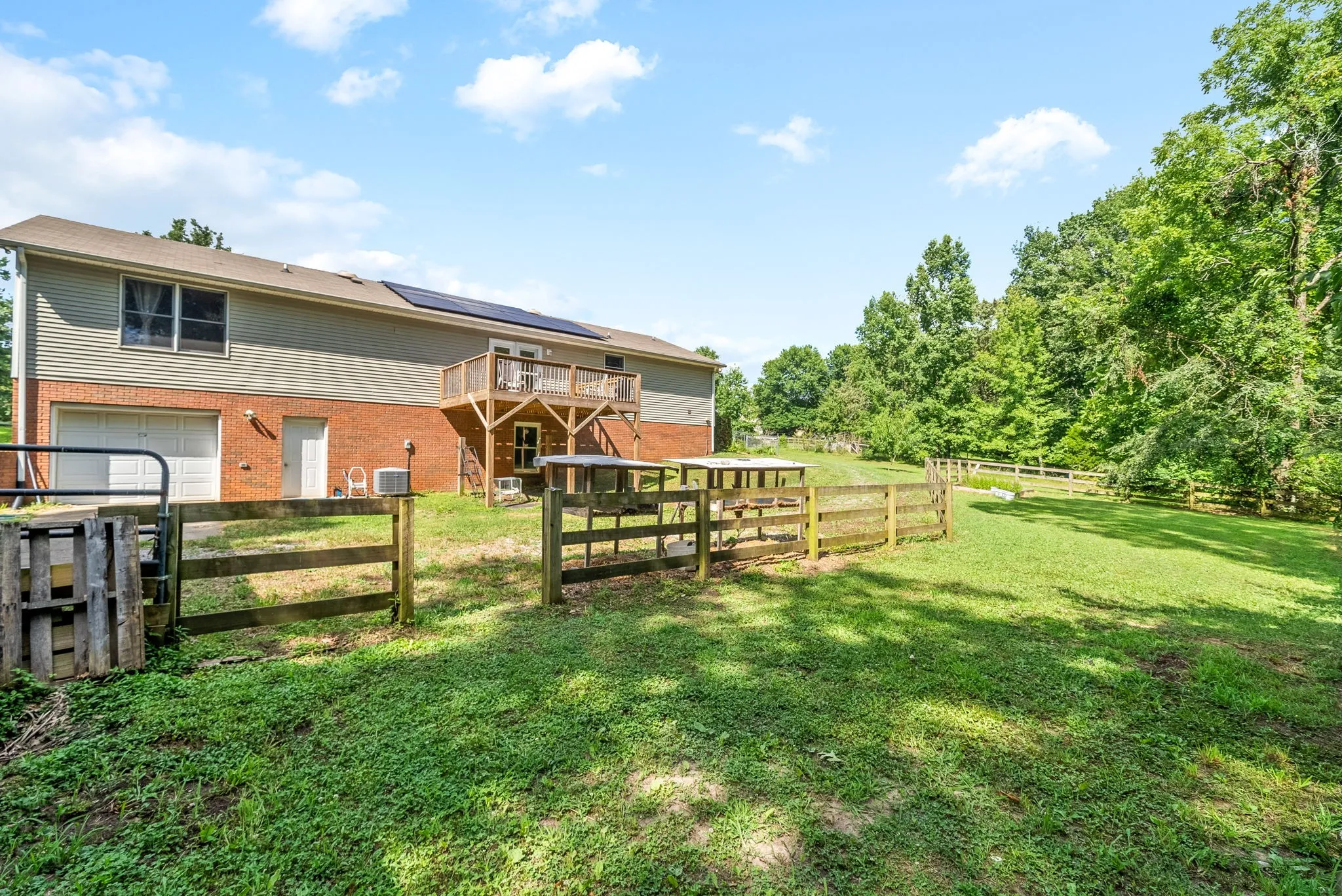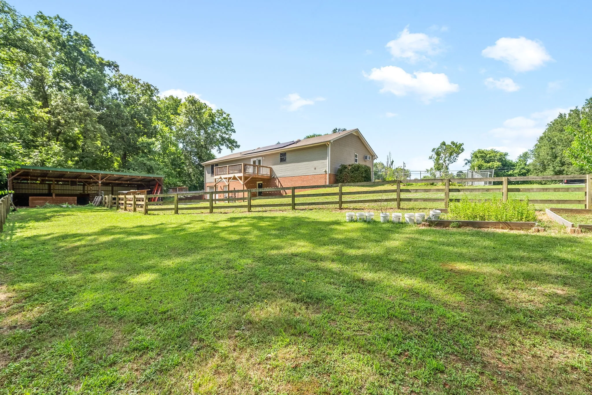 Beautiful move-in ready home on 2.08 acres in Clarksville! This unique home sits far back off the road for privacy and features a 4 bedroom layout with 2 separate master suites on either end of the home, a full basement with 9 foot ceilings throughout that is perfect for expansion and tornado shelter, huge closets with tons of thoughtful storage spaces, a detached shop with 2 horse stalls, fenced horse run and a concrete parking area, fenced front yard area for dogs or kids, hardwood floors throughout the entire home (no carpets!) and more! Recent upgrades include antique wood accent walls, new butcher block countertops, new range, new LVP flooring in 4th bedroom and kitchen, new back deck and private driveway. Convenient to Fort Campbell and Clarksville yet unrestricted and outside city limits. All kitchen appliances and paid off solar panel system remain! come check out this beautiful home today!