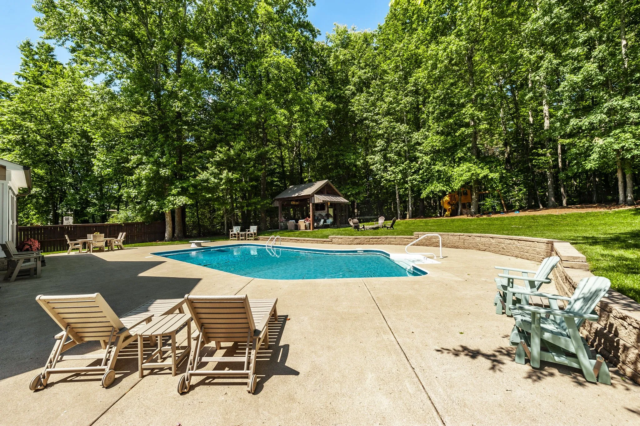 "LongDescription" => "From this vantage point, the pool shimmers like a jewel amidst the lush greenery of the expansive backyard."