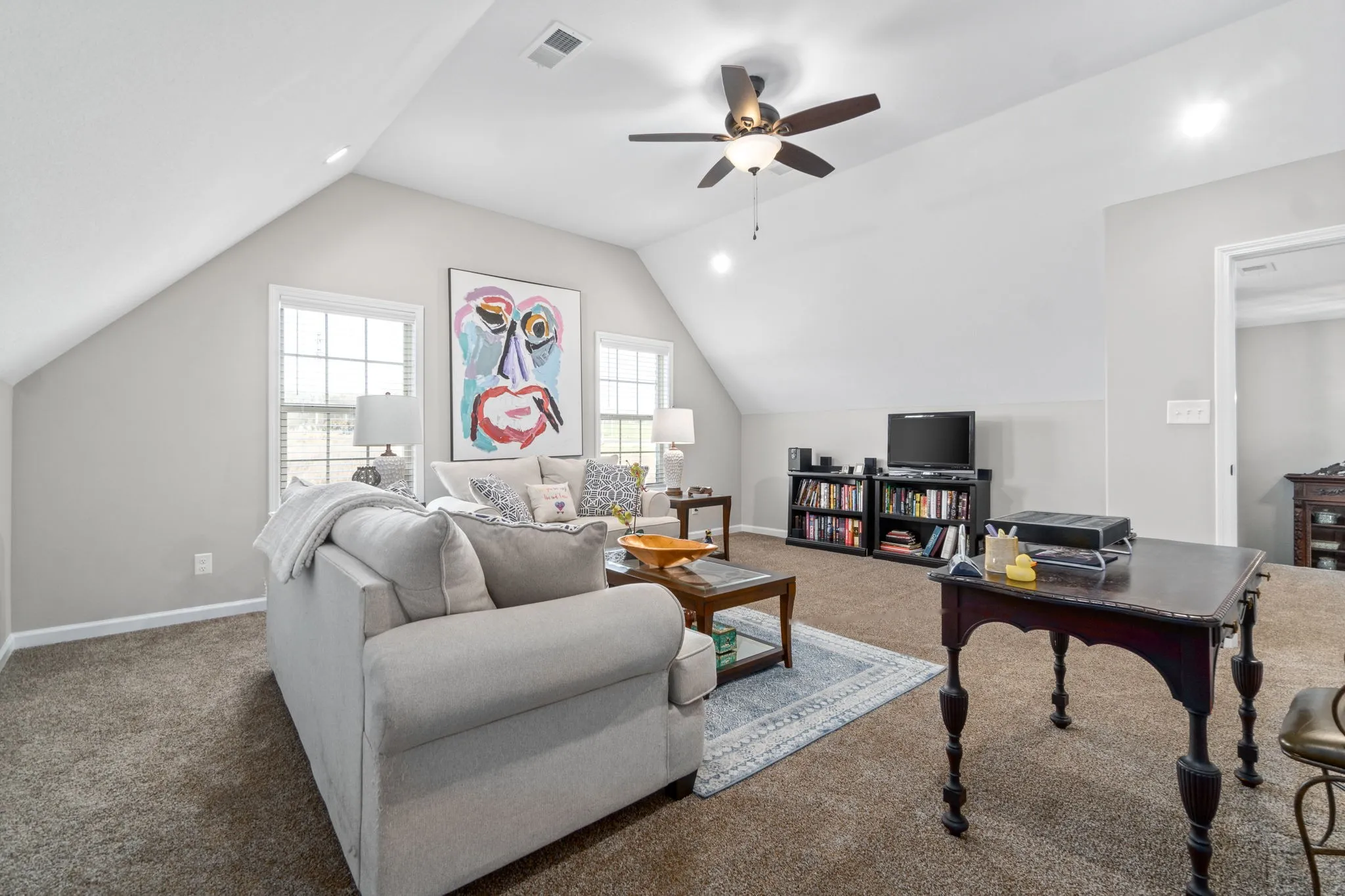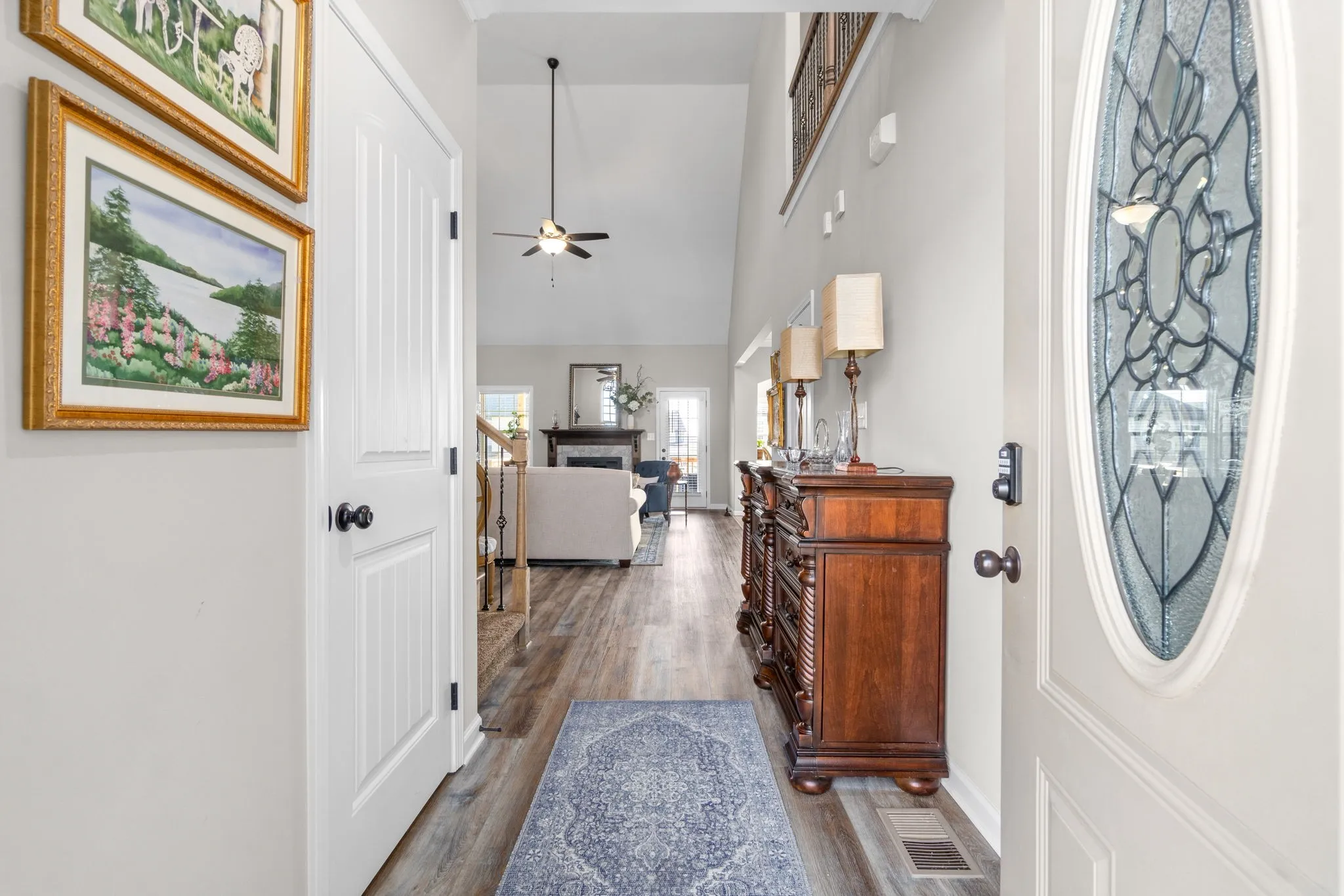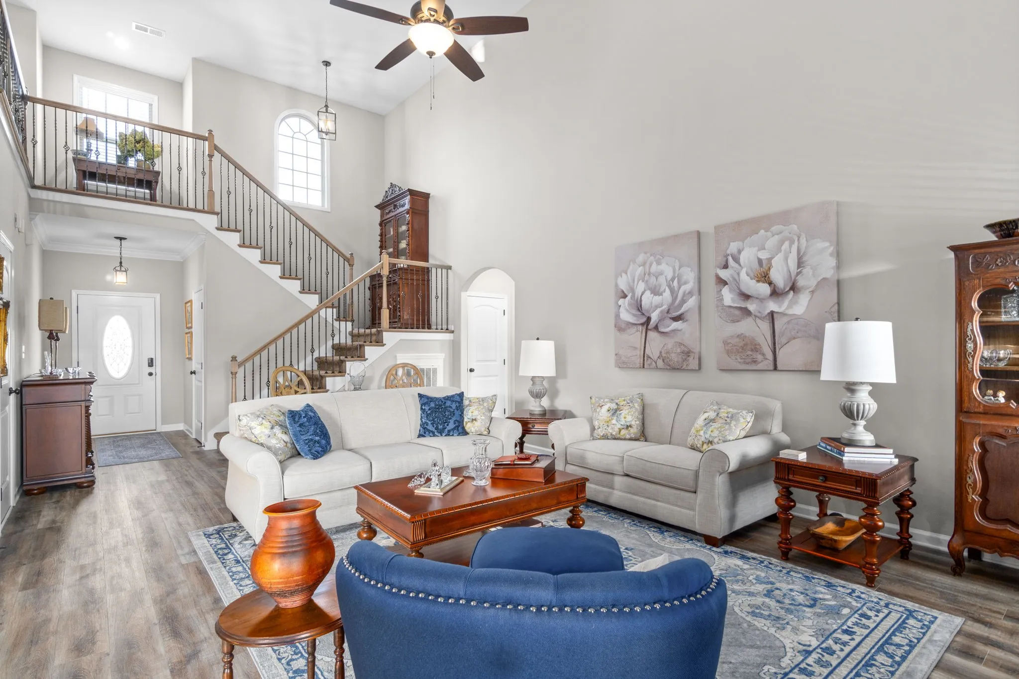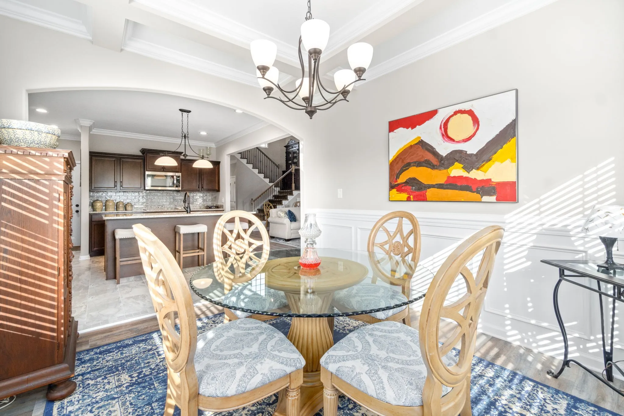 Ready to wake up to the Morning sun streaming into the kitchen from your new backyard?! Well look no further. This home has been meticulously kept and better than new. Soaring Ceilings gives way to tons of natural light. Eat in Kitchen boasts SS appliances, double ovens, granite counters, breakfast bar, and a large pantry. Formal dining with coffered ceilings. Spacious Primary with jetted tub in ensuite and large walk-in closet located on main level. All large guest bedrooms located on second floor. Huge Bonus, that could also be used as another bedroom. Covered deck, fully sodded front & back, completed backyard fence to meet mandatory HOA fencing requirements. Smart Home.