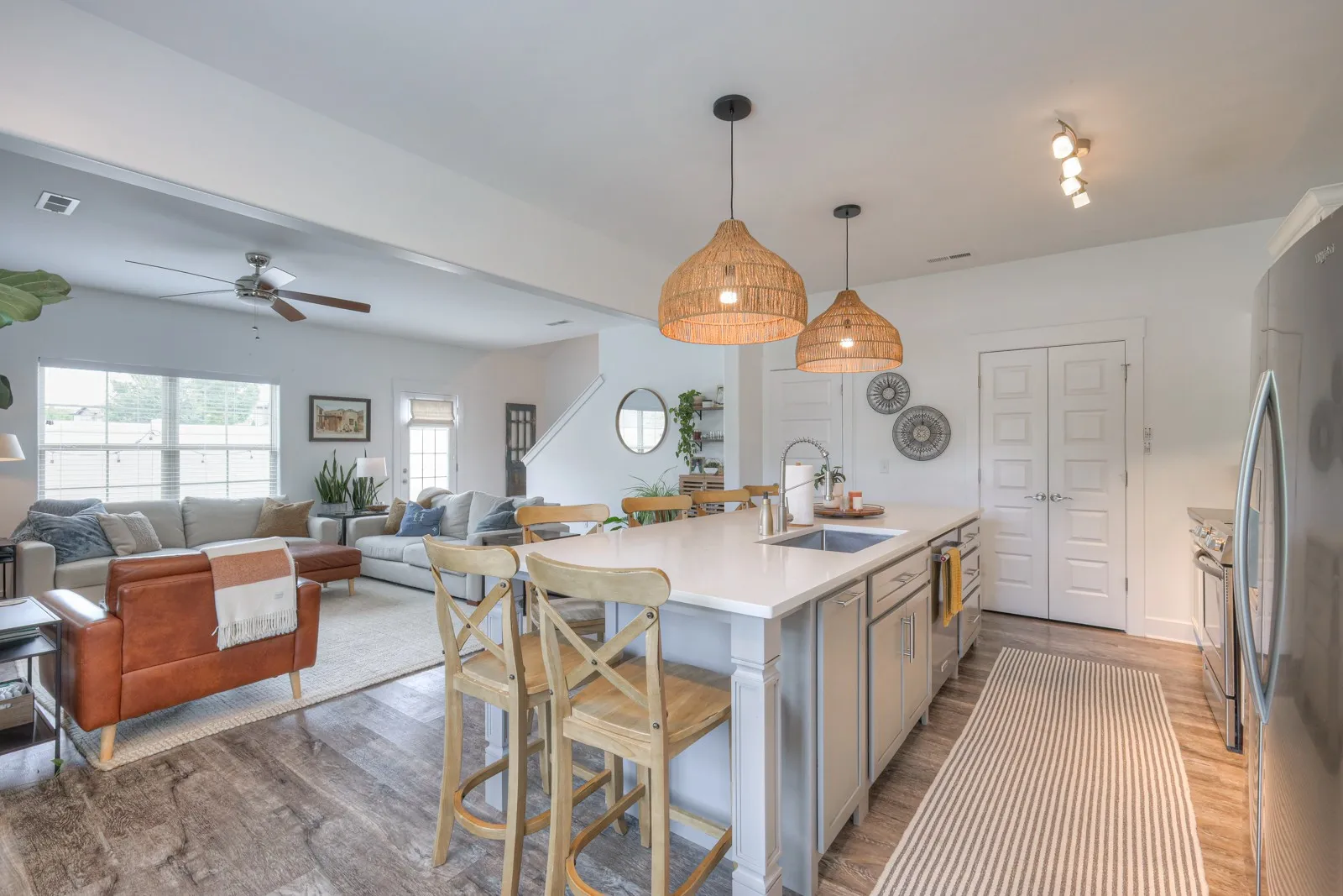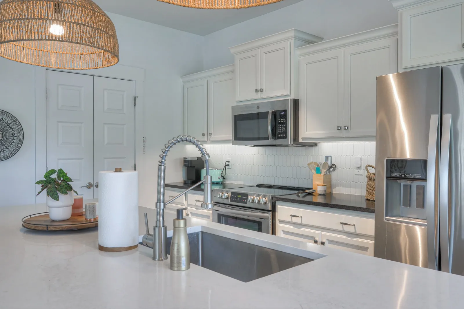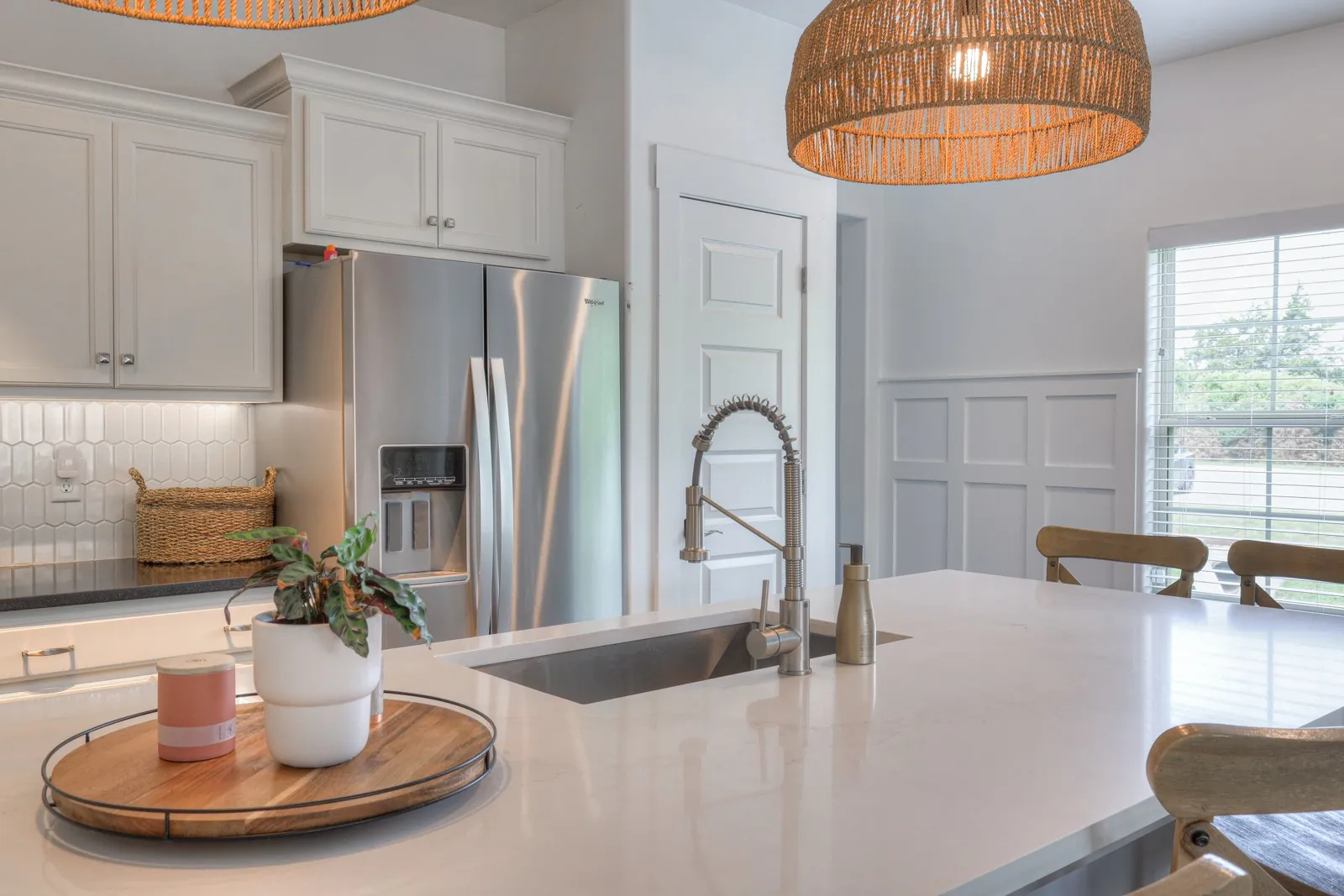 +"PublicRemarks": "Welcome to this beautifully upgraded end unit 3-bedroom, 2.5-bathroom home spanning 1,719 sqft. The heart of the home, the kitchen, boasts a custom island with a Quartz top, upgraded Granite countertops, and a stylish tile backsplash. High-quality appliances include a Whirlpool refrigerator, KitchenAid dishwasher, and Frigidaire slide-in range. Enjoy the freshly painted interior throughout, complemented by elegant white wood 2" blinds and fabric Roman shades on all windows. The home features upgraded light fixtures, including island pendants, an entry pendant, and a sconce in the half bath. Additionally, the carpet has been professionally cleaned, Coated garage floor and the washer and dryer are included. Don't miss this move-in-ready gem!"
