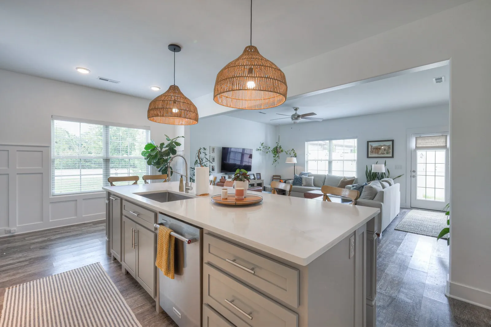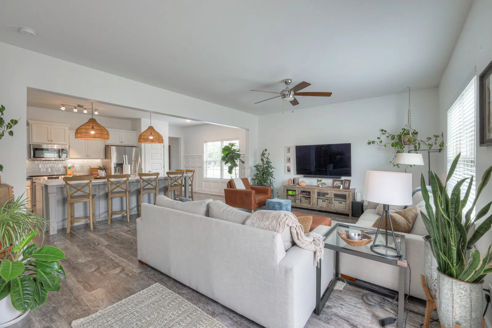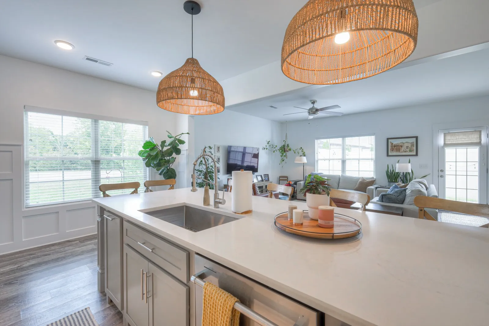 +"PublicRemarks": "Welcome to this beautifully upgraded end unit 3-bedroom, 2.5-bathroom home spanning 1,719 sqft. The heart of the home, the kitchen, boasts a custom island with a Quartz top, upgraded Granite countertops, and a stylish tile backsplash. High-quality appliances include a Whirlpool refrigerator, KitchenAid dishwasher, and Frigidaire slide-in range. Enjoy the freshly painted interior throughout, complemented by elegant white wood 2" blinds and fabric Roman shades on all windows. The home features upgraded light fixtures, including island pendants, an entry pendant, and a sconce in the half bath. Additionally, the carpet has been professionally cleaned, Coated garage floor and the washer and dryer are included. Don't miss this move-in-ready gem!"