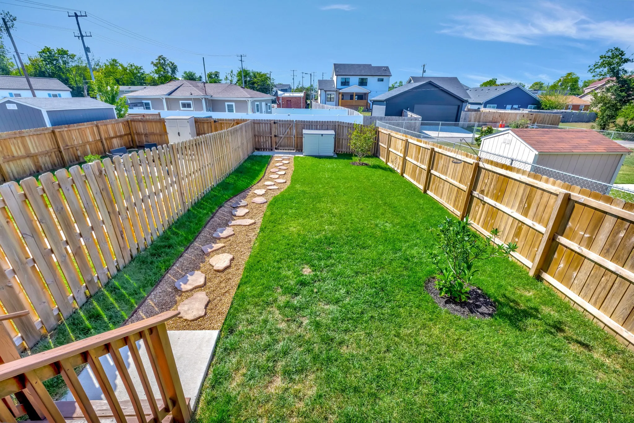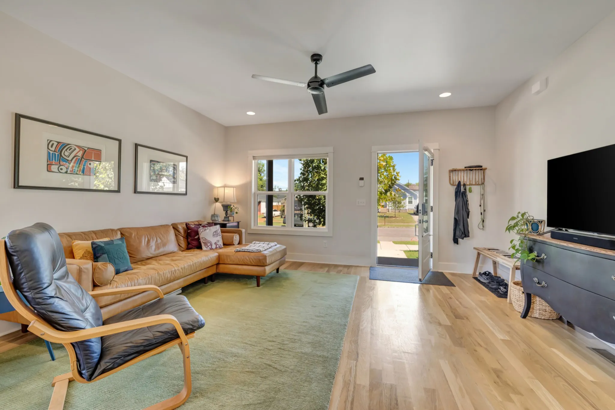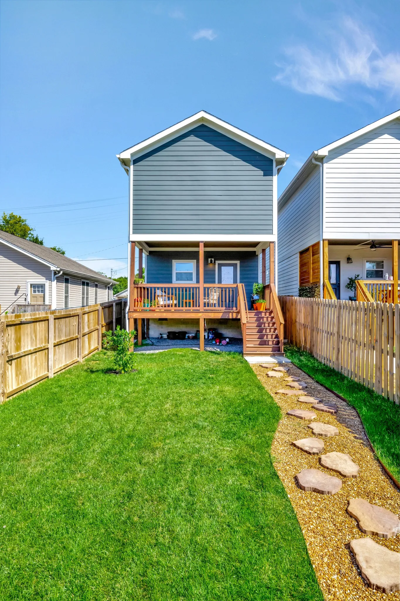 Newly built home in 2021 with an open floor plan and abundant light, custom interior design blinds, beautiful hardwood floors, craftsman tile work, ample storage, energy-efficient features, fenced-in backyard with lush green grass, and outdoor living space.