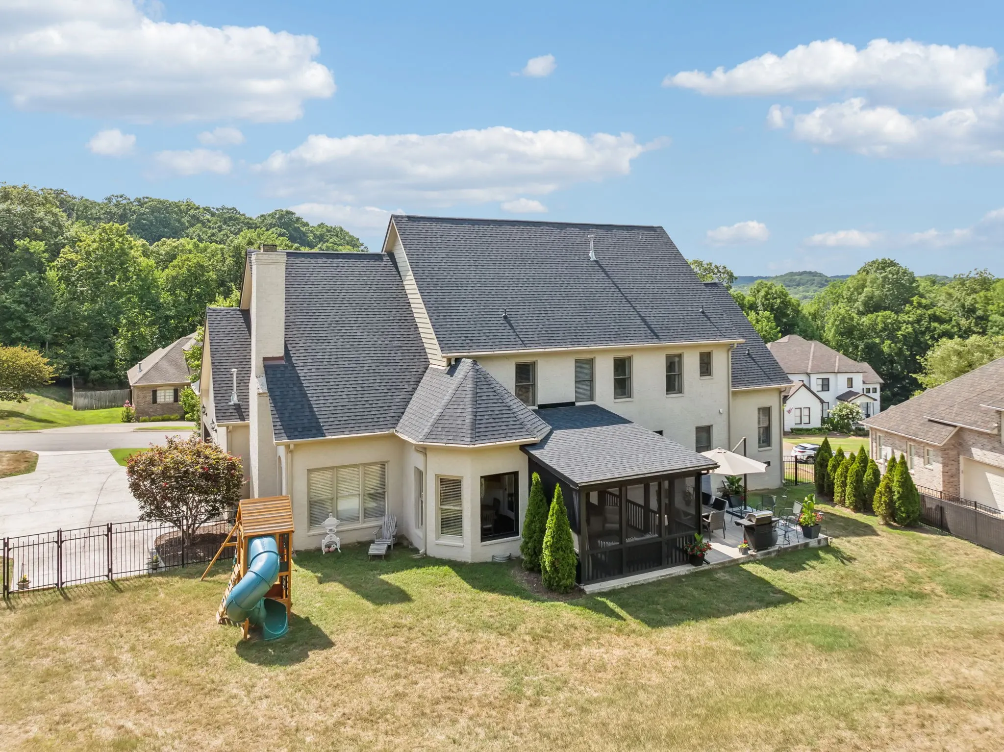 A Timeless Retreat in Temple Hills, a golf-course community. Elegance and designer touches blend seamlessly in this recently updated home. Enjoy the inviting screened-in porch with luxurious tile flooring, a beautifully designed patio, and a charming outdoor sitting area. The chef’s kitchen, adorned with white marble countertops, exudes sophistication and top-of-the-line appliances, including a Viking oven, JennAir induction cooktop, and Beko refrigerator. An inviting keeping room off the kitchen ensures everyone stays connected. The home’s flow, from living to dining, keeping room to kitchen, and out to the outdoor living spaces, makes it perfect for entertaining, while still offering cozy nooks for everyday living. Practical updates include two new HVAC units and a new roof. The fenced-in yard provides an extra layer of privacy and security. The property line extends into the treed area in the back. The versatile floor plan allows for office space, additional living areas.