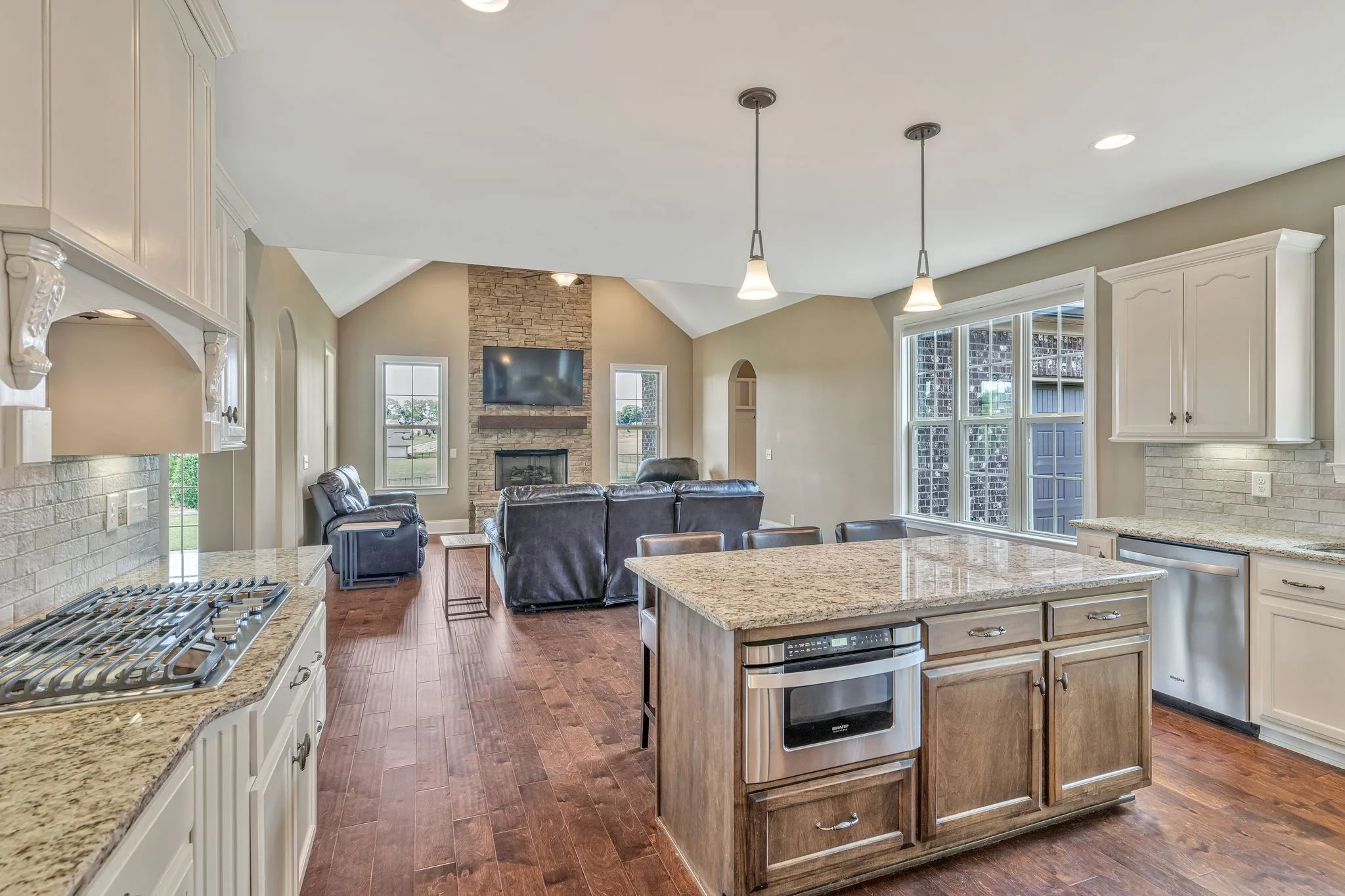 Like new home on 1 ACRE LOT! 80′ Front Yard. TONS OF UPGRADES – Double Oven, Microwave Drawer & 36″ Gas Cooktop, Granite, Tile Showers, Walk-in Attic Space, 8ft Doors, Wainscoting, Wood Shelving, Covered Porch w/Stone Fireplace