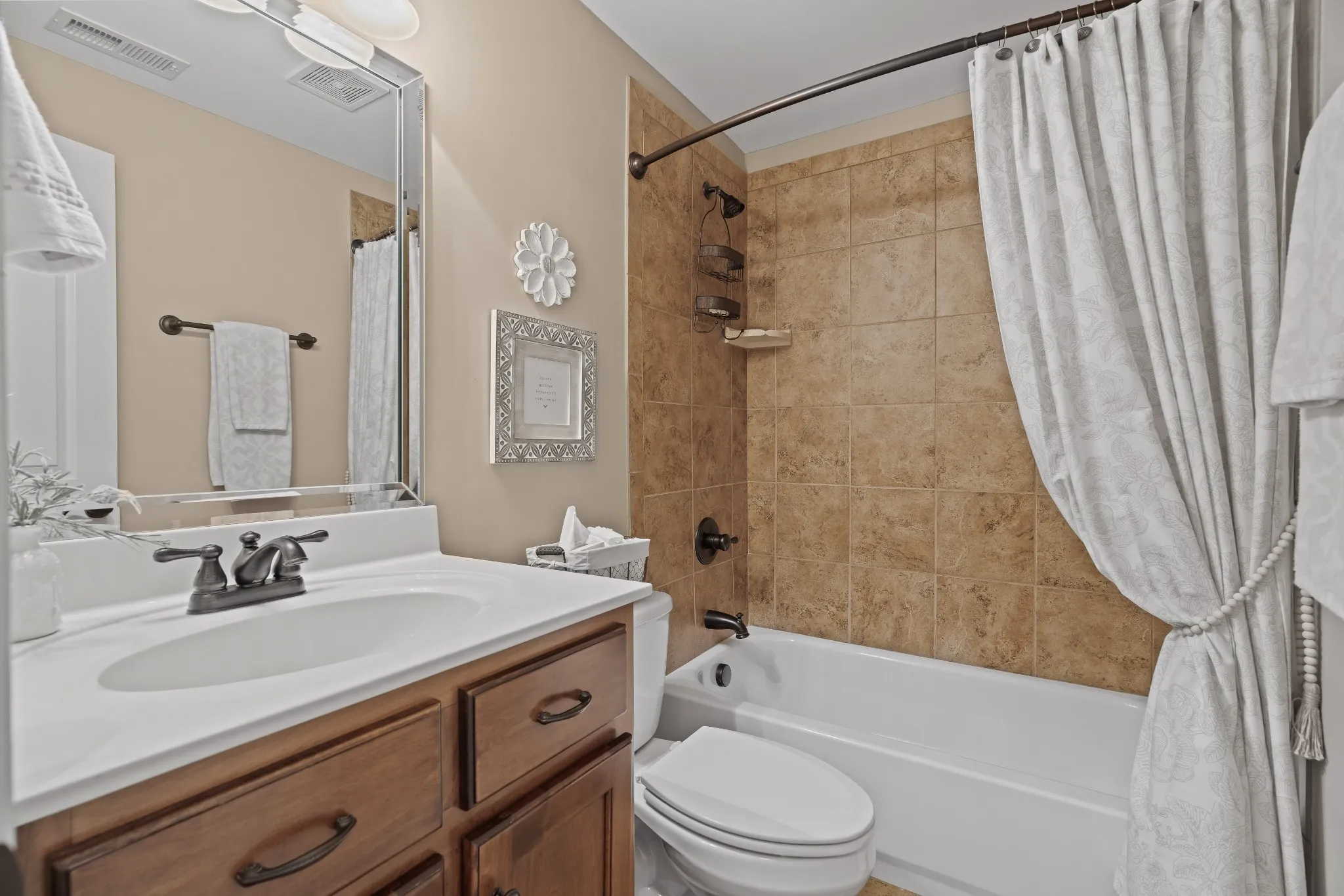 This beautiful and IMMACULATE home in the sought after Indian Ridge subdivision features 2 BD/2 BA downstairs (including primary), and 2 BD/1 BA upstairs with a loft room & bonus rm. Surround sound in bonus rm w/tons of storage on both sides. The open floor plan downstairs is perfect for entertaining, with a formal dining rm, family room, kitchen & breakfast nook. Granite counters and double oven. The primary bath has double vanities with a makeup counter, separate bath & shower & large walk-in closet. Beautiful back yard w/stone fire-pit area w/built-in seating & iron fence. Landscaping irrigation system & lights. New Roof (1 yr), HVAC units (4 & 6 yrs old), water heater (3yrs old). Pella storm door & front door w/triple dead bolt. Security system. All appliances to stay. Many pieces of furniture can be purchased. This home has been meticulously kept & maintained. Great location! Walk to nearby schools, while enjoying the convenience of nearby shopping centers and grocery stores.