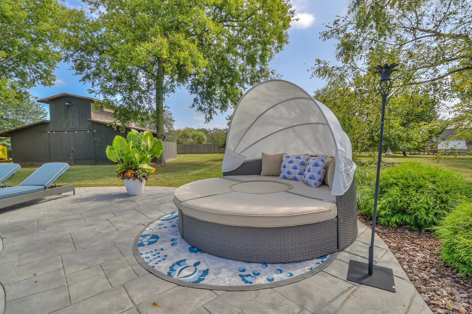 "LongDescription" => "View of the barn from the patio, has electric and water , an amazing workshop"