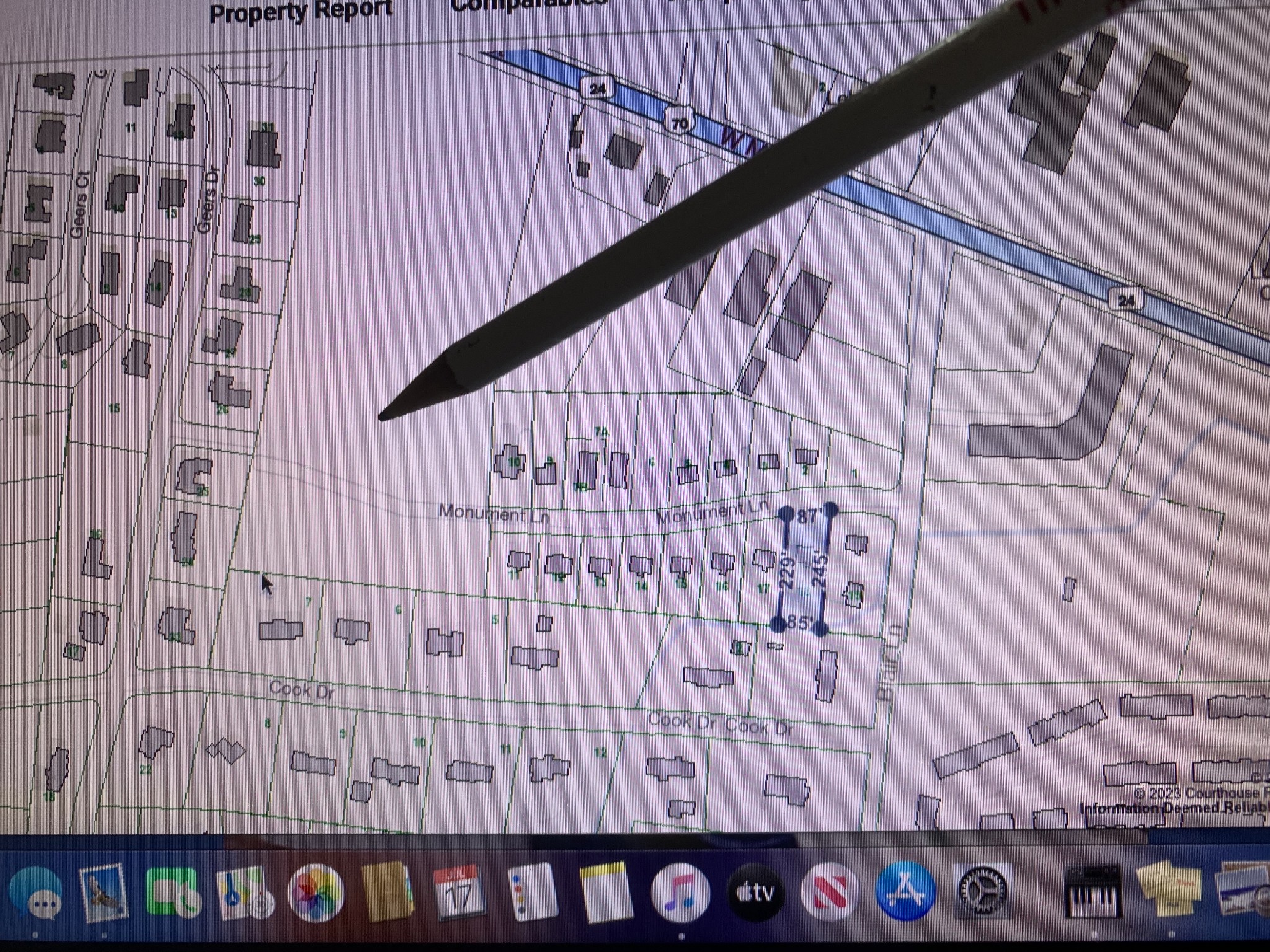 6.36 Acres in town sewer ,gas & water available. Property is accessed from Monument Lane or Geers Court