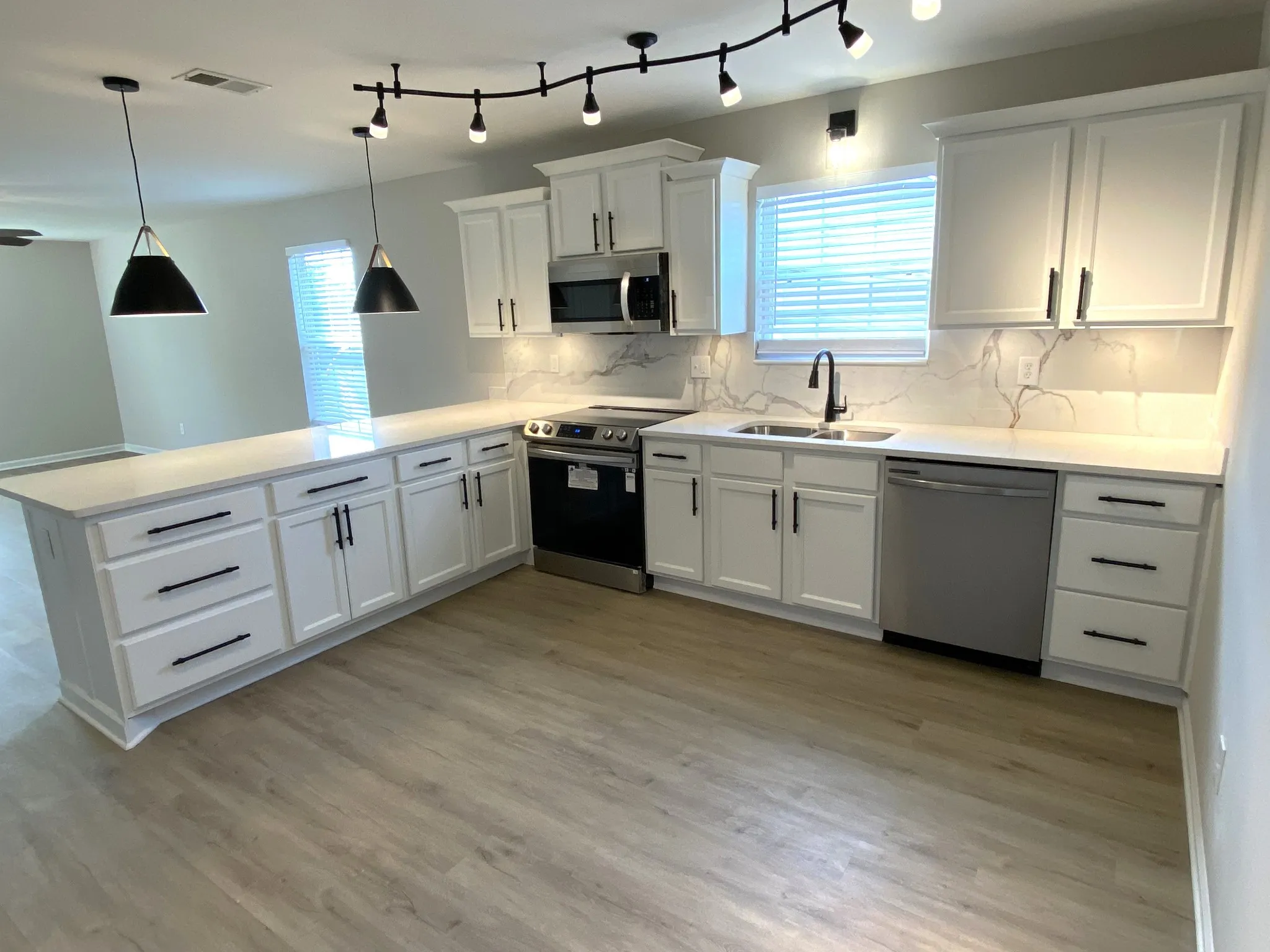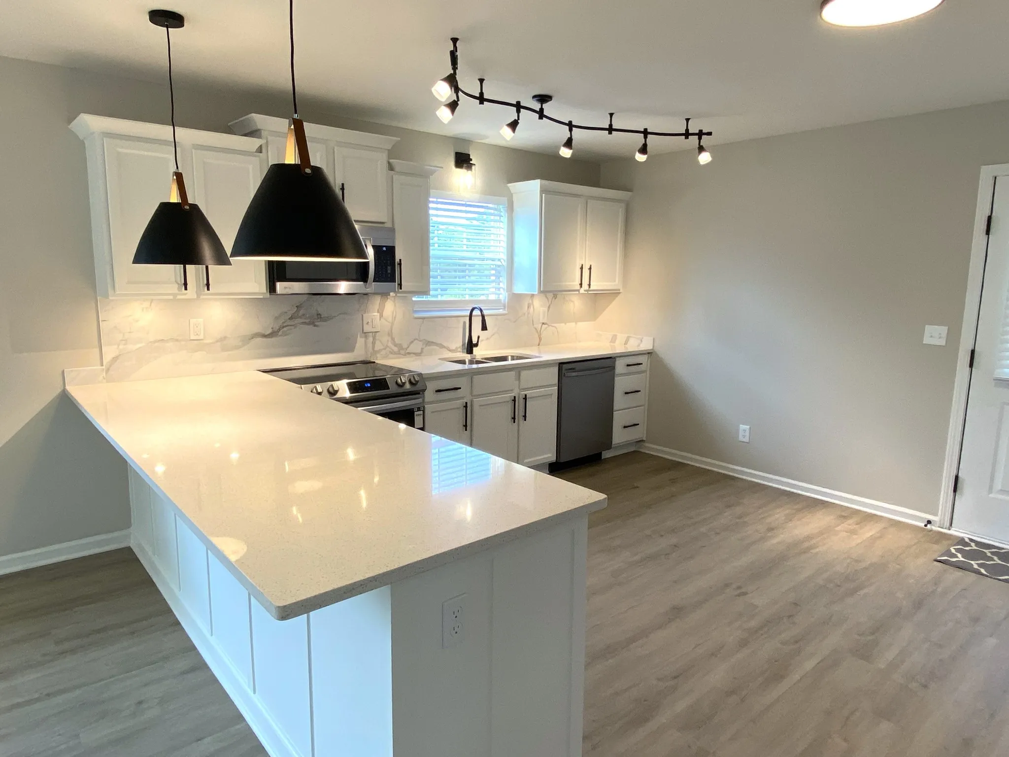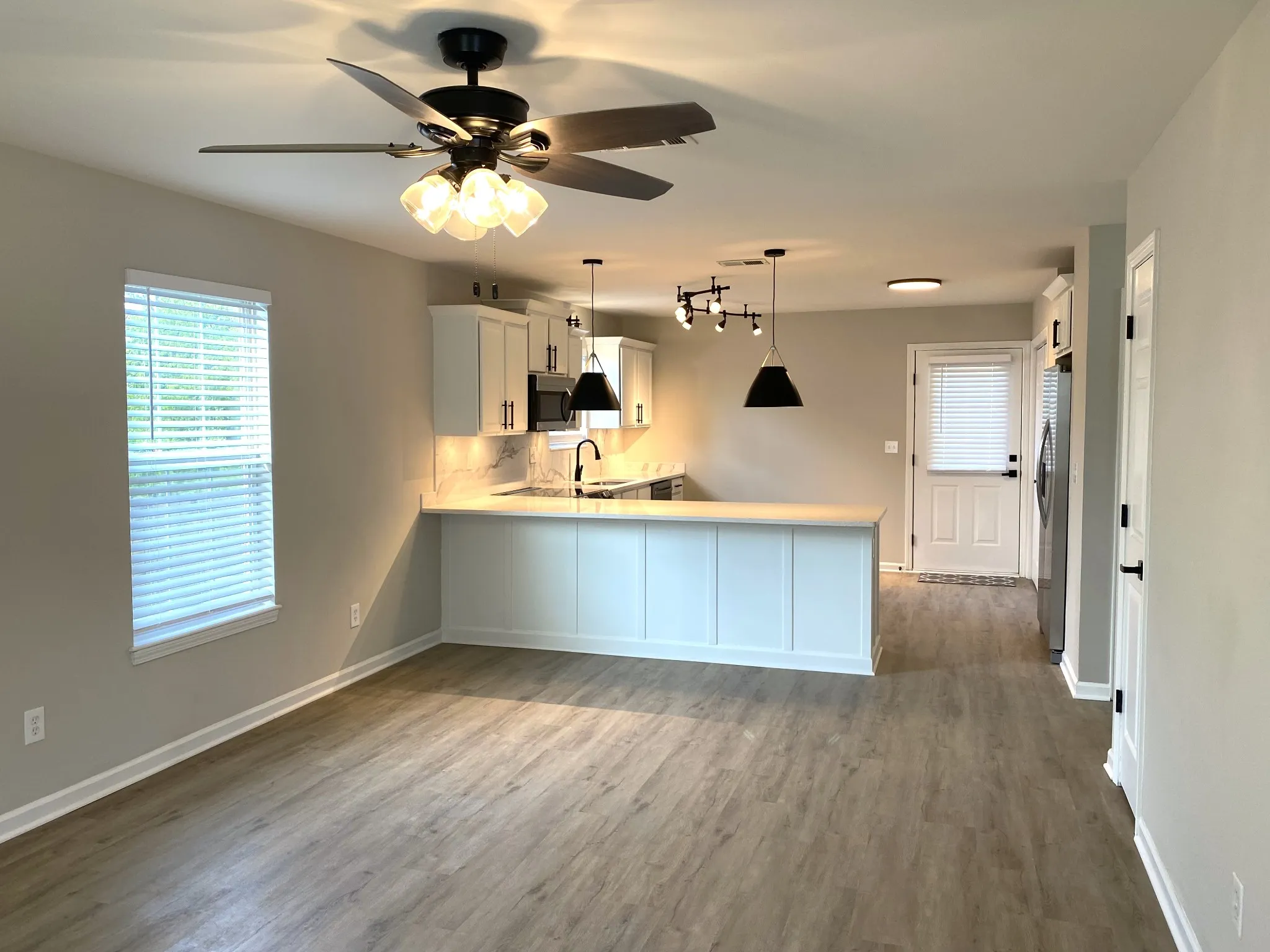 Beautiful move in ready home that has been completely renovated with new roof, gutters, all new flooring throughout, new lighting, kitchen cabinets with quartz countertops, new stainless appliances plus a fenced in back yard for privacy with utility building for storage.