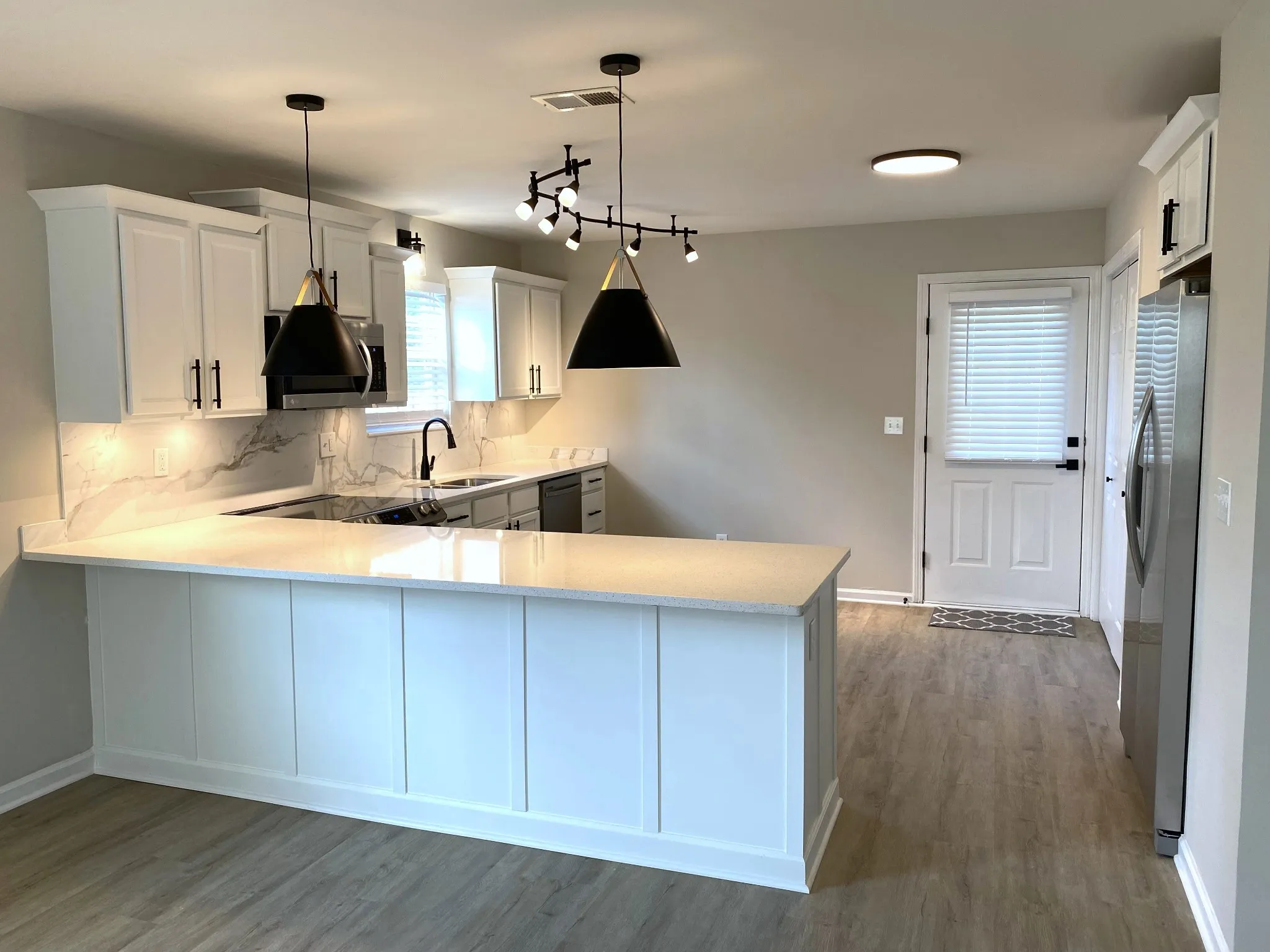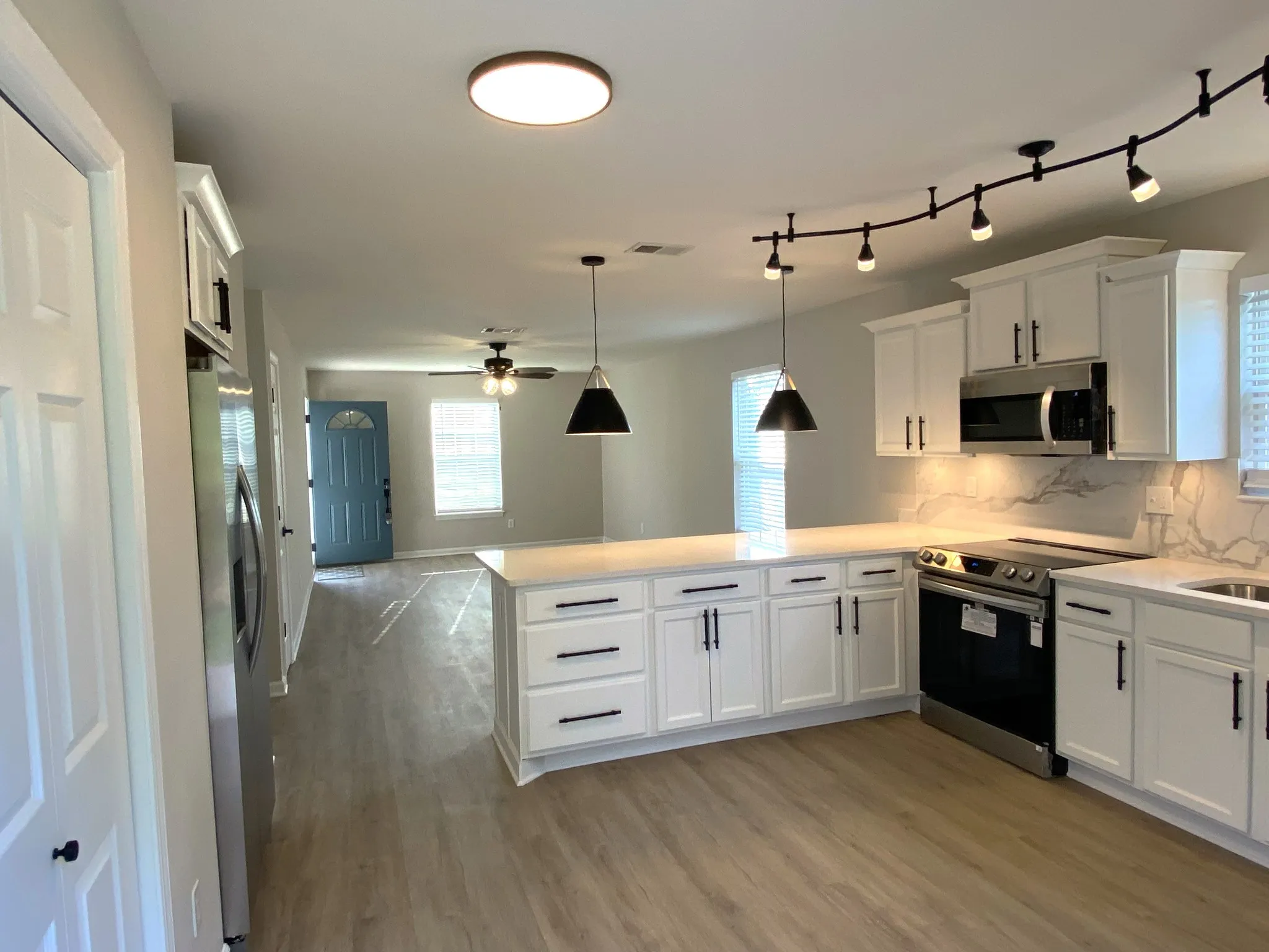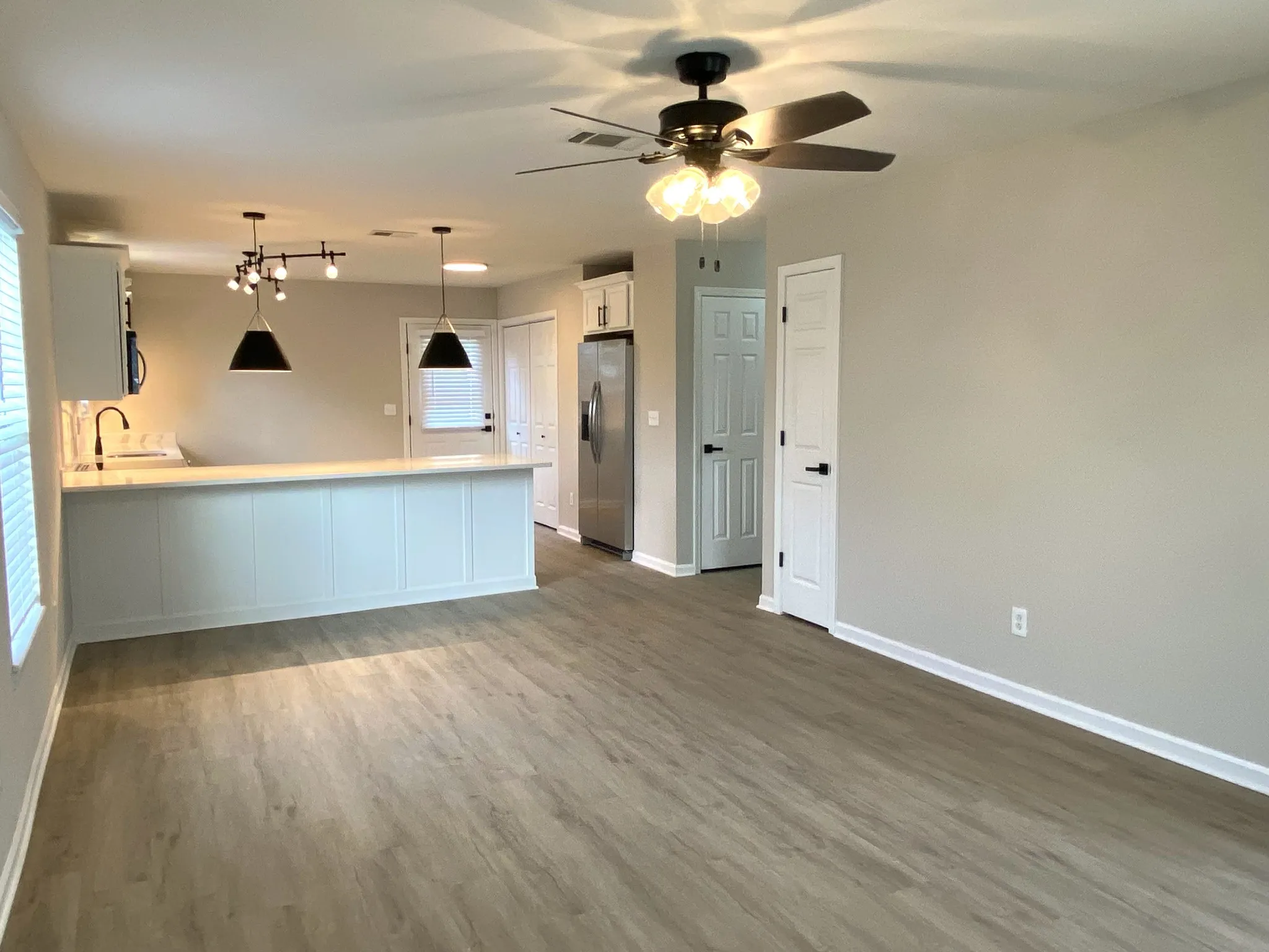 Beautiful move in ready home that has been completely renovated with new roof, gutters, all new flooring throughout, new lighting, kitchen cabinets with quartz countertops, new stainless appliances plus a fenced in back yard for privacy with utility building for storage.
