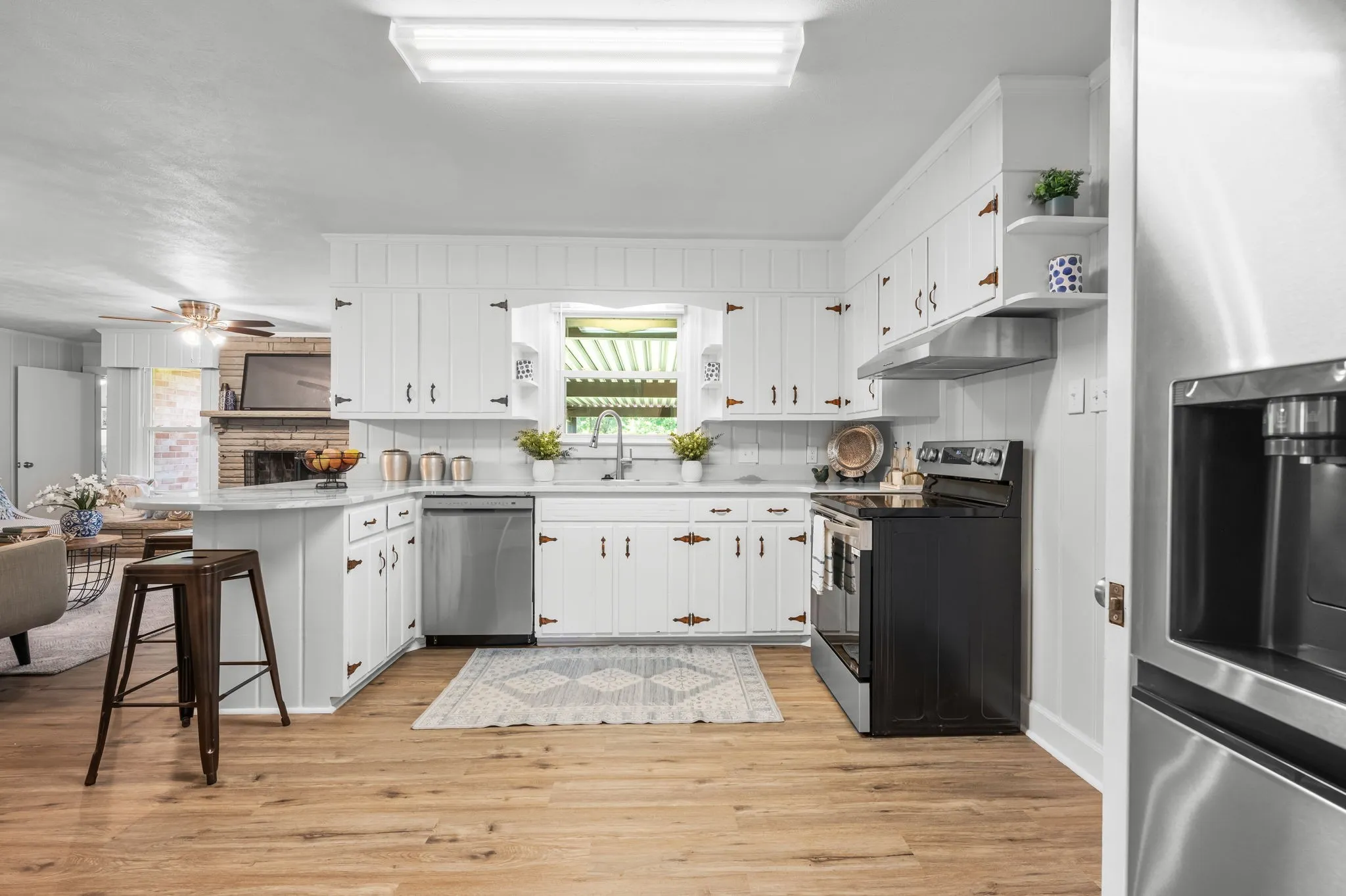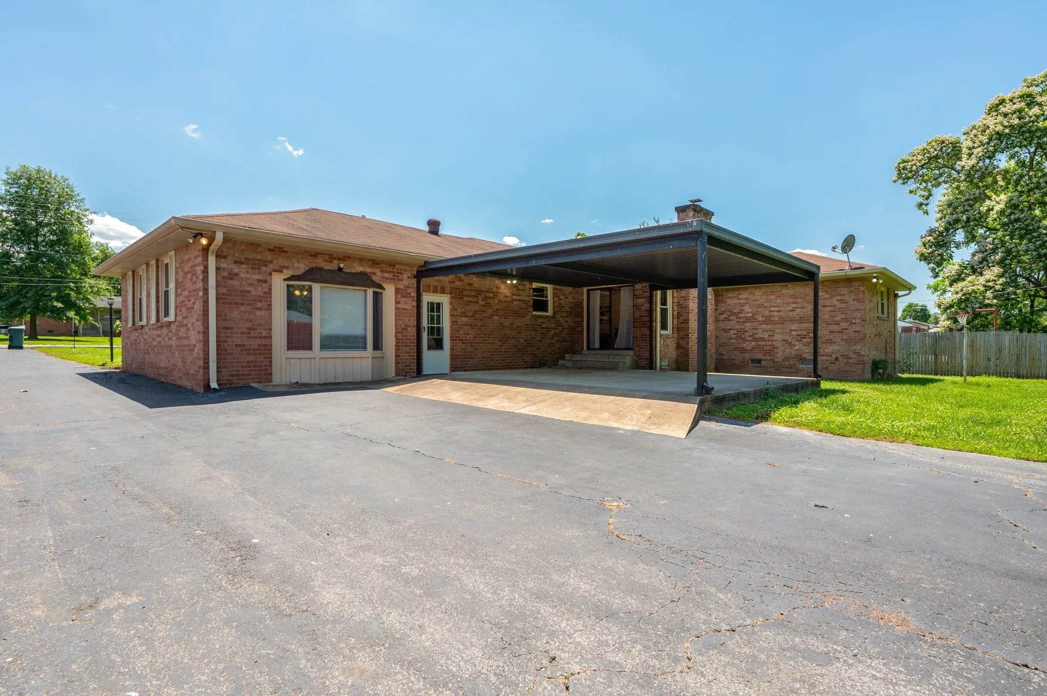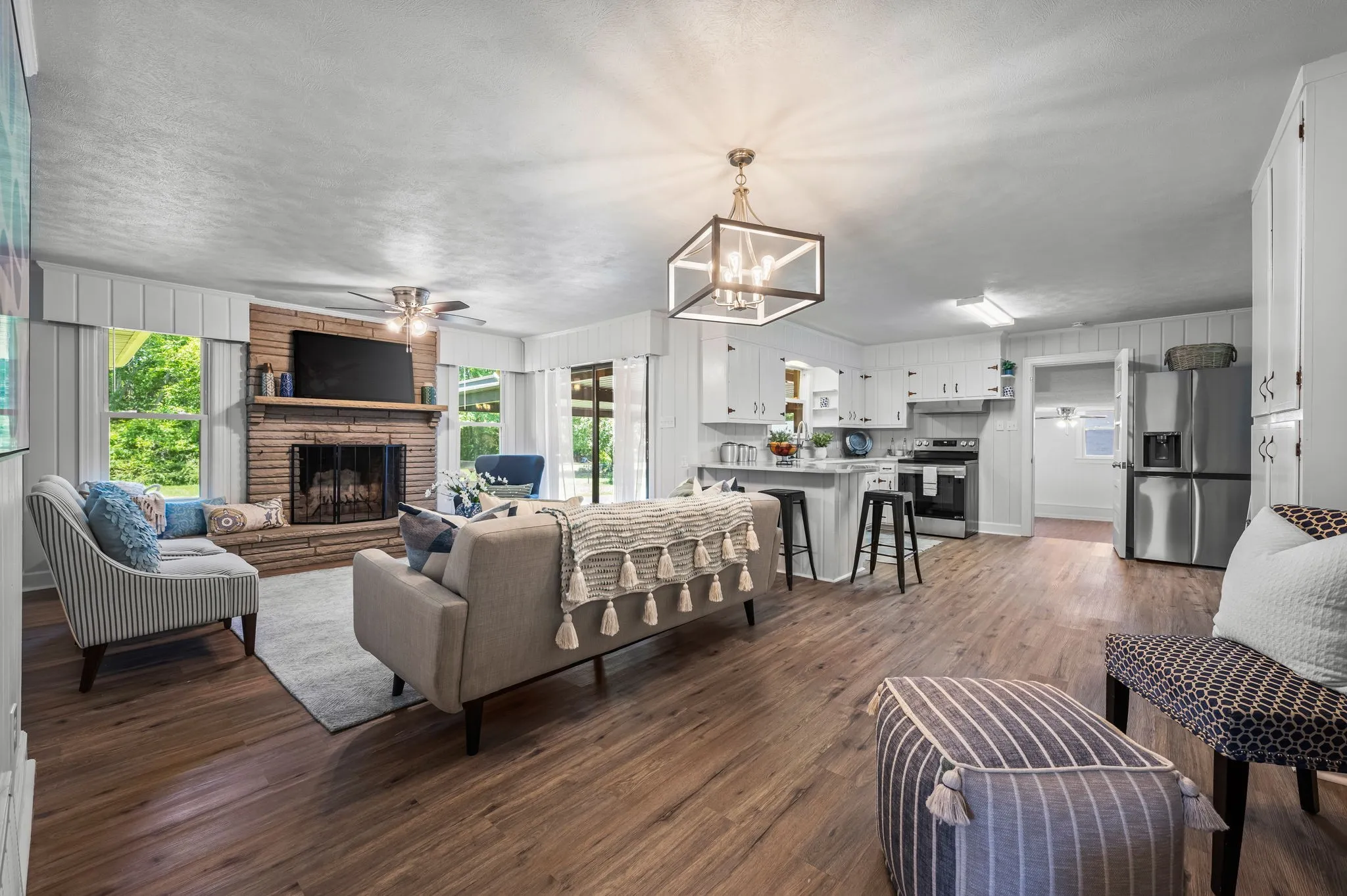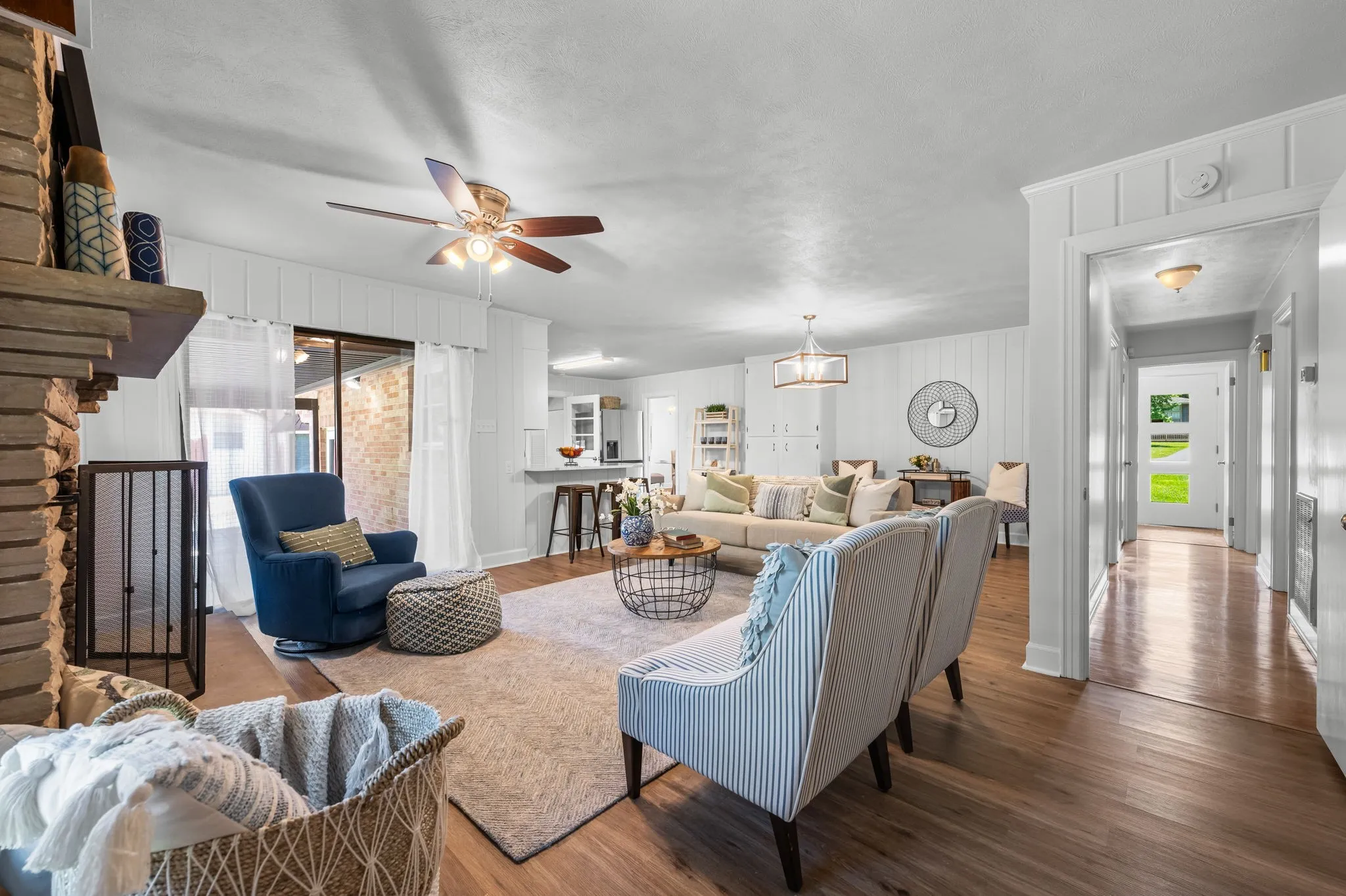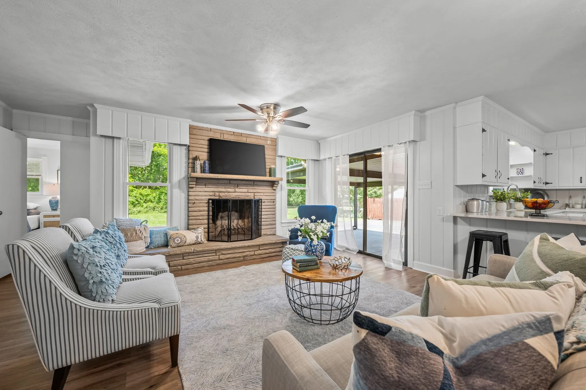 This 4-bedroom, 3-bath, 2352 sq ft brick home blends midcentury charm with modern updates. The single-level layout boasts gleaming hardwood floors, contemporary fixtures, and bright white paint throughout. A sunny front sitting room flows into the formal dining room, perfect for entertaining. The open living room and kitchen area features a cozy stone fireplace, painted wood paneling, and a breakfast bar with stainless steel appliances and ample cabinet storage. The master bedroom is a spacious retreat with a luxurious en-suite bathroom, including a double sink vanity and tiled tub/shower combo. An expansive bonus room off the kitchen can serve as a home office or second master suite, complete with a bay window and full bathroom. Outside, enjoy the large covered carport/patio for shaded parking or entertaining. The level, grassy backyard is perfect for pets or children to play. Conveniently located near shopping, schools, hospitals, and entertainment in Lebanon. Don’t miss this gem!