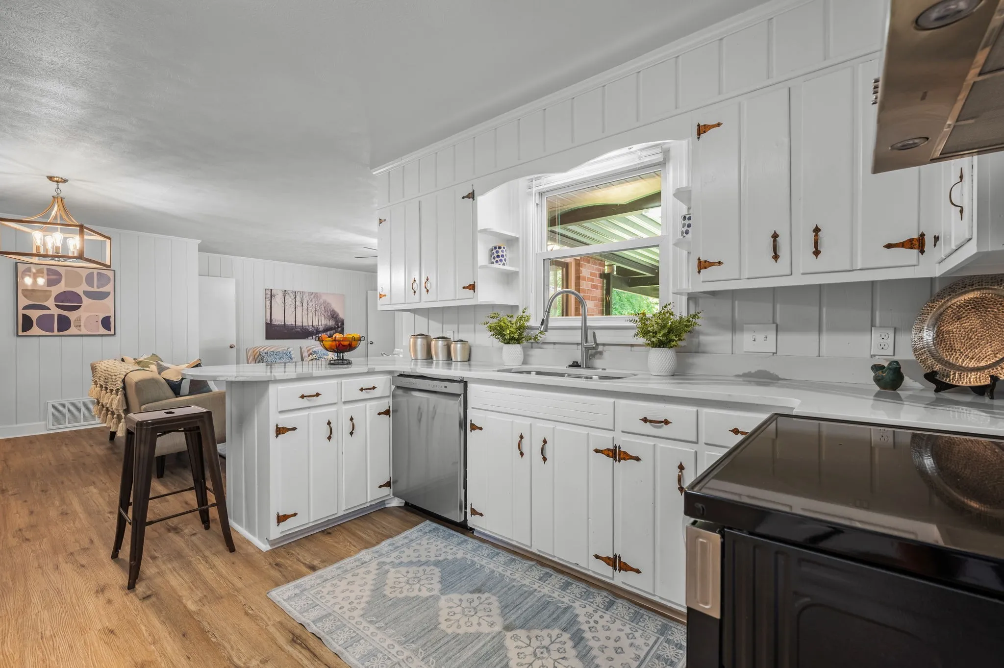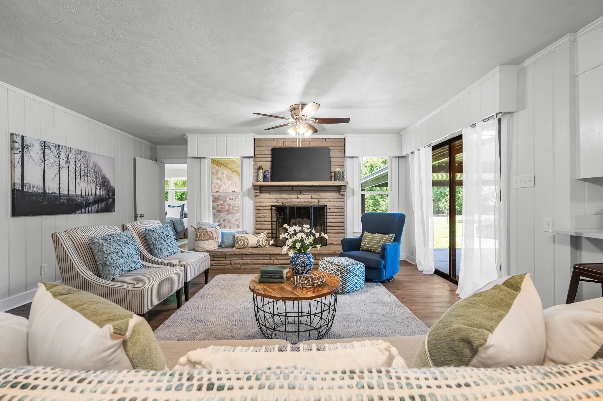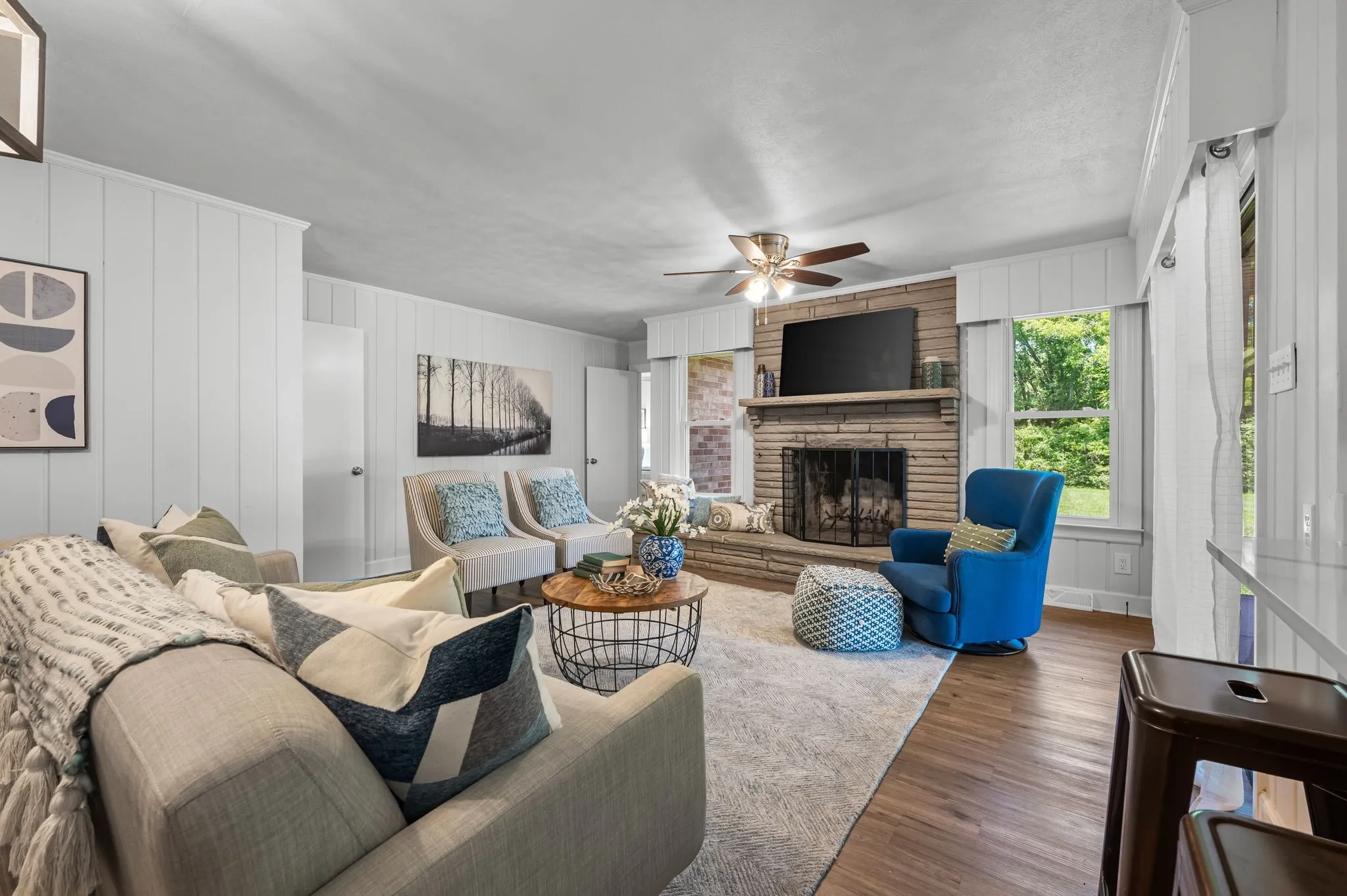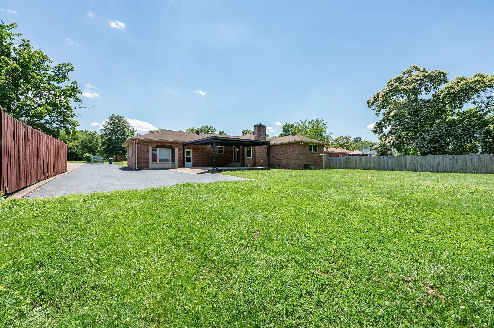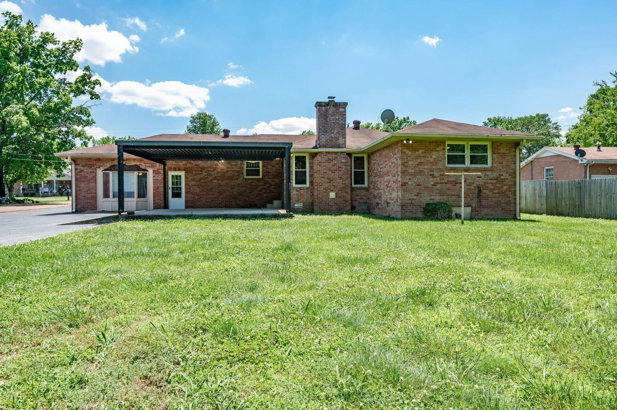 This 4-bedroom, 3-bath, 2352 sq ft brick home blends midcentury charm with modern updates. The single-level layout boasts gleaming hardwood floors, contemporary fixtures, and bright white paint throughout. A sunny front sitting room flows into the formal dining room, perfect for entertaining. The open living room and kitchen area features a cozy stone fireplace, painted wood paneling, and a breakfast bar with stainless steel appliances and ample cabinet storage. The master bedroom is a spacious retreat with a luxurious en-suite bathroom, including a double sink vanity and tiled tub/shower combo. An expansive bonus room off the kitchen can serve as a home office or second master suite, complete with a bay window and full bathroom. Outside, enjoy the large covered carport/patio for shaded parking or entertaining. The level, grassy backyard is perfect for pets or children to play. Conveniently located near shopping, schools, hospitals, and entertainment in Lebanon. Don’t miss this gem!