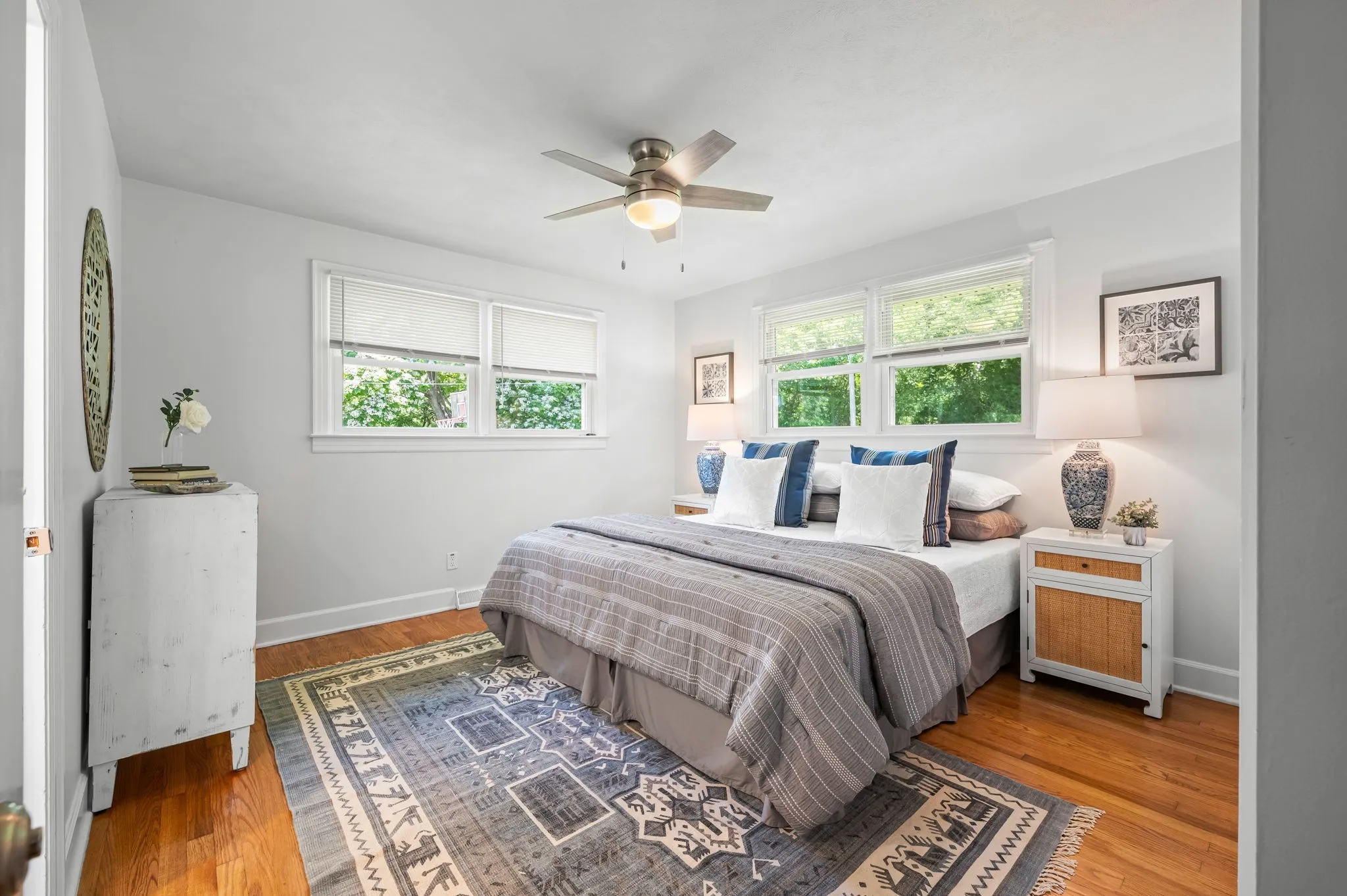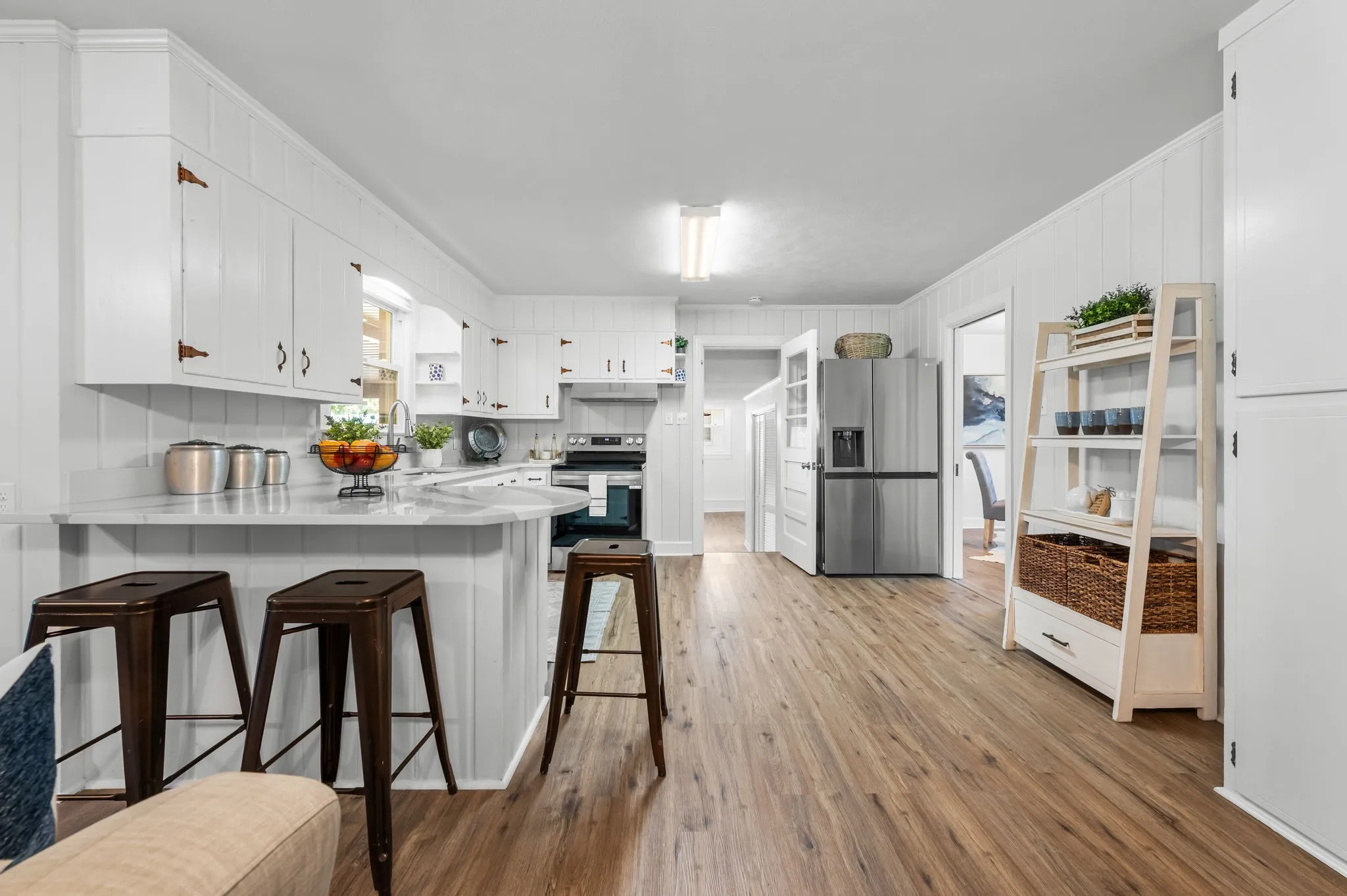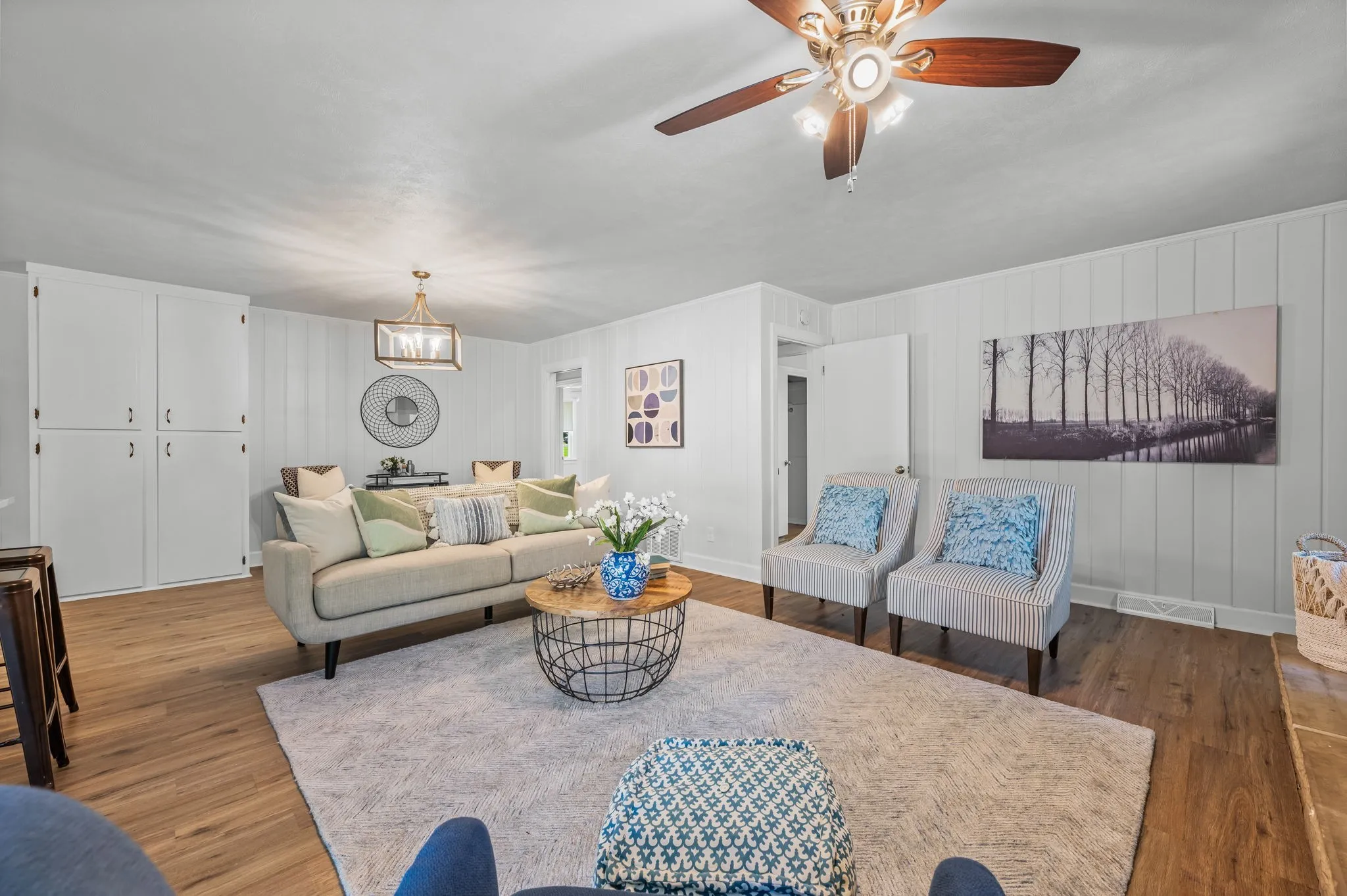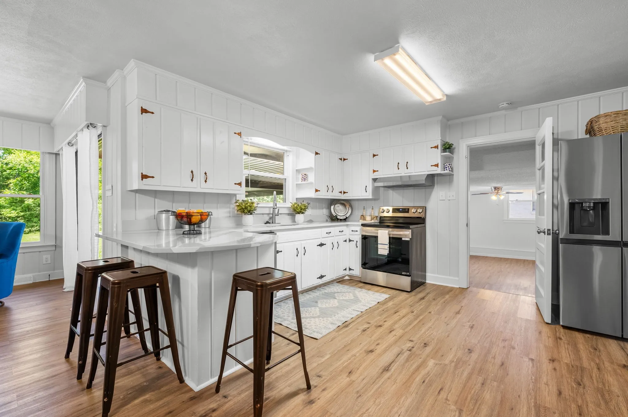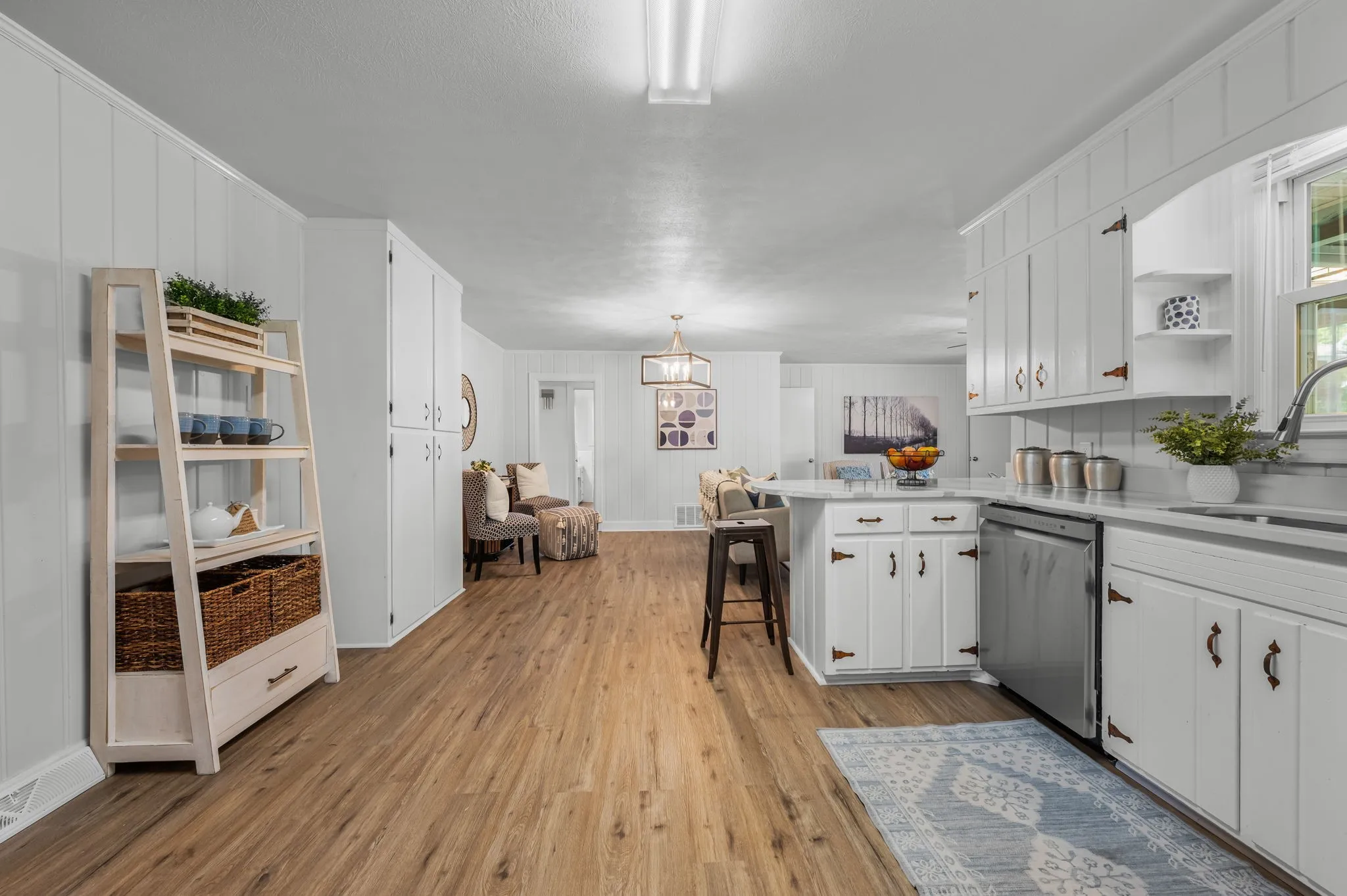 This 4-bedroom, 3-bath, 2352 sq ft brick home blends midcentury charm with modern updates. The single-level layout boasts gleaming hardwood floors, contemporary fixtures, and bright white paint throughout. A sunny front sitting room flows into the formal dining room, perfect for entertaining. The open living room and kitchen area features a cozy stone fireplace, painted wood paneling, and a breakfast bar with stainless steel appliances and ample cabinet storage. The master bedroom is a spacious retreat with a luxurious en-suite bathroom, including a double sink vanity and tiled tub/shower combo. An expansive bonus room off the kitchen can serve as a home office or second master suite, complete with a bay window and full bathroom. Outside, enjoy the large covered carport/patio for shaded parking or entertaining. The level, grassy backyard is perfect for pets or children to play. Conveniently located near shopping, schools, hospitals, and entertainment in Lebanon. Don’t miss this gem!